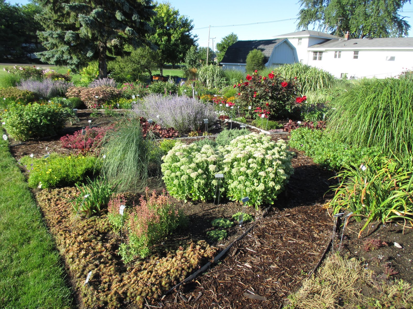 It was a day full of sunshine, plants and gardens. I did get a rewarding “plant fix” on my first day of three in Michigan where I plan to visit many gardens and see as many plants as possible. I started the day at Walters Gardens, Inc. today and had a great visit with Hans Hansen who is a very well known, young breeder there. Hans can be seen in the second photo down with one of his many introductions: Hibiscus ‘Perfect Storm’. I enjoyed the trial gardens as well. My older daughter is along for the trip and enjoys seeing plants too! We next went to Mast Young Plants in Grand Rapids, MI which has an awesome trial garden (see below). I had visited many years ago and was equally impressed with their displays today. Prior to arriving here though, I did a presentation via phone on butterfly gardening for a UW-Extension update. Interesting way to present from my car with laptop and phone! After Mast Young Plants, we then headed to Frederik Meijer Gardens & Sculpture Park for a fun visit and to stretch our legs. We enjoyed the children’s garden, new Japanese garden and conservatories for sure. The last two destinations were on the campus of Michigan State University in East Lansing. The 4H Childrens Garden was as spectacular as always and the extensive 14 acre trials around that portion of campus were heavily photographed by me as well. Tired and getting ready for day #2 (posting tomorrow night too).