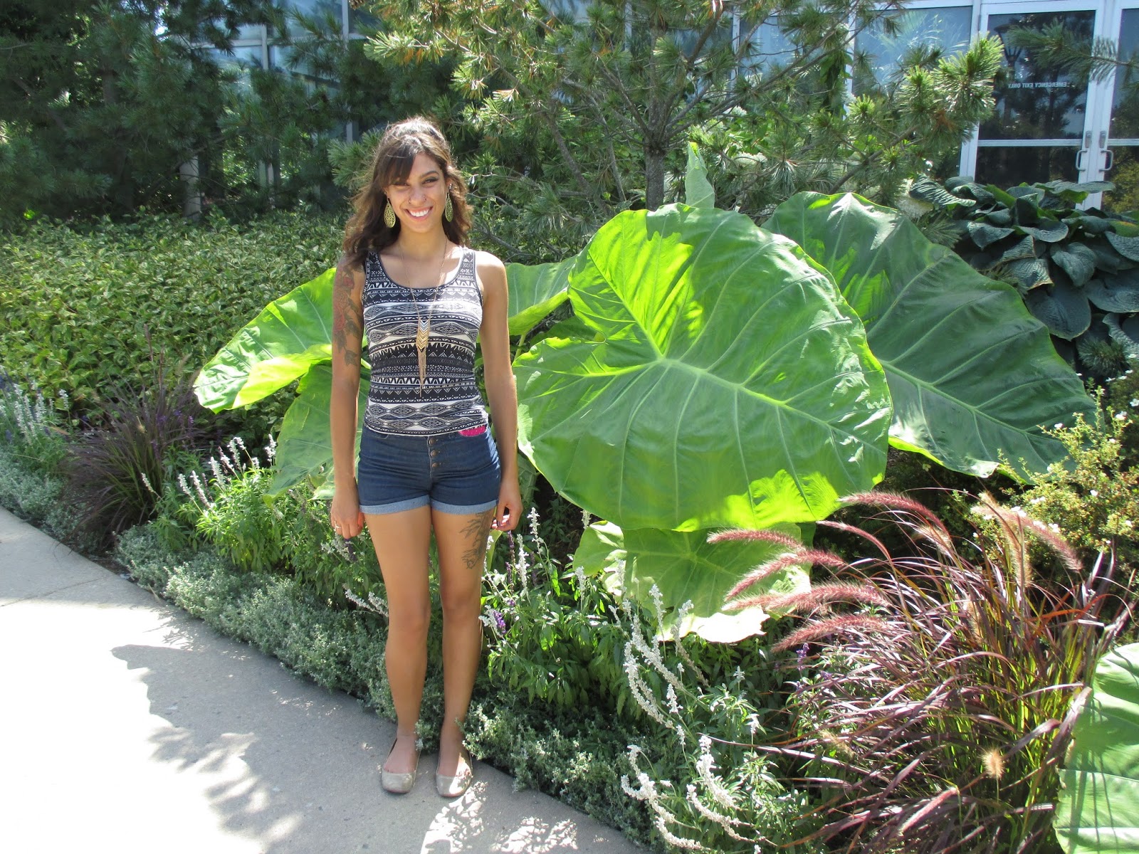 daughter with Colocasia gigantea ‘Thailand Giant’ at Frederik Meijer Gardens & Sculpture Park