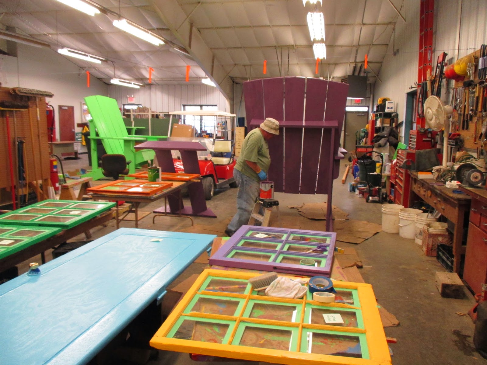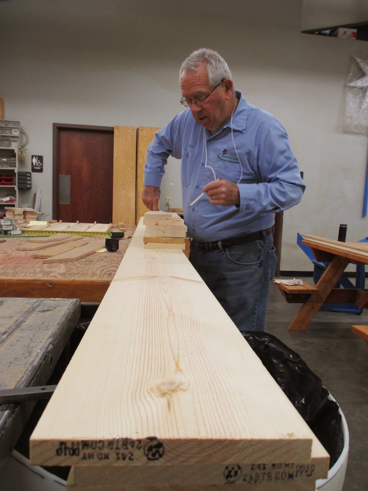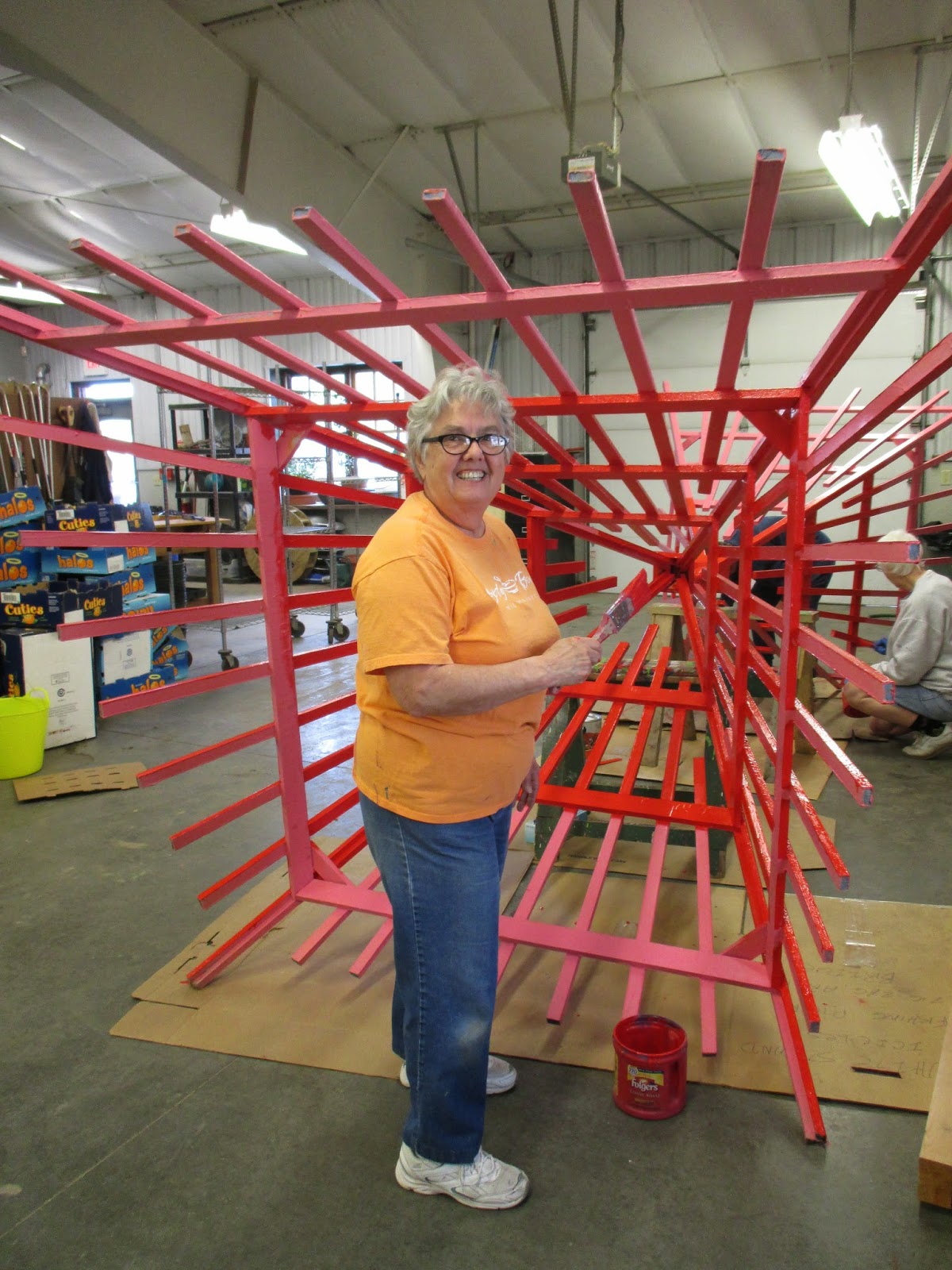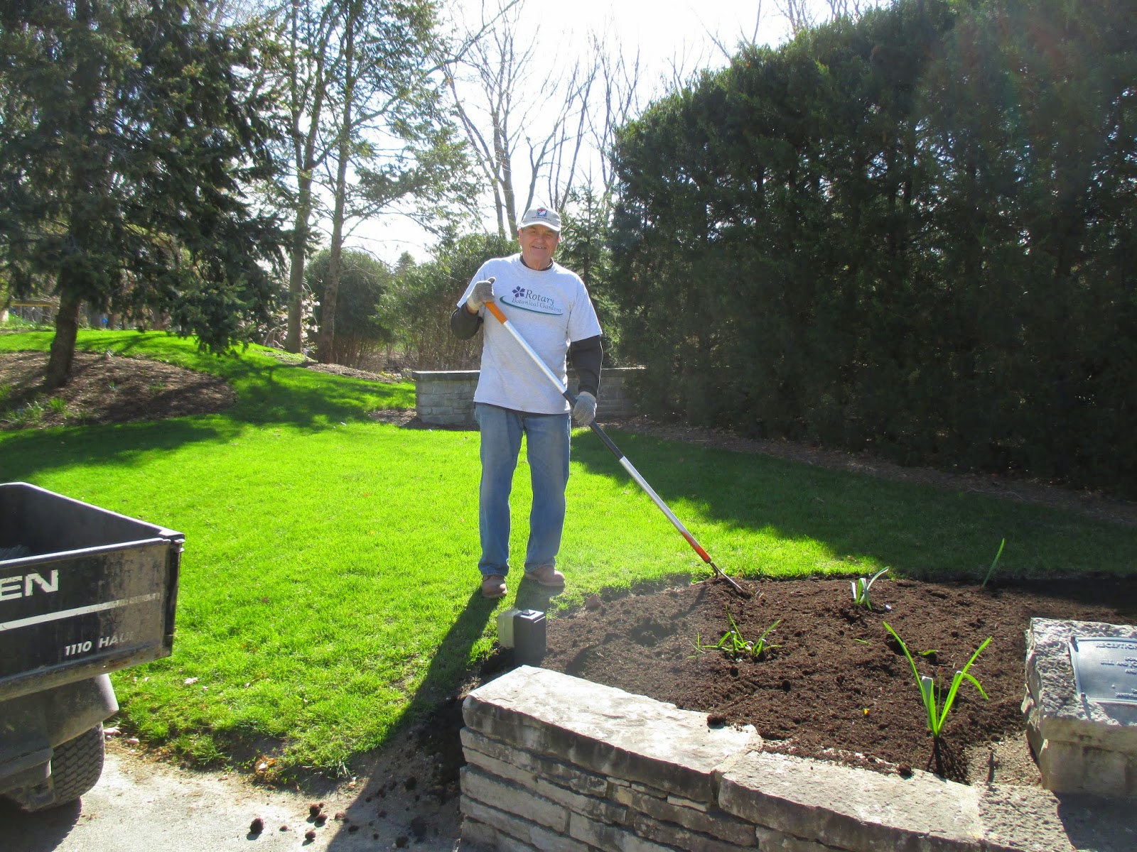 What an amazing group of volunteers today. Where to start!? I hope I don’t miss anyone. Gary (above) was our painting guru this morning and was later joined by Gena, Myrt and Nancy (9th and 10th photos down) who started on our entrance garden pyramids (conversion from 2014 pink to 2015 red!). Vern (below) worked on various carpentry projects with Dave, Ron Y. and Bob K. The second photo down shows Alan (left) and Ron P. loading mulch for their arboretum project which involves weeding/edging all the tree circles and then applying fresh mulch. The third photo down shows Sandy, Peg, Kathy and Bonnie. This mulching quartet did a great job in the gazebo garden and Big John was hard pressed to keep up with delivering mulch for them! Mary Ann G. (fourth photo down) worked in the Thomas Jefferson Collection which she also assisted with in 2014. The fifth photo down shows Bob C. composting and along with Lloyd, Ron R. (sixth photo down) and Larry H. (not photogenic today), the guys composted some major areas and did a dynamite job. Rollie (seventh photo down) mowed as did Dr. Gredler. Doc also worked on some turf repair. Dick H. hauled loads to the dump and worked on cutting/bending new plant label stakes. Pat M. (eighth photo down) got his giant obelisk up with some help and is seen here getting it secured. Hal and Doris (11th photo down) did a nice job in their area and both Joan and Corky were in to work on the front planting bed at the Horticulture Center (weeding and rototilling). The Chestnut House volunteers (12th photo down) did a great job planting up tropical bulbs and headed out in the gardens for some work as well. There were twelve helpers in this group and Janice helped get them going on their projects. We also saw Maury (errands), Cheryl D., Leigh D., Dr. Yahr and many others!