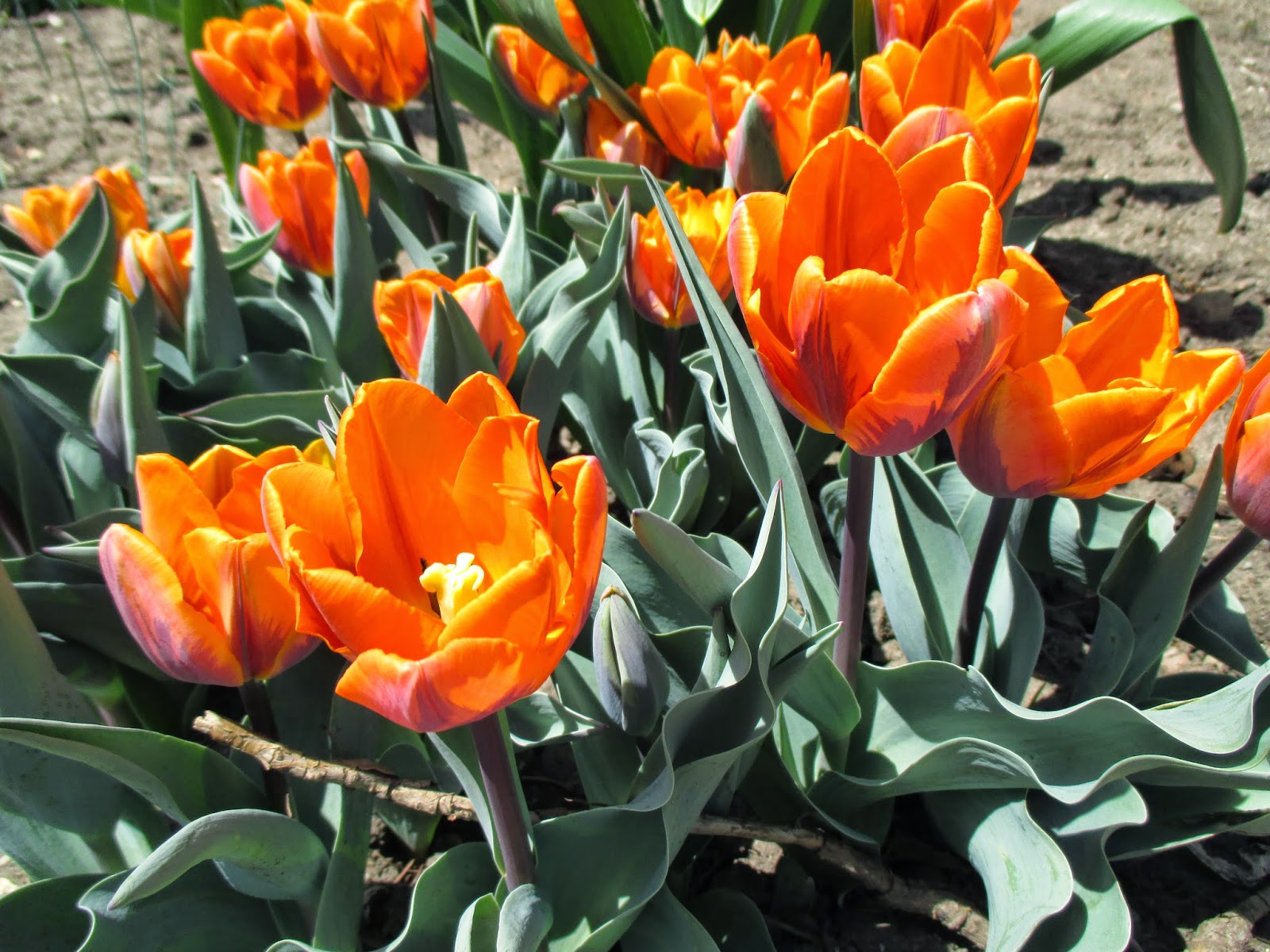 Today continued the trend of sunny days with temperatures around 60 degrees F. The breeze was a bit chilly but refreshing. We had a HUGE turnout of volunteers today and I bet we saw 40 different volunteers throughout the day. The Grumpy and Grumpette population was impressive but we also had other volunteers helping in lots of different capacities. Lots of gardening was accomplished as were myriad indoor tasks like painting and carpentry. With the Spring Plant Sale coming up in a week or so, our duties will shift towards the preparation and facilitation of that event next week. We’ll still have our Pansy/Compost Sale this Saturday (8 am until 12 noon) but will be focusing on our own planting very shortly after the plant sale. We have been doing some minor planting recently (today included) but will be doing it “in earnest” very shortly. Color abounds out in the gardens like that of the ‘Prinses Irene’ (correct spelling!) tulips (Tulipa) seen above. The 3,000 tulips in front of the Parker Education Center should be at peak in a week or so with a strong representation of orange.