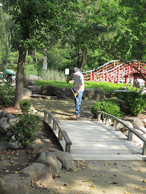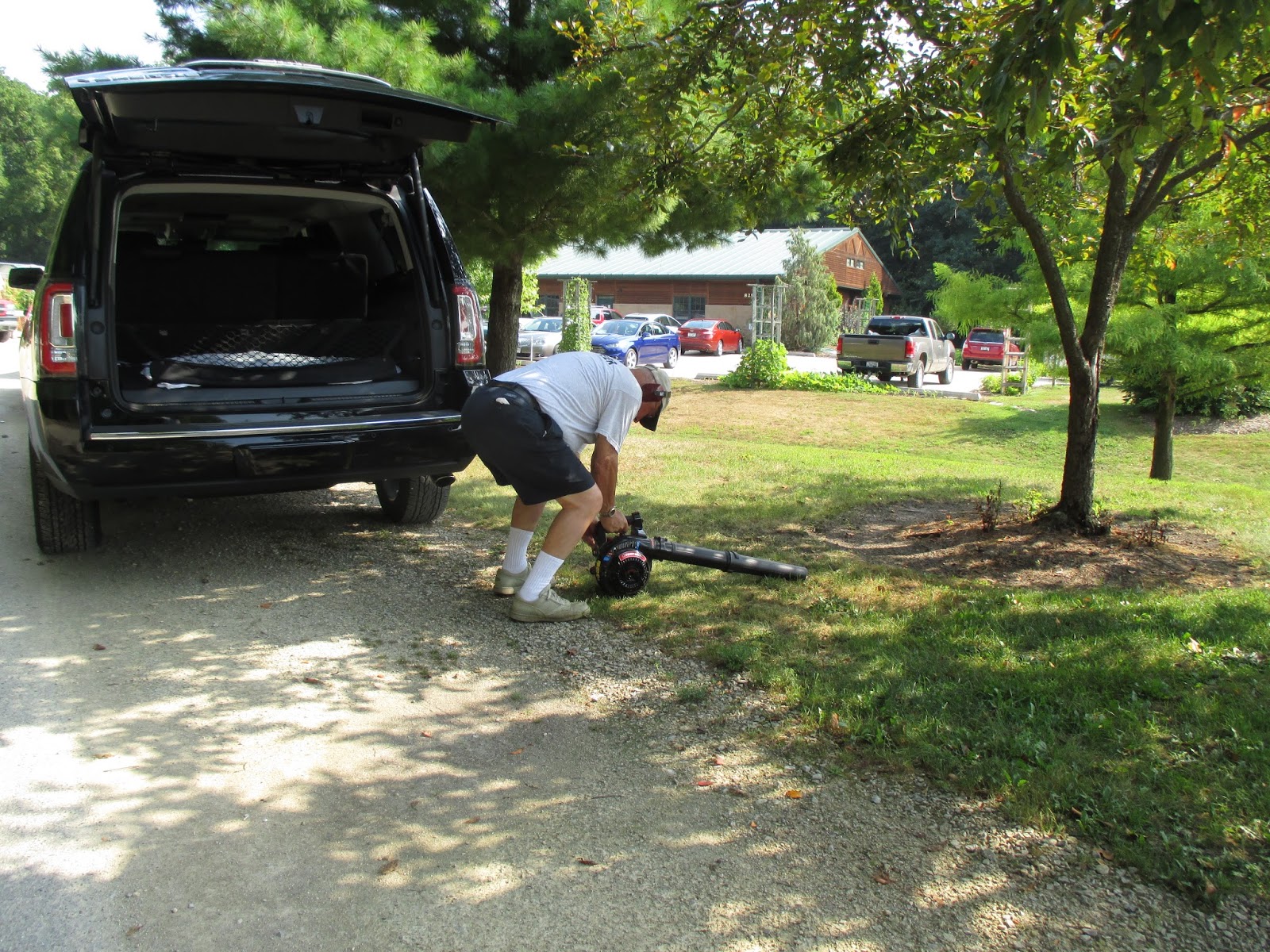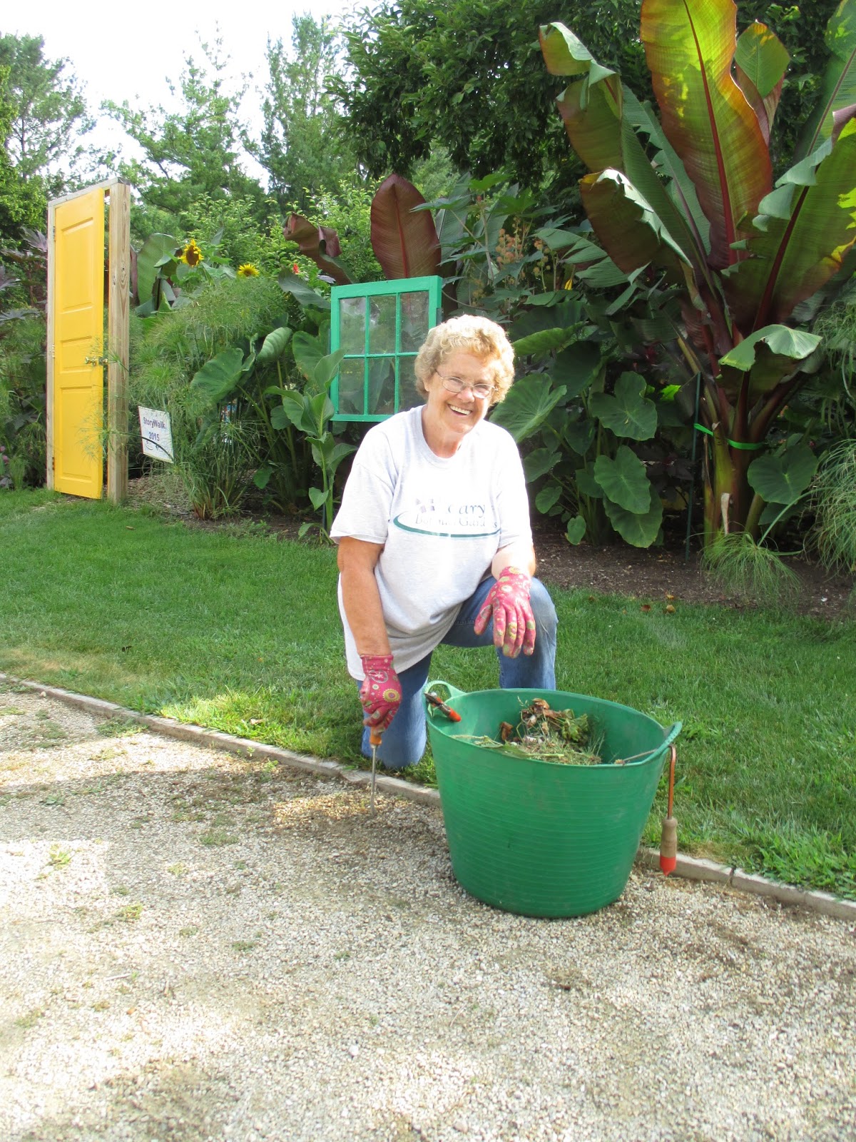 Our volunteers are as tough as ever and dealing with this recent heat is no small task! Above are Eva (driving) and Kathy on their way out to the formal gardens for some serious tidying. They were later joined by Mary D. and this trio was quite successful in that space. Kathy can also be seen in the second photo down. Jenny wasn’t far away tidying in the hosta hollow garden which is her assigned garden space. Below (left to right) are Dick H., Alan and Larry H. The guys were shifting around plants in the yard today to make more room for tables and ultimately the tents we’ll be putting up for the Fall Plant Sale (September 12-13, 9 am – 4 pm). All three guys shifted to other duties including sweeping, weeding and painting! See Larry H. in the third photo down. Dr. Gredler and Rollie (fourth photo down) did their mowing rounds. Ed was out touching up the edging on some beds and our industrious carpenters included Ron Y., Dave, Jim and Vern today. Maury ran out for gas and other errands and Gary worked on more labels and went out to water a lot of trees that could use a drink! The fifth photo down shows our summer intern Molly (affectionately known as “Jimmy”) out in the Pea Patch Garden. She finishes up this week then heads back to St. Norbert College. Marsha helped with some clerical tasks and we saw many others today as well.