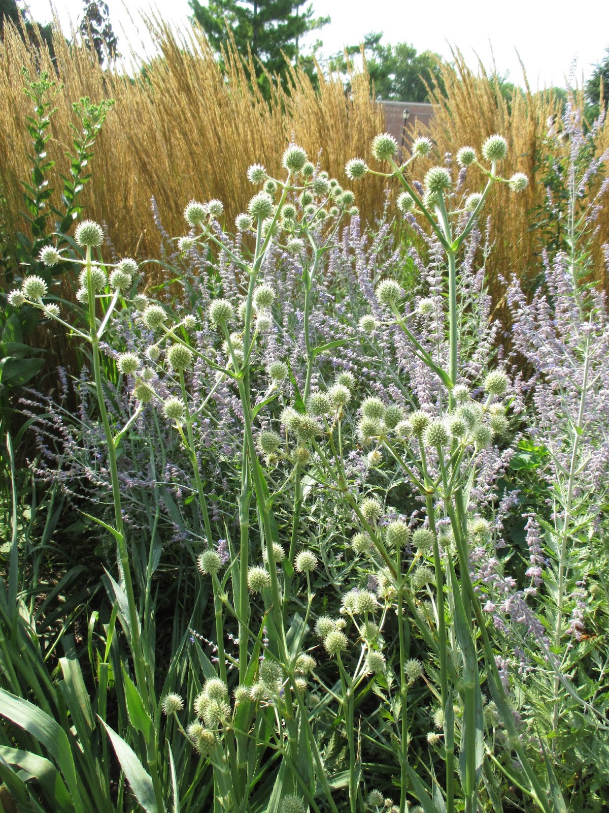 A tinge of fall coloration can be seen on the Tiger Eyes sumac (Rhus typhina ‘Bailtiger’) above! This coloration can start early (and end up a brilliant orange/red) but despite the very hot days, the cooler nights harken to the incoming fall weather! Some rain sure would be nice and it looks like we have a chance over the coming three days or so. Bring it on. We’ve had some crippling water line problems recently which have created severe challenges for watering that we hope Mother Nature will soon alleviate. While we have some grounds staff away from work and our summer boys (Nolan and Trevor) are gone, the recently confirmed help of Larry H. and Bob K. will be invaluable for our staffing needs. We had a solid volunteer turnout as well today with most volunteers taking advantage of the “cooler” morning!