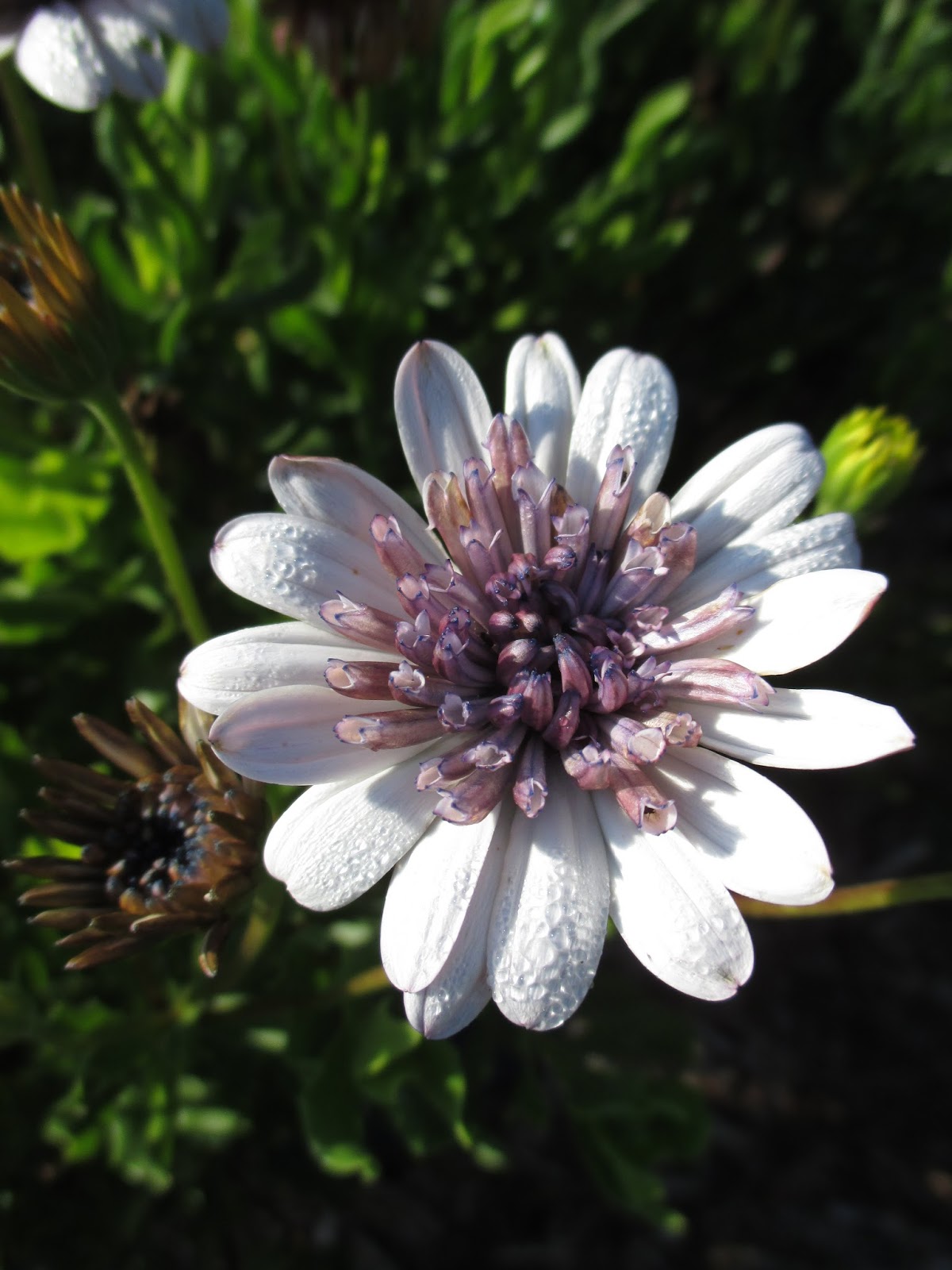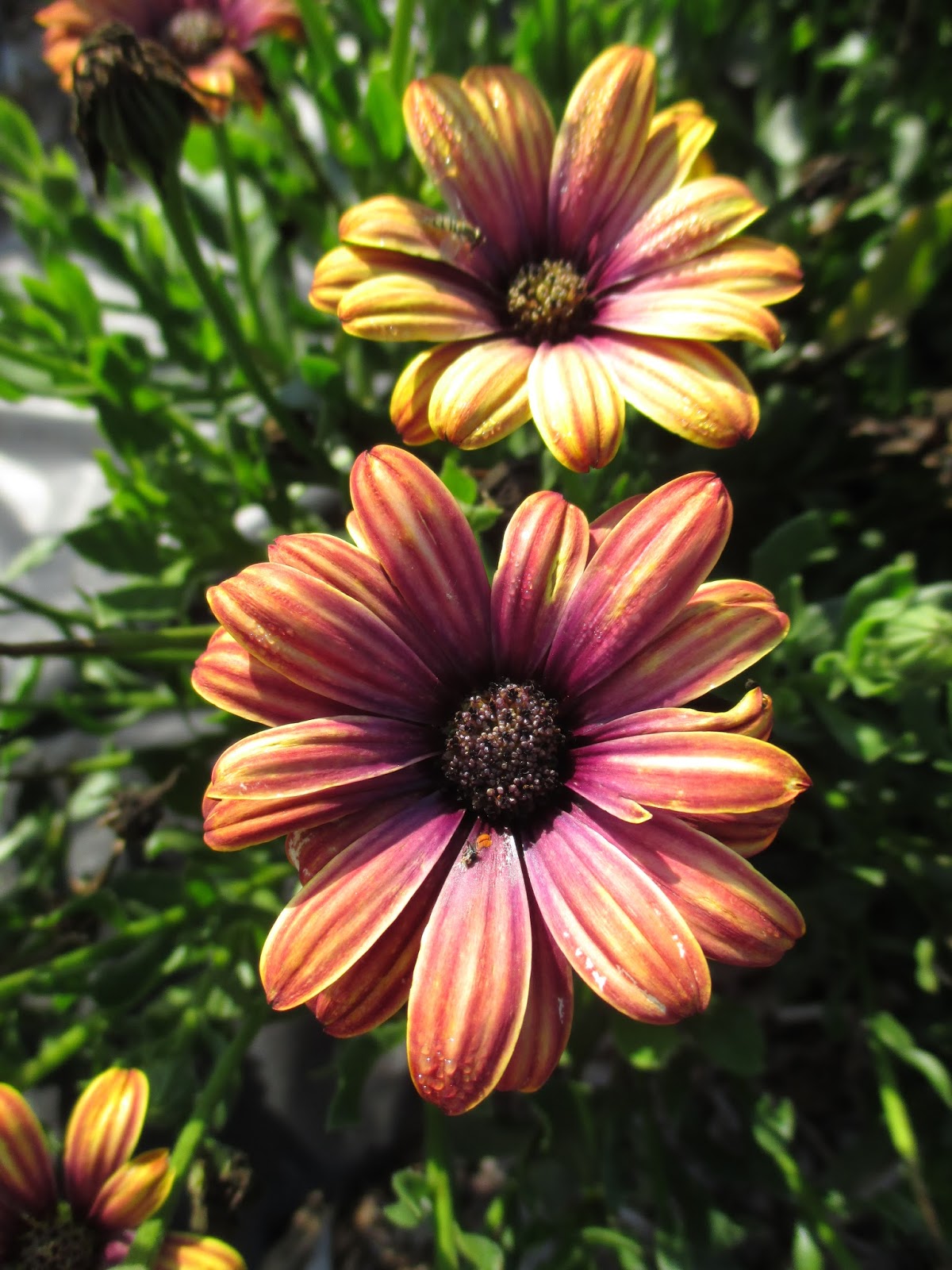 I love the look of African daisies (Osteospermum ecklonis) which thrive in full sun situations. Above is the picturesque ‘Astra Purple Spoon’! Native to Africa, these plants are not hardy for us and are considered an annual. We’ve come to realize that African daisies require significant attention to maximize their “duration of appeal.” Definitely position them in full sun and they will also thrive in containers. Adequate water and well drained soils are important too. While African daisies are promoted as being tolerant of tougher soils, you’ll have more flowers on a fuller plant with good soils and frequent (weekly) fertilizing. Remove (deadhead) spent blossoms as well to encourage more buds to form. If you have the time to dedicate a little more TLC to your Osteospermum selections, the rewards are amazing as seen in these photos (all of which were taken in mid July this year).