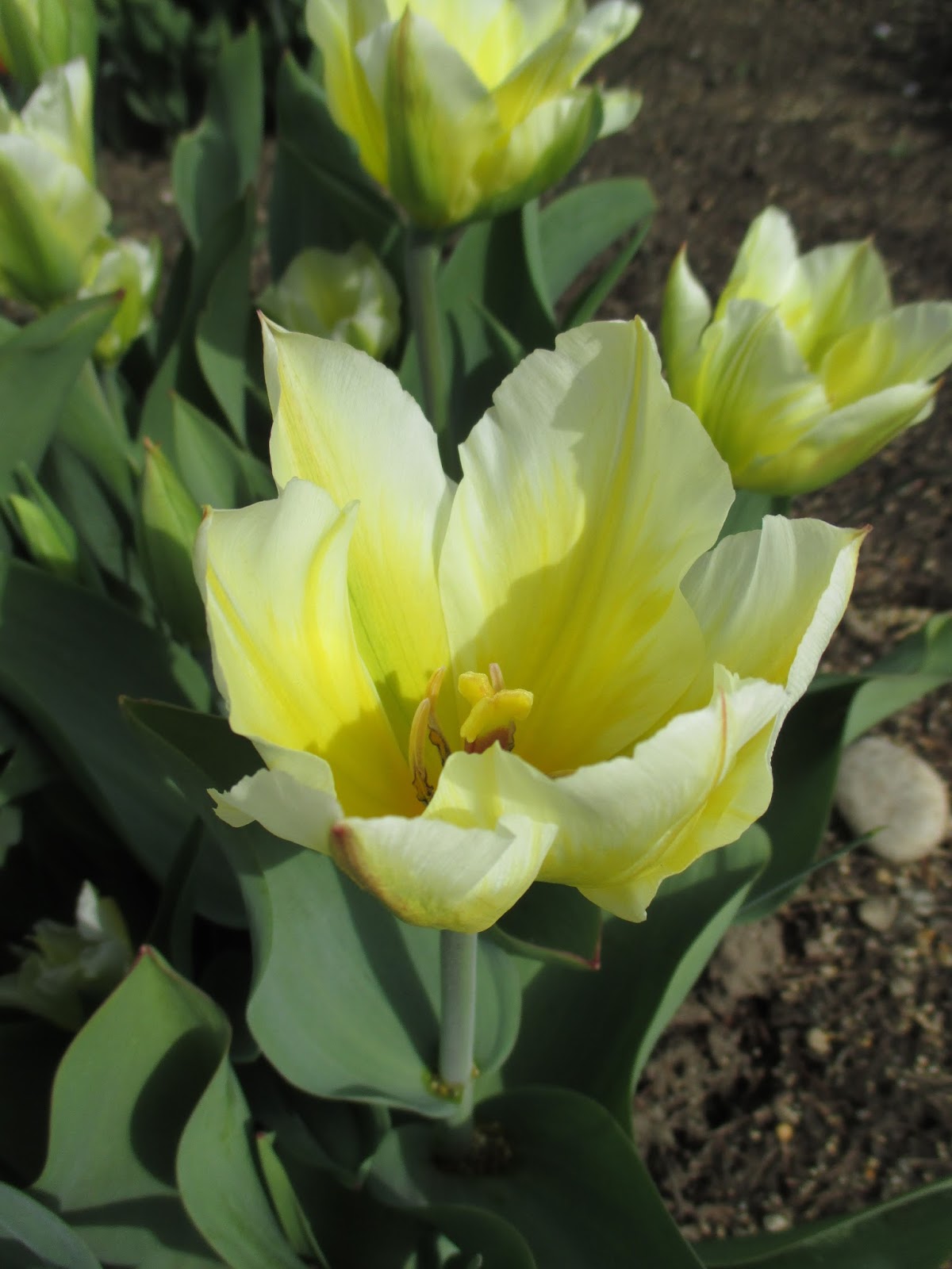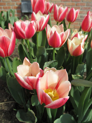 It appears that we’ll have rain later tonight and were rewarded with another partly sunny day! The Virginia bluebells (Mertensia virginica) above were very happy with the day and responded accordingly by starting to open up beautifully. We had an excellent day out in the gardens and also saw quite a few visitors as well. April isn’t a bad month to enjoy early color which also is starting up in front of the Parker Education Center with our first 10 of 100 varieties of tulips (Tulipa) showing color. Each variety has 25 bulbs for a nice “bouquet effect.” Further below are some exciting shots of some of these neat varieties. The warm weather will push all of these varieties to bloom sooner so I wouldn’t mind some days around 60 degrees F to slow things down for our traditional Mother’s Day timing! Don’t forget to look at our website regarding the Earth Day activities this Saturday as well as details on the Compost & Pansy Sale!