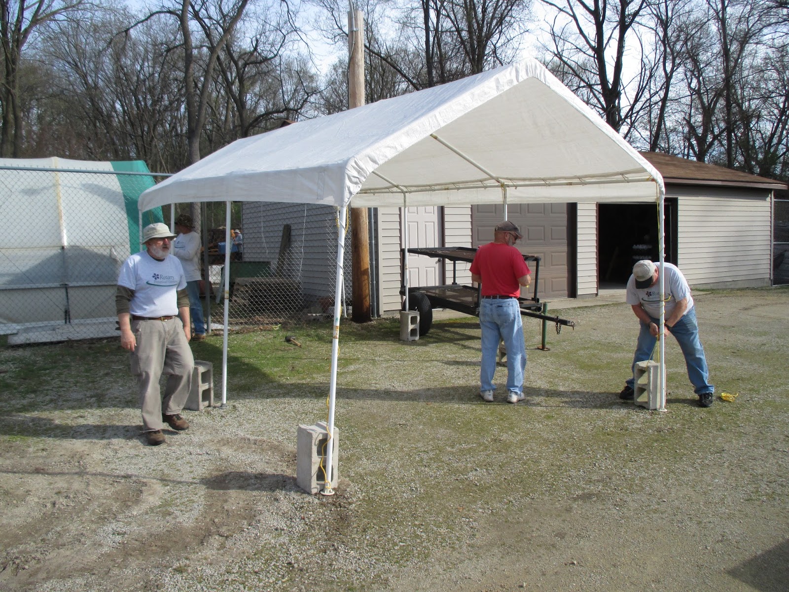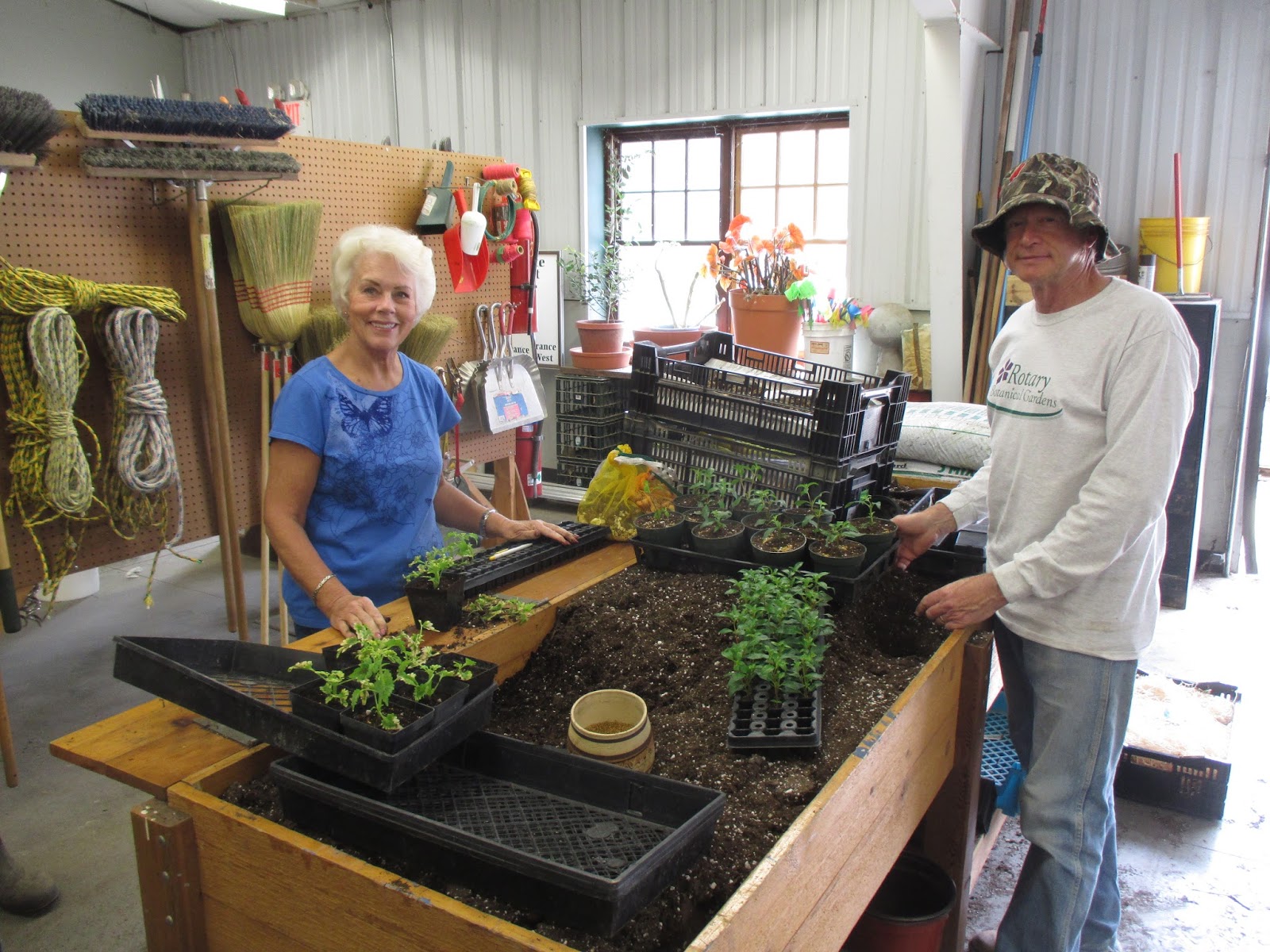 Ron P. (seen above) is evidence that preparations for the 2016 Holiday Light Show (HLS) are under way already. While we’ve packed away the show from last year, Ron continues to repair/prepare lights for our late summer/early fall installation! No rest for the weary. Speaking of events…the guys below (Lloyd, Bob C., Alan and Gary B.) did a nice job getting tents up for the upcoming Golden Kiwanis Tree Sale (April 29 and 30, 8 am – 4 pm) and Spring Plant Sale (see our website for details). Kathy, Eva and Cheryl did a great job weeding in the Nancy Yahr Memorial Children’s Garden today. This garden will feature a Hummingbird Haven theme this year and Cindy B. will keep it looking sharp I’m sure. The weeds gained a foothold early this year but are now losing the battle thankfully! Peg L. was out doing some serious sweeping. Maury worked on the fountain in the English cottage garden among other duties. Dr. Gredler was out for mowing and aerating of turf. Dave T. and Ron Y. had some carpentry projects and organized their space nicely. Gene was in for sanding and re-staining. Shirley B. came in later for some repotting duties. We also saw Bill O., Bev D., Gary S., Rollie M., Chuck S. and many others today.