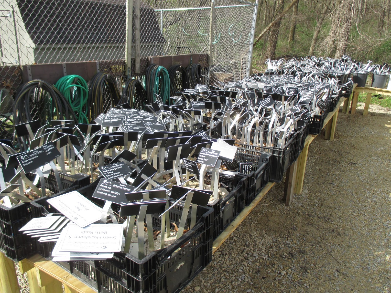 We’re a bit lighter on grounds staff on Thursdays but Larry H. and Big John accomplished a huge amount of work. Larry spread more mulch, edged, re-potted plants and had myriad other tasks. John did some rototilling, unpackaged and organized our half dozen deliveries today, watered and also had many odd jobs as well. A nice tool donation arrived today which will go in to immediate use! I was able to get out in the gardens for a bit and ultimately am finalizing spring orders and details for looming events.
