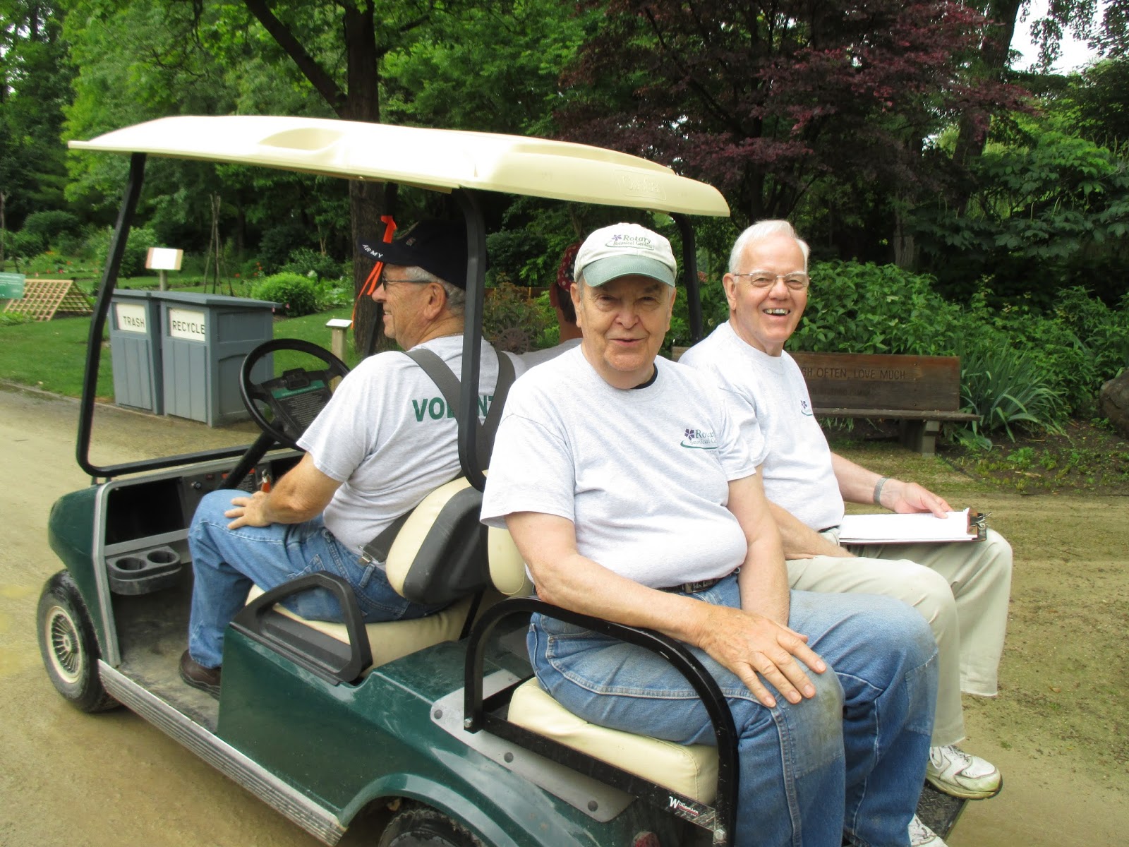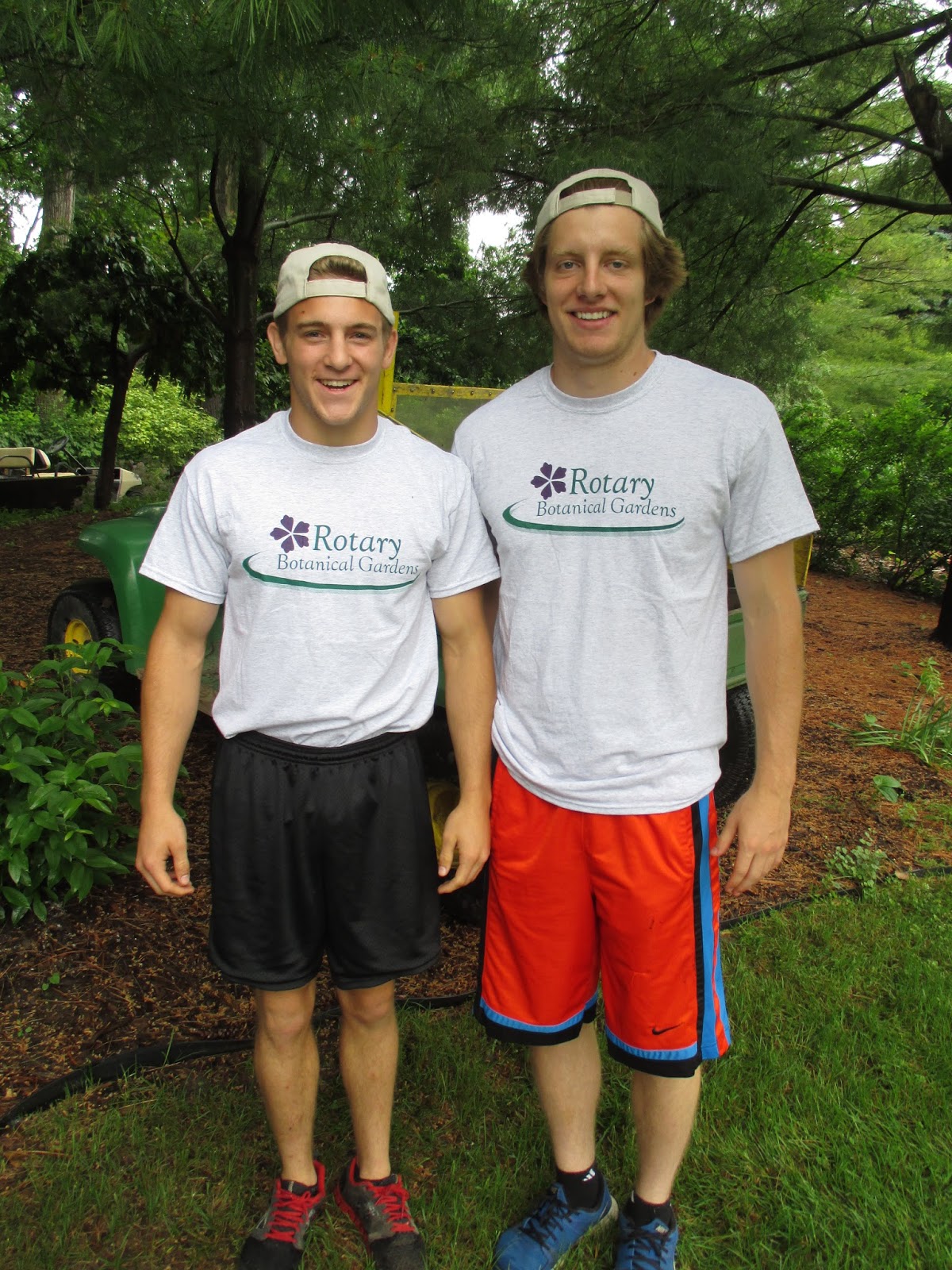 It was another rainy day although there were some gaps in precipitation that we all took advantage of quickly (like Dr. Gredler mowing above…) before the rains returned. We had our two summer helpers start today and I was involved with their training. Directly below are Nolan (left) and Trevor. The guys both just graduated from Milton High School and will both be attending UW-Whitewater in the fall. The guys jumped right in to helping and will both be very quick learners. We did have some volunteer help although the rain coming and going created some havoc. Rich (second photo down) and Alan (third photo down) both worked on tidying a border that needed to have bulb foliage removed and weeds targeted. Vicky O. was in later to do the same thing in another area. Dr. Gredler and Rollie mowed and Gary produced more signs for our new roses. Ron Y., Vern, Dave, Jim and Bob K. all worked on carpentry projects both inside and outside. Dick H. helped with some indoor projects including some welding and Maury ran more errands for us. We also saw Dr. Yahr, Bev D., and many others today.