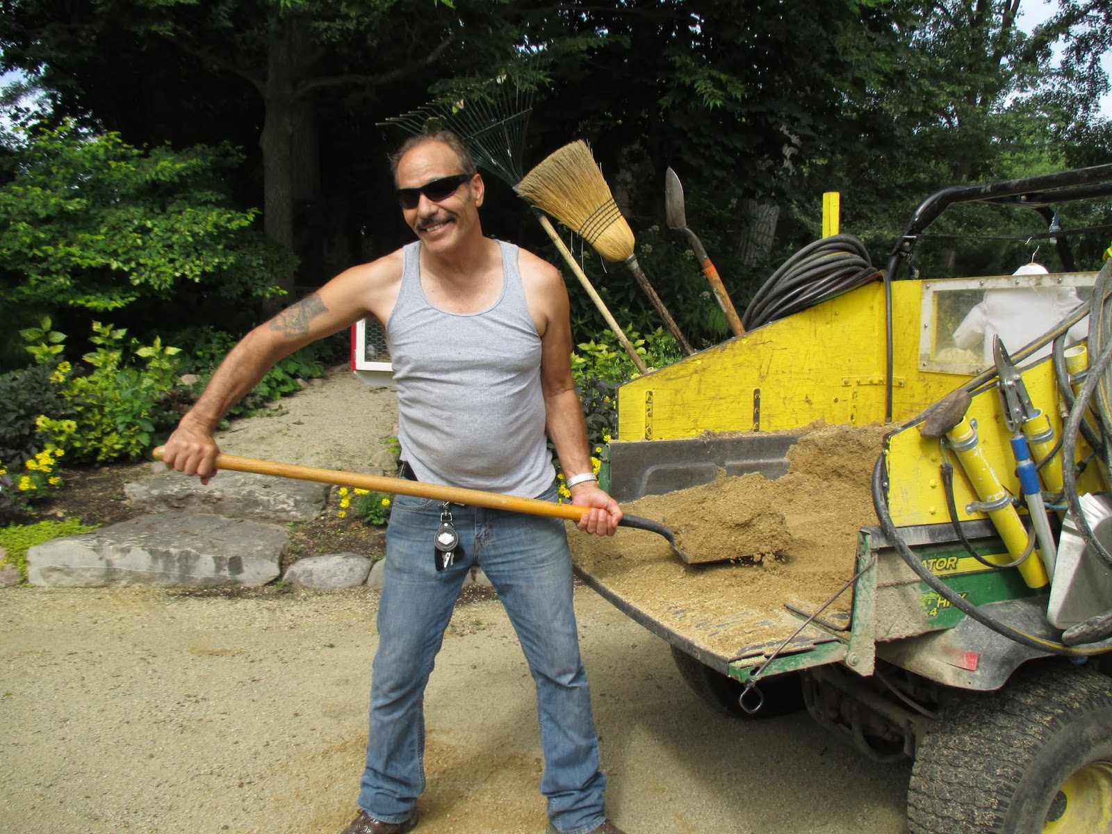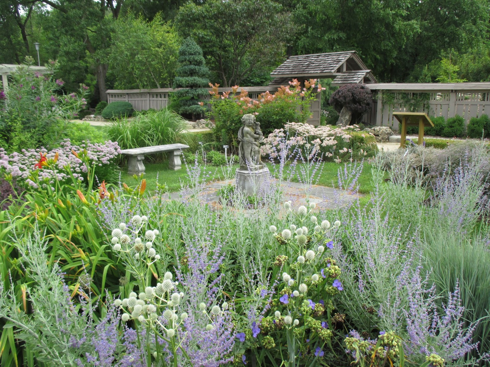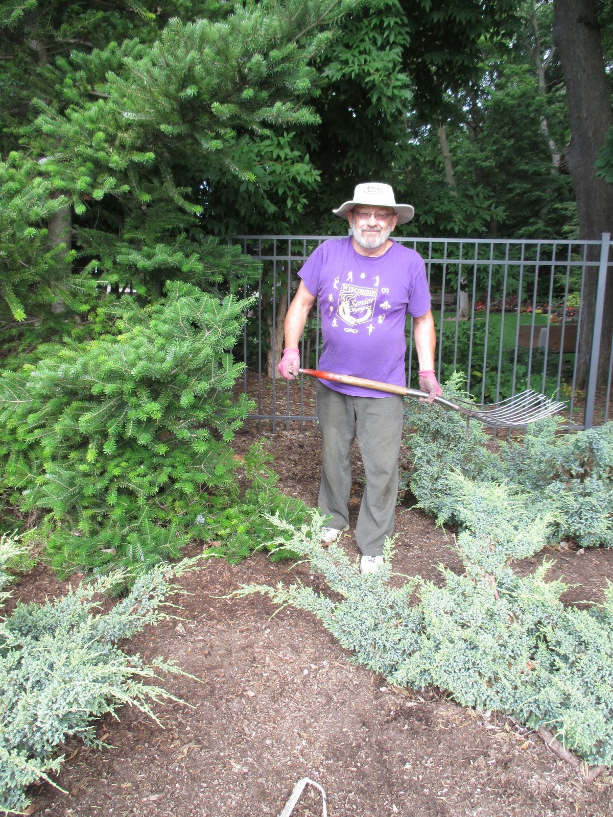 Our volunteers worked on a wide range of tasks today. Dick P. (above) was cutting more strap aluminium for our plant signs and Gary was in to continue on our labeling. Maury ran lots of errands for us and Dr. Gredler did his mowing rounds. Alan (purple boy below) did an excellent job weeding, mulching and ultimately collecting washed out rock and gravel from the gate area by the gazebo garden. Larry H., Lloyd and Ron R. went on post-storm duty and did an super job tidying up paths and patios after the debris-laden weekend. Dick H. ran to the dump and worked on some other projects. Ron Y., Dave, Bobby K. and Jim continued work on the obelisk assembly line in the Horticulture Center. Kathy (second photo down) and Eva did a nice job weeding in the Alphabet Jungle Garden while Mary D. weeded in the formal annual sections. Pat M. worked on path tidying as well and fixed a damaged umbrella from the weekend. Ed (third photo down) continued re-graveling one of our primary paths. Shirley H. (fourth photo down with her druid twin) did a nice job weeding in the Scottish garden and reception garden. Rollie was in for some mowing and Lisa I. stopped by to meet with me as we assessed the Potter Daylily Collection. We also saw Joe M., Marcia L. (English cottage garden) and many others today!