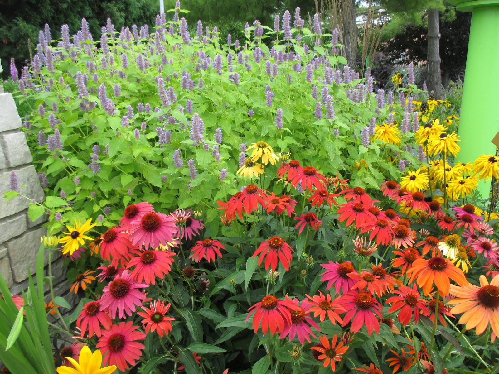 The weekend saw some heavy winds and driving rain on Saturday afternoon and we spent quite a bit of time today cleaning up the gardens. Thankfully, there were only a few large branches down but plenty of debris to collect. The gardens still look great (see above) and are transitioning to mid-summer quite nicely. We had to do very little watering today as we’ve had consistent precipitation and the cloudy sky helped as well. We had an excellent turnout of volunteers today and the staff dove right in to a wide range of general gardening tasks. All the photos in this blog were taken throughout the day.