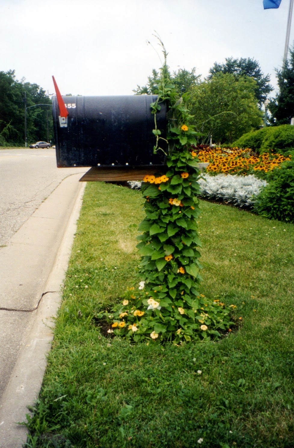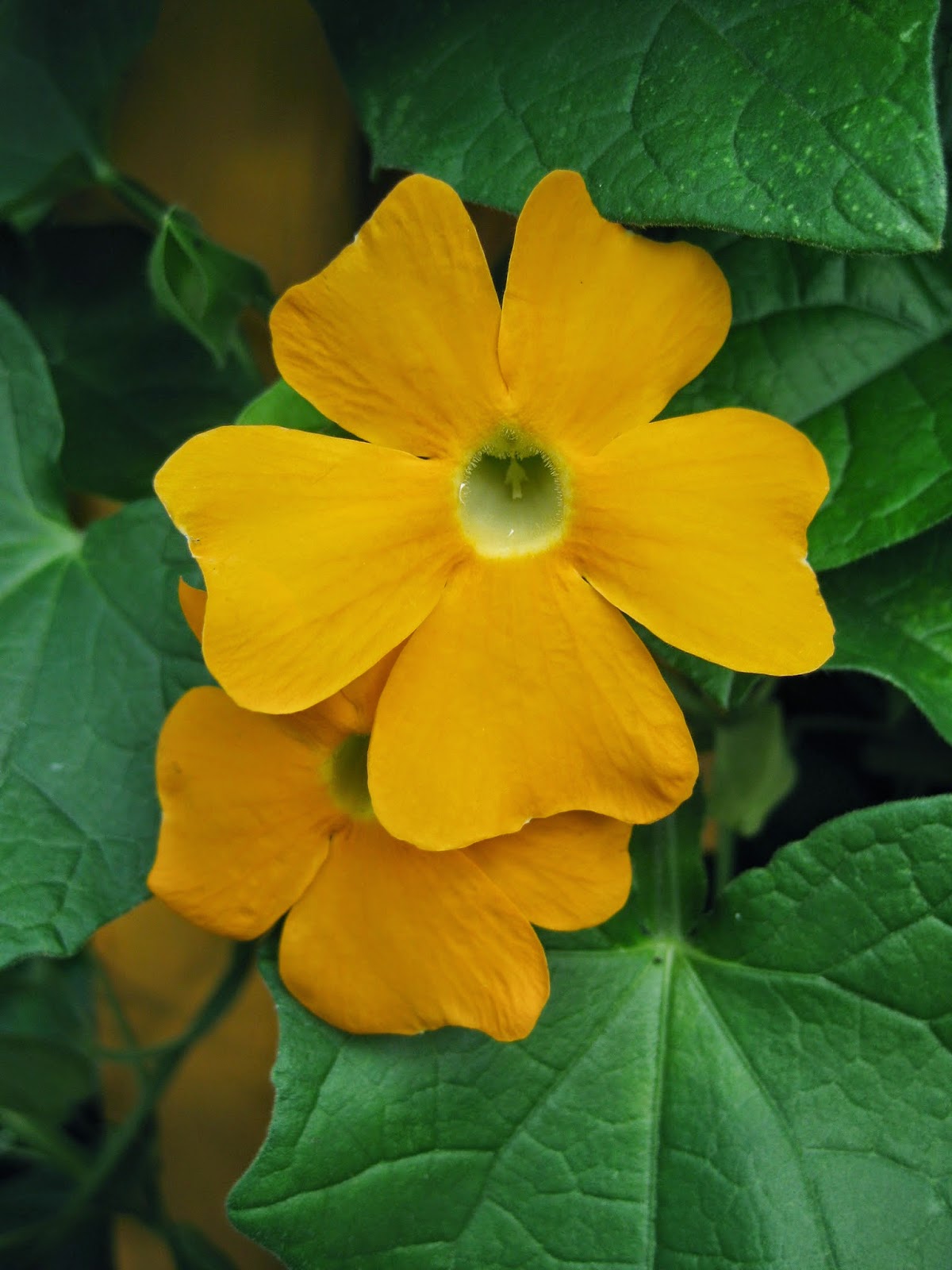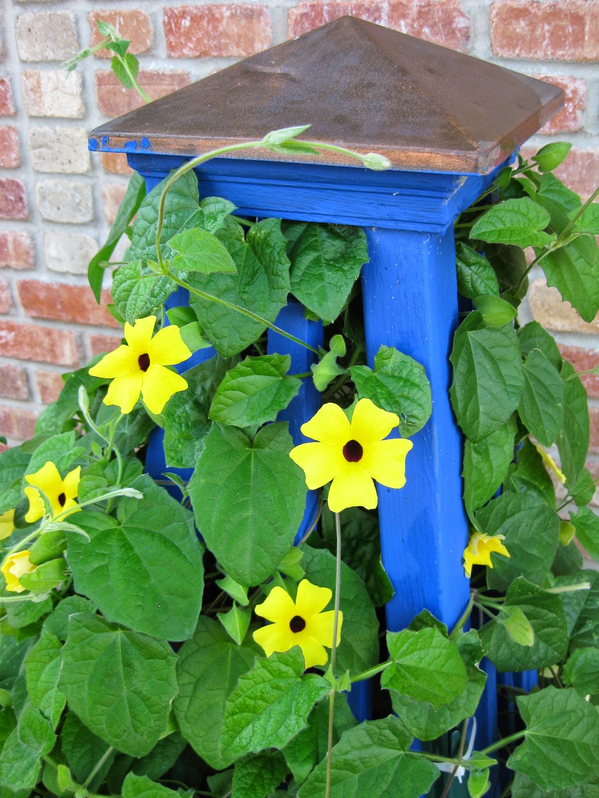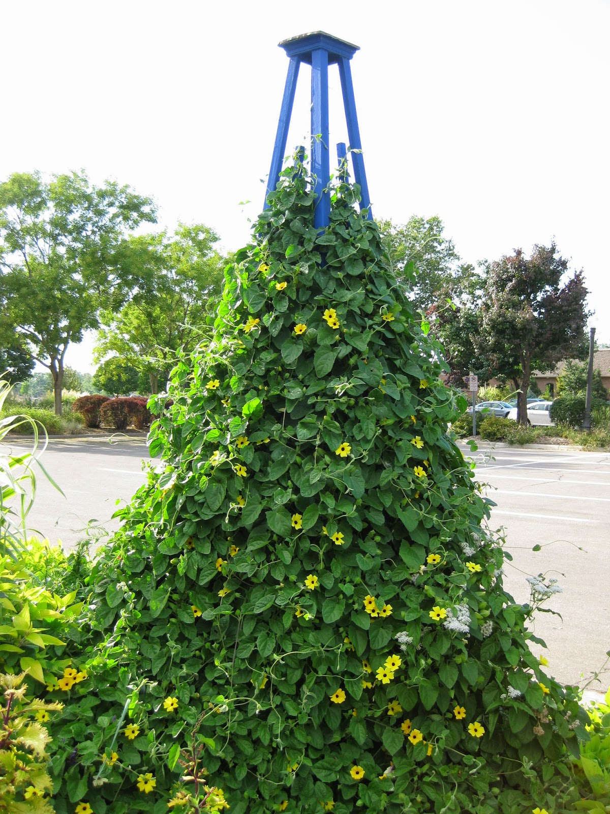 The blog today features the annual black-eyed Susan vine (Thunbergia alata) which has always been a great performer for us at the gardens. This vine, native to Eastern Africa, does well in our hot summers and will typically get 6′-8′ in one season. The blooms are reminiscent of the black-eyed Susan with many having yellow or orange flowers with a dark center. Above is the variety ‘Orange Beauty’ which is quite vivid in the landscape. Although this vine has naturalized in warmer climates, it’s a true annual for us and is an excellent twining vine for smaller structures in full sun and with decent soils. The 5 petal flowers run the range of yellows, oranges, pink, near red and white. There are an unbelievable amount of colors right now including mixes. Some have the dark center and some varieties are without that dark throat (or “eye”). You can find a wide range of these in seed catalogs and some of the fancier new ones are vegetatively propagated so can be sought and bought as plants. Some fun varieties can be seen below.