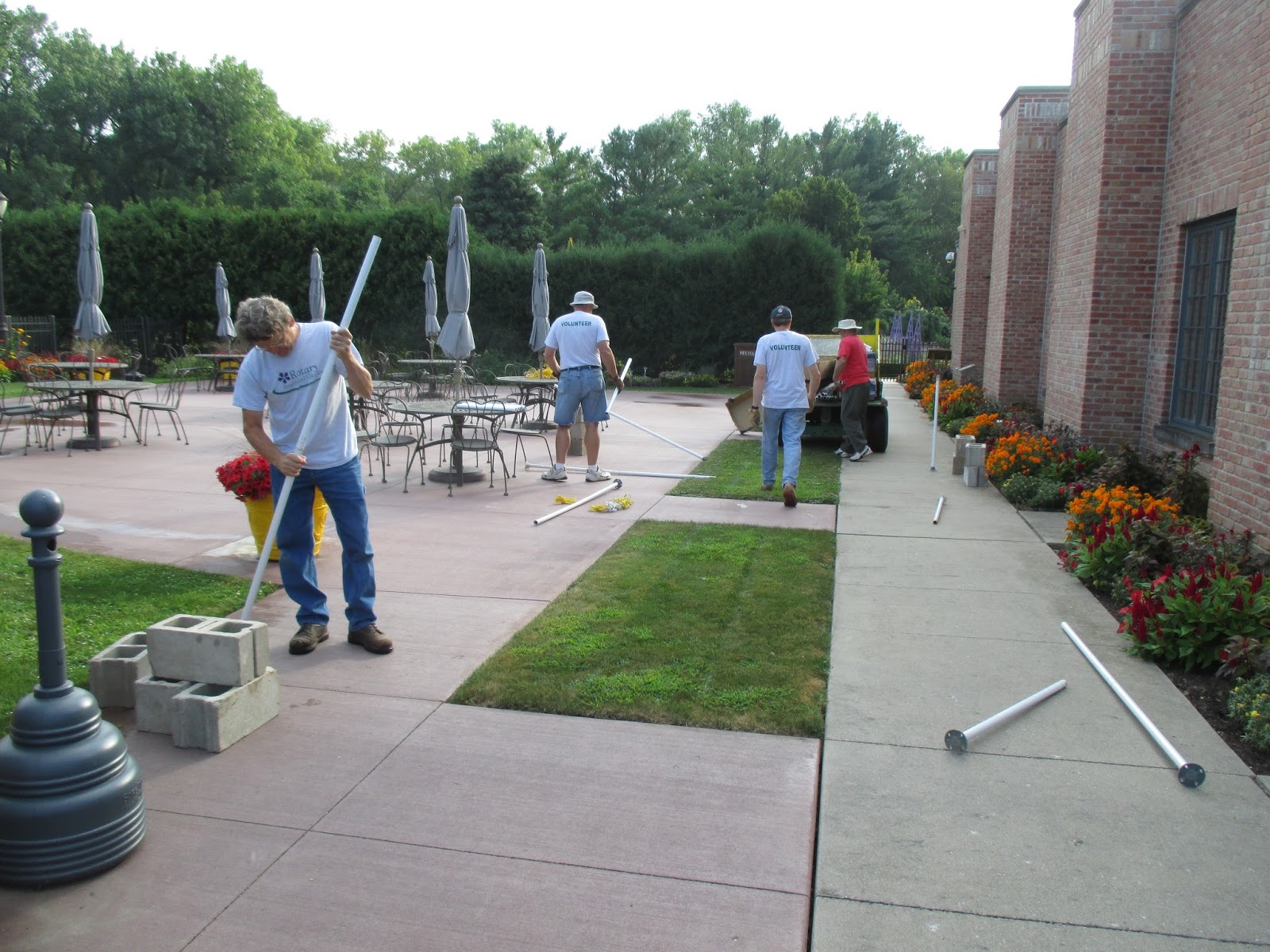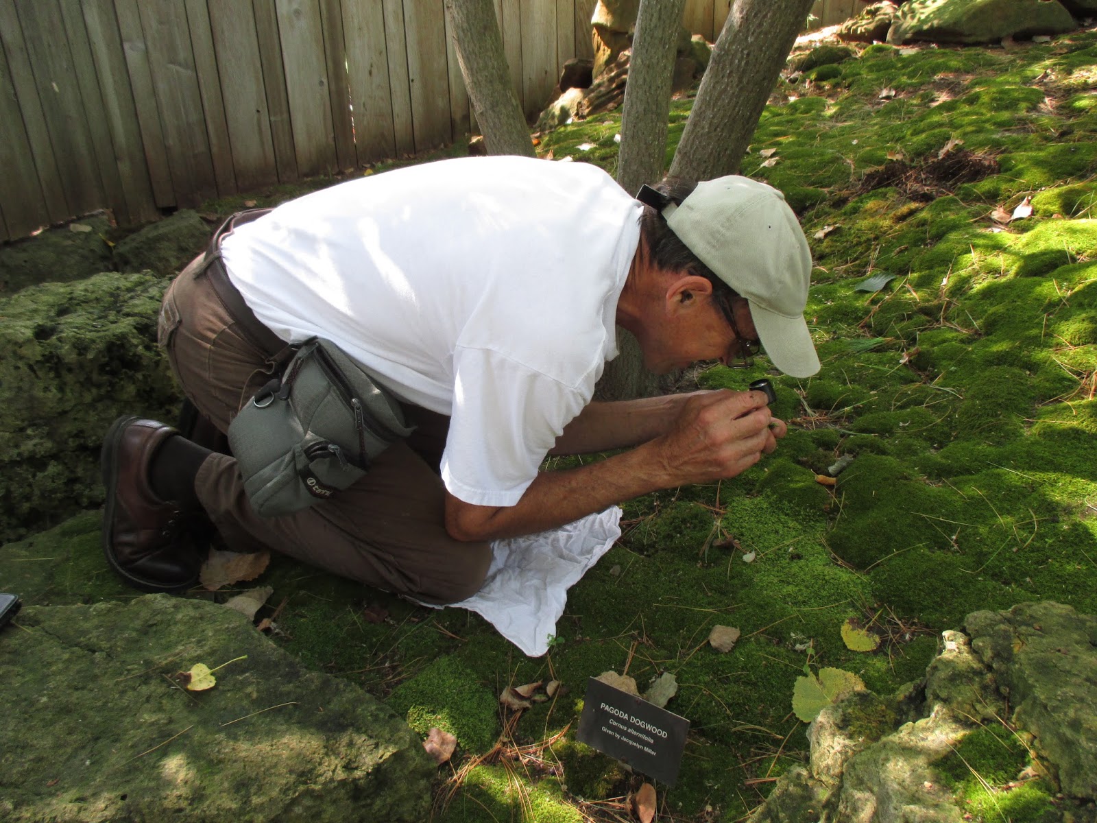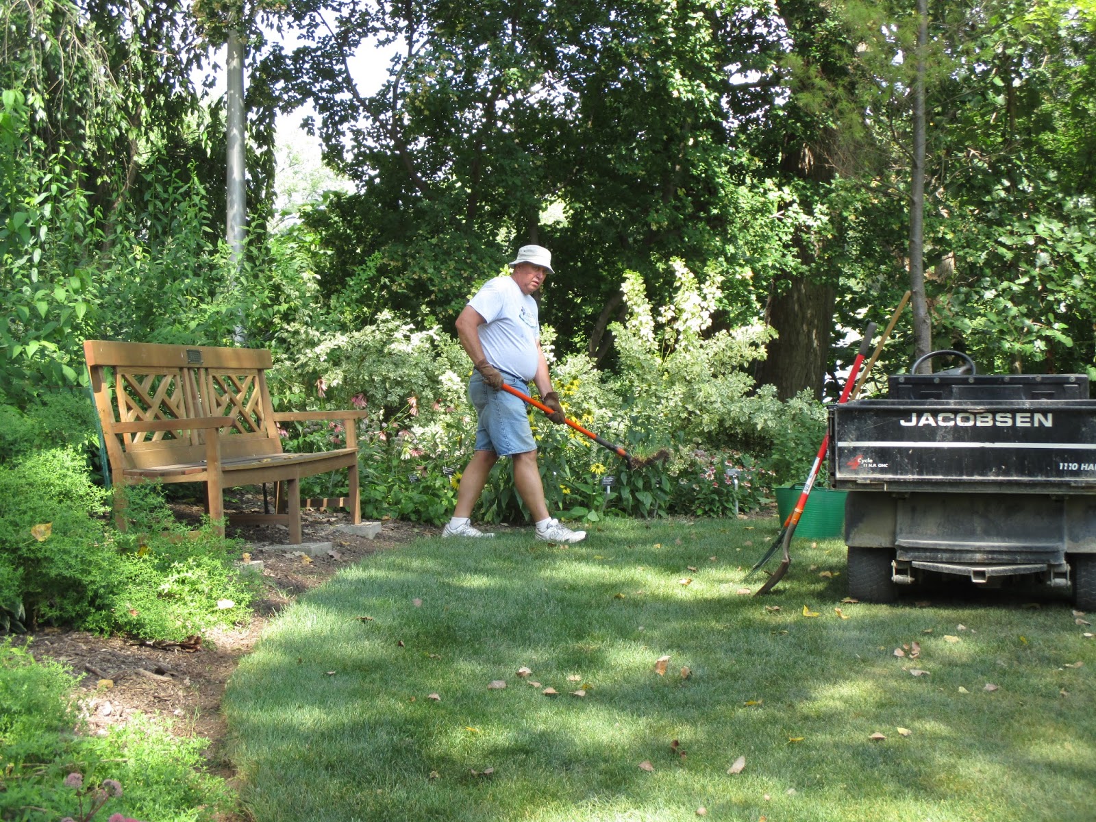 Our volunteers today were excellent as always. Above are Alan, Larry H., Bob K. and Ron P. setting up four tents that will be used as part of our Gardening As Therapy symposium tomorrow. The guys did an efficient job of setting up the tents and moved on to some other projects like sweeping and air edging (See Ron P. in the third photo down). Kathy (directly below) and Eva (second photo down) did a great job weeding and tidying up in multiple areas. They are quite thorough and work well together. Dave and Jim worked on some carpentry projects while Maury ran many errands for us. Dr. Gredler and Rollie did some mowing while Dick H. worked on vehicles and ran loads to the dump. Pat M. was in to work on some projects and Shirley H. did a nice job weeding in multiple areas. Dale S. (“Mr. Moss” – fourth photo down) came to the gardens with his friend Dick. Dale checked over our moss gardens as we’re trying to troubleshoot some issues. Maureen was over watering at the Horticulture Center (fifth photo down) and we also saw Dr. Yahr, Hal R. and many others today. Lisa I., Bev D., Bob D. and three others did a nice job dividing some daylilies from our collection yesterday (Sunday).