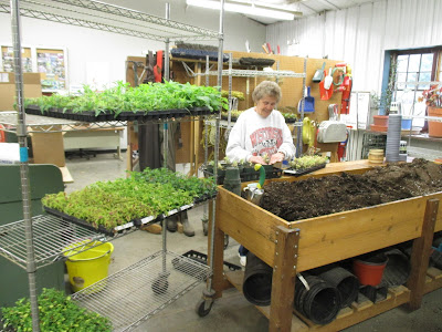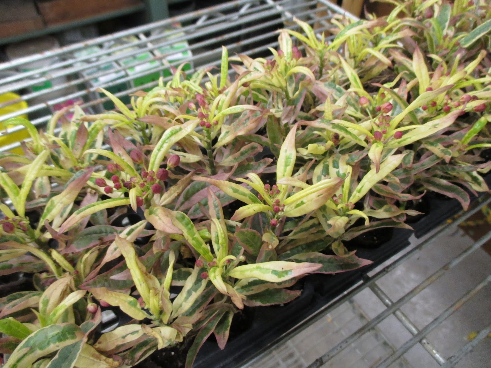 Above is Kathy who earned some extra credit by coming in early to start transplanting plugs in to larger pots for this year. She started by working on the new, variegated milkweed (Asclepias curassavica ‘Monarch Promise’) seen below. I included some photos I took of this plant last summer which really show off the interesting foliage. Eva later came to help Kathy out and they also headed out in to the gardens for some tidying. Kay was in to tidy a tough area but she always does such an excellent job. Our daylily dividing crew today was led by Lisa I. and included Bev, Bob, 2 RECAPPERS, Ken, Peg, Deb and her granddaughter. They did an excellent job and accomplished what they set out to finish! Maury worked on lots of odd jobs and Dick H. was around to help as well. Our Garden Development & Maintenance Committee had a meeting (Christy M., Big John, Ron, Hal, Iza, Maury, Larry H. and me). We also saw Sue M. and many others today as well.