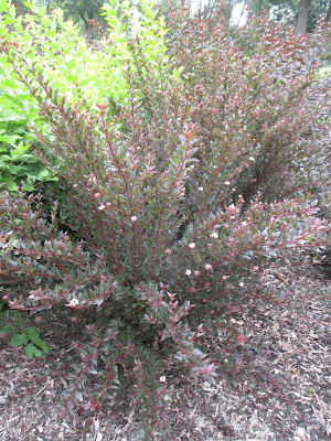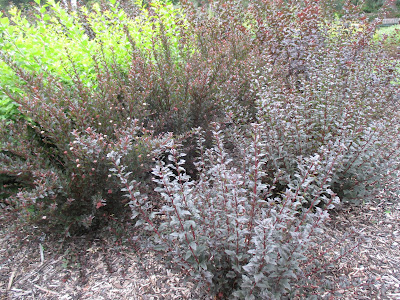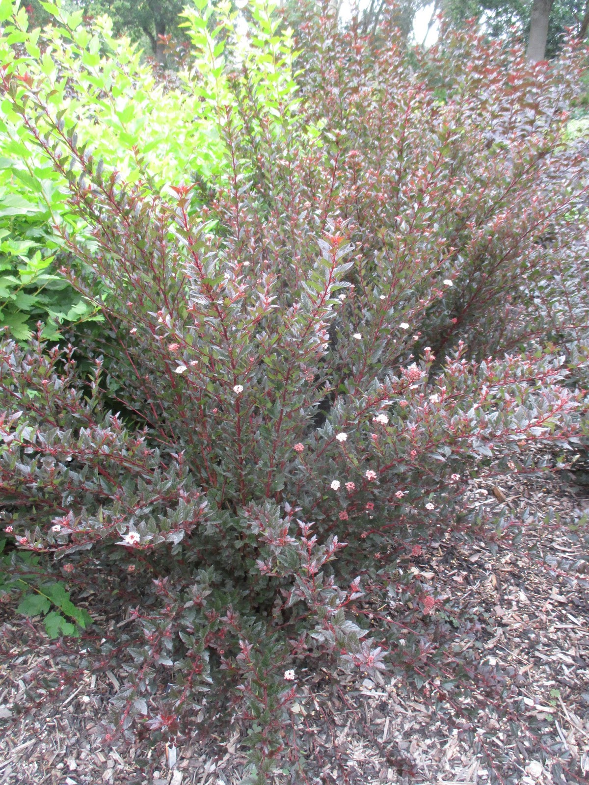 I like ninebarks (Physocarpus opulifolius). This durable shrub is adaptable to a wide range of soils, will tolerate part shade (prefers full sun) and is certainly hardy for us. This North American native has green foliage although the best landscape selections have colorful foliage in shades of chartreuse, gold, maroon, red and orange. There are some great older varieties that will get some size to them and reach heights of 8′-10′ in height with broad, arching branches. Keep in mind that the arching form of ninebarks is quite ornamental and should be accommodated when spacing them in the landscape. They don’t lend themselves very well to shearing although established specimens can literally be cut back to the ground every year and will re-sprout growth to 4′-5′ or so in one season. Heavy powdery mildew issues have plagued some of our specimens during cooler years but our severe cutback and collection of stems every fall has helped minimize “re-infection”. The larger specimens like ‘Dart’s Gold’, ‘Nugget’, Diablo (‘Monlo’), Coppertina (‘Mindia’), etc. need plenty of “real estate” but have some significant impact. There are more compact versions that have come out that carry the same foliage tones in a more “reduced scale.” Look for Lemon Candy (‘Podaras 3’) for gold, Amber Jubilee (‘Jefam’) for orange and Summer Wine (‘Seward’) for the maroon. These selections are more in the 4′-6′ range. I should mention that the “orange” ninebarks do transition to a maroon by mid summer but still look sharp. However, there are now two even smaller maroon leaf varieties. Little Devil (‘Donna May’) has been out for a couple of years and is featured above and in most of the photos below. This variety is listed as attaining a height of 3′ or so although I’ve seen it a bit larger. The smaller form, foliage and appearance is sharp though. Tiny Wine (‘SMPOTW’) is another nice small one (featured in the bottom two photos) with near identical features to Little Devil. I like their look and the smaller stature should increase their use in foundation planting schemes, mass plantings and use as a medium sized specimen offering some nice dark coloration.