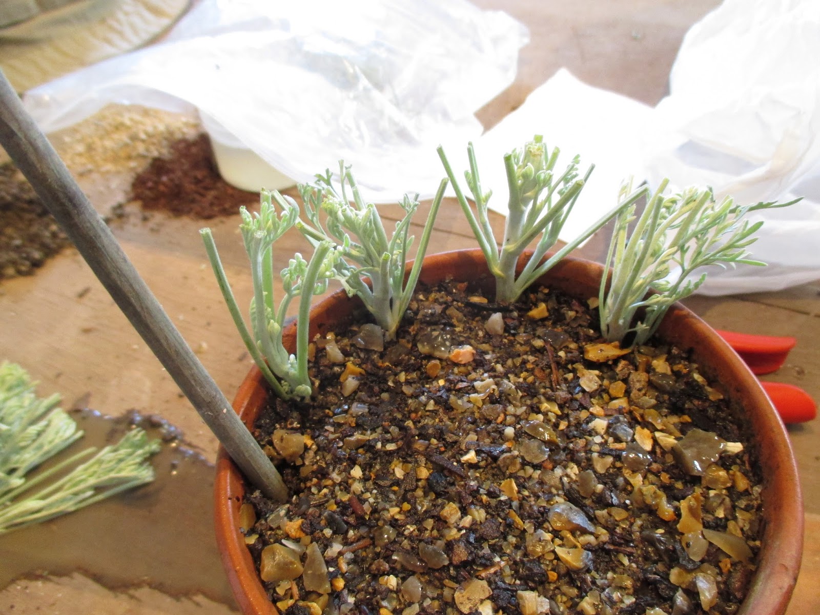 After morning clean-up in multiple garden areas, I helped make some new potting soil and worked with Susan and Michael on potting up various perennials. In essence, we were “bumping them up” from a 3″ container to a 5″ container. I later was shown how to propagate three different types of plants by Siew Lee and Kathleen. I had a blast doing this and ended up replanting about 250 cuttings after Siew Lee and I processed what Kathleen had collected. The ladies were both patient instructors as I haven’t done this in many years! Part of the set-up in the potting shed can be seen above and some of the work seen below…