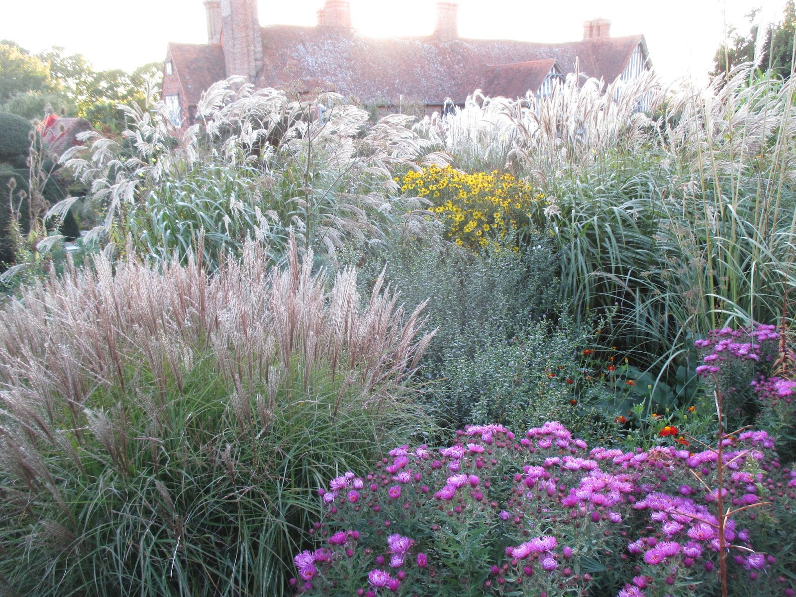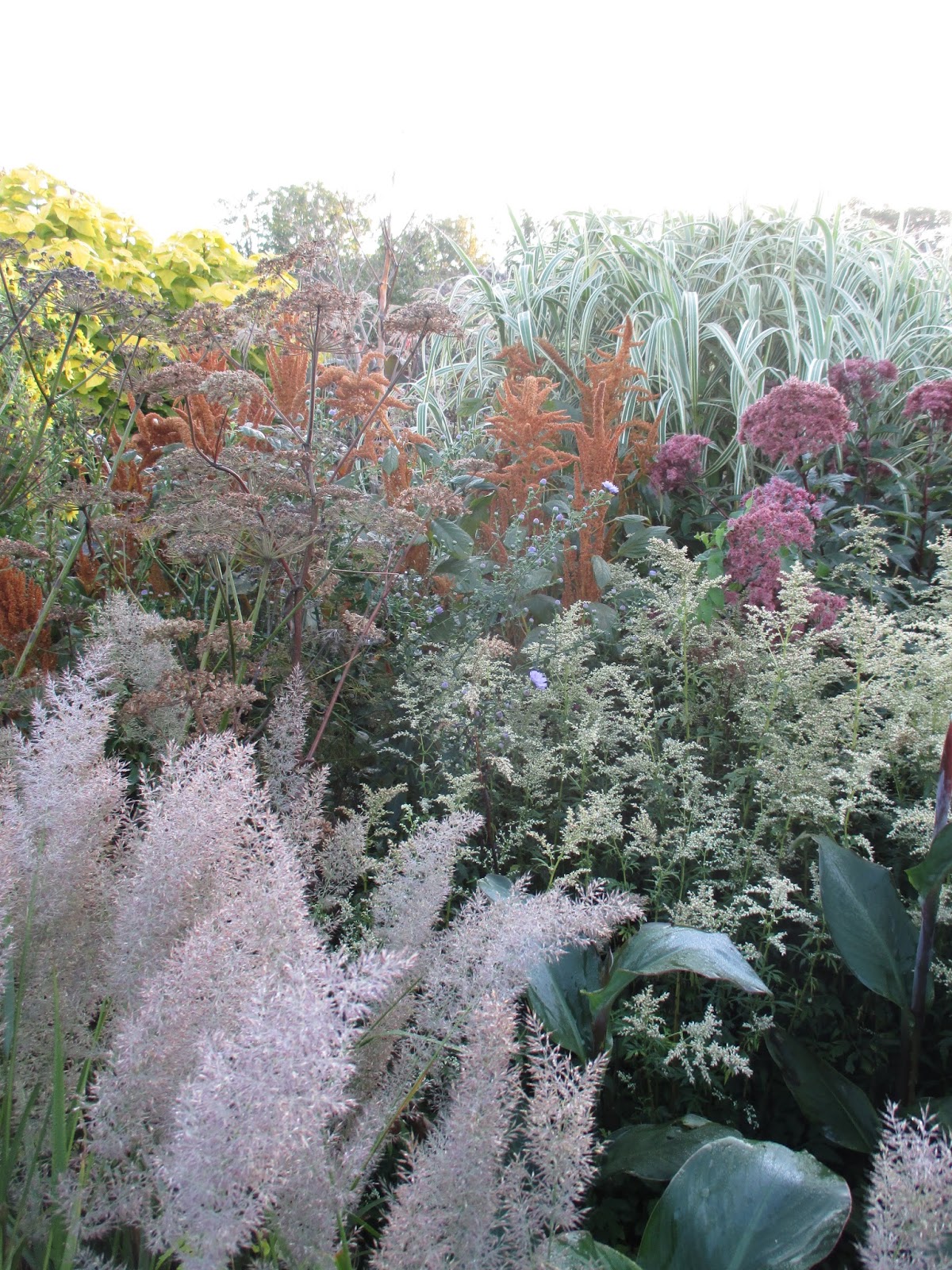the inflorescences of perennial fountain grass (Pennisetum alopecuroides) above are magical with morning dew