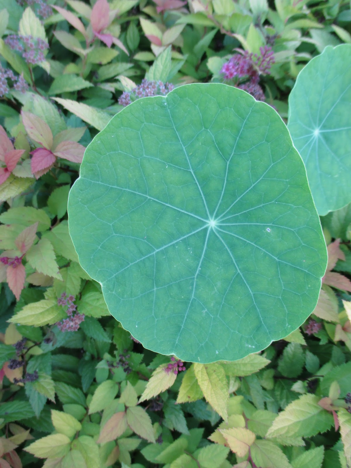 nasturtium (Tropaeolum sp.) leaf coming up through spirea