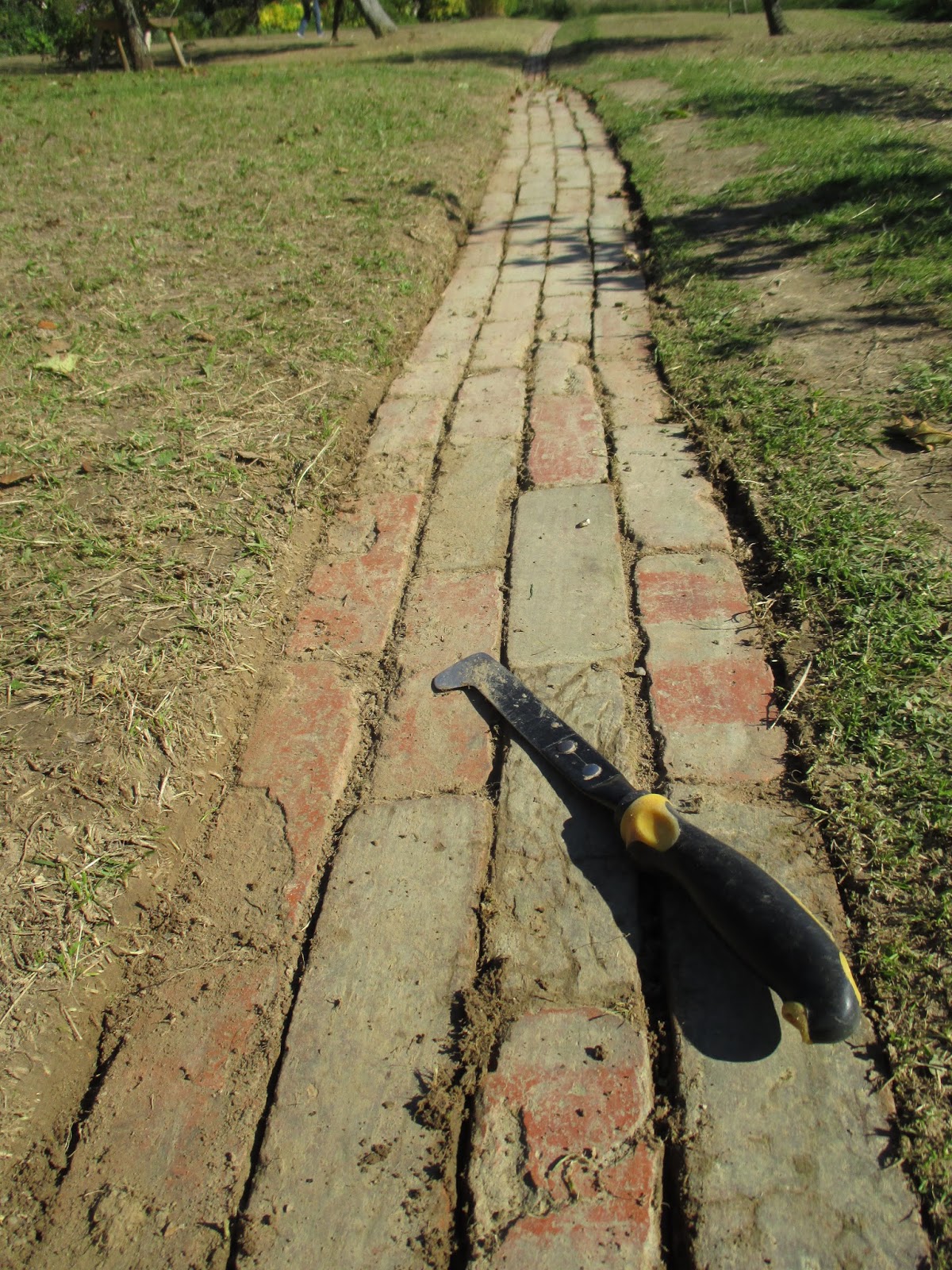 here is a segment of the brick “wheelbarrow path” that we worked on (Thies and Susan below) – love that scraping tool by the way!