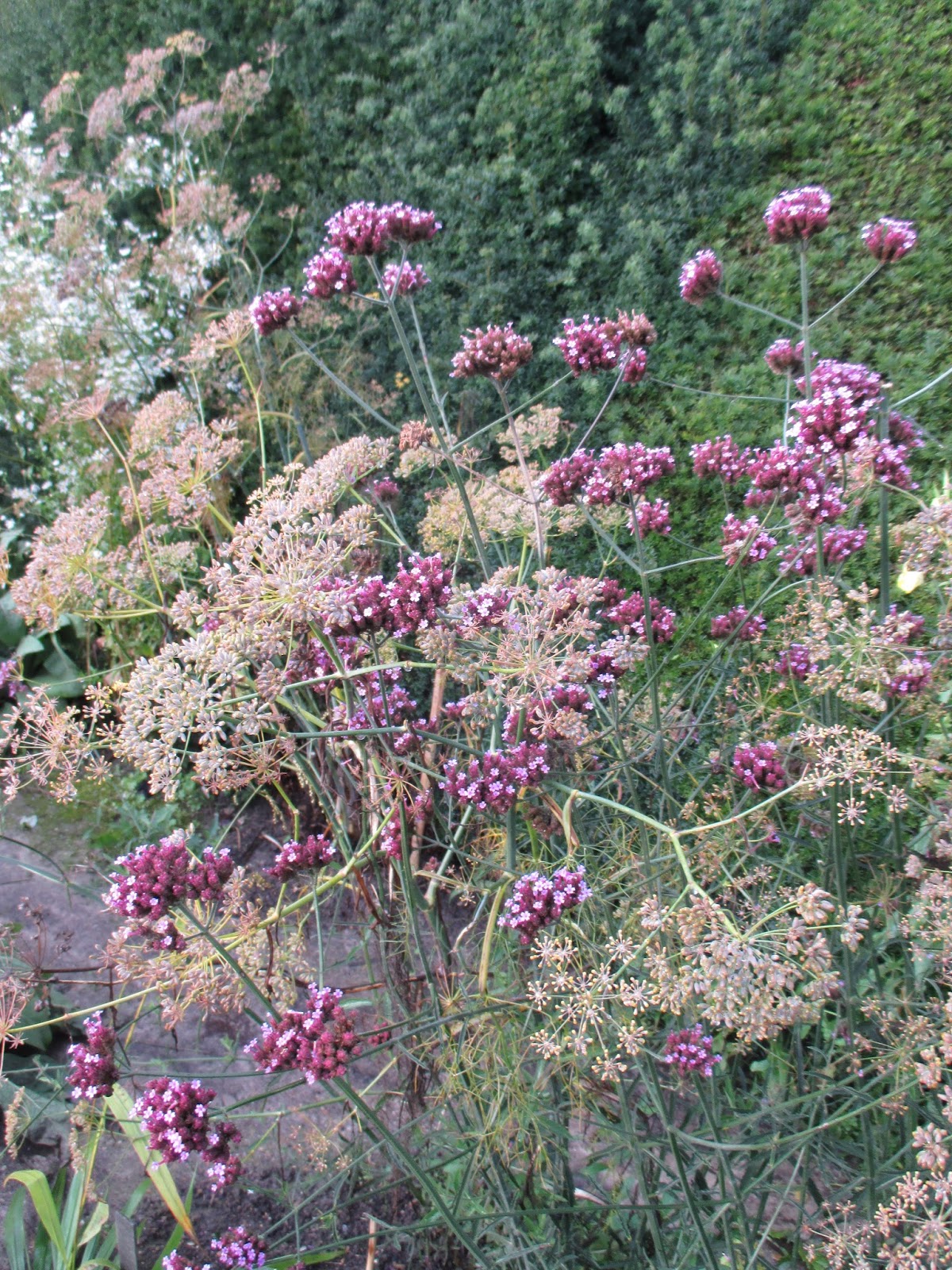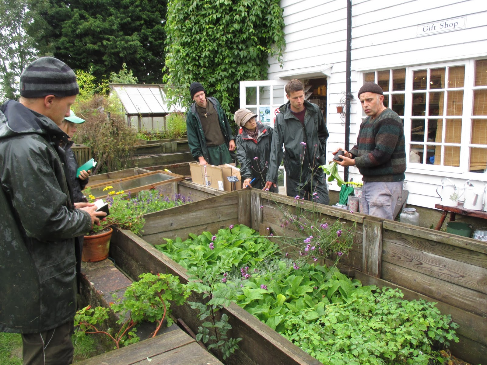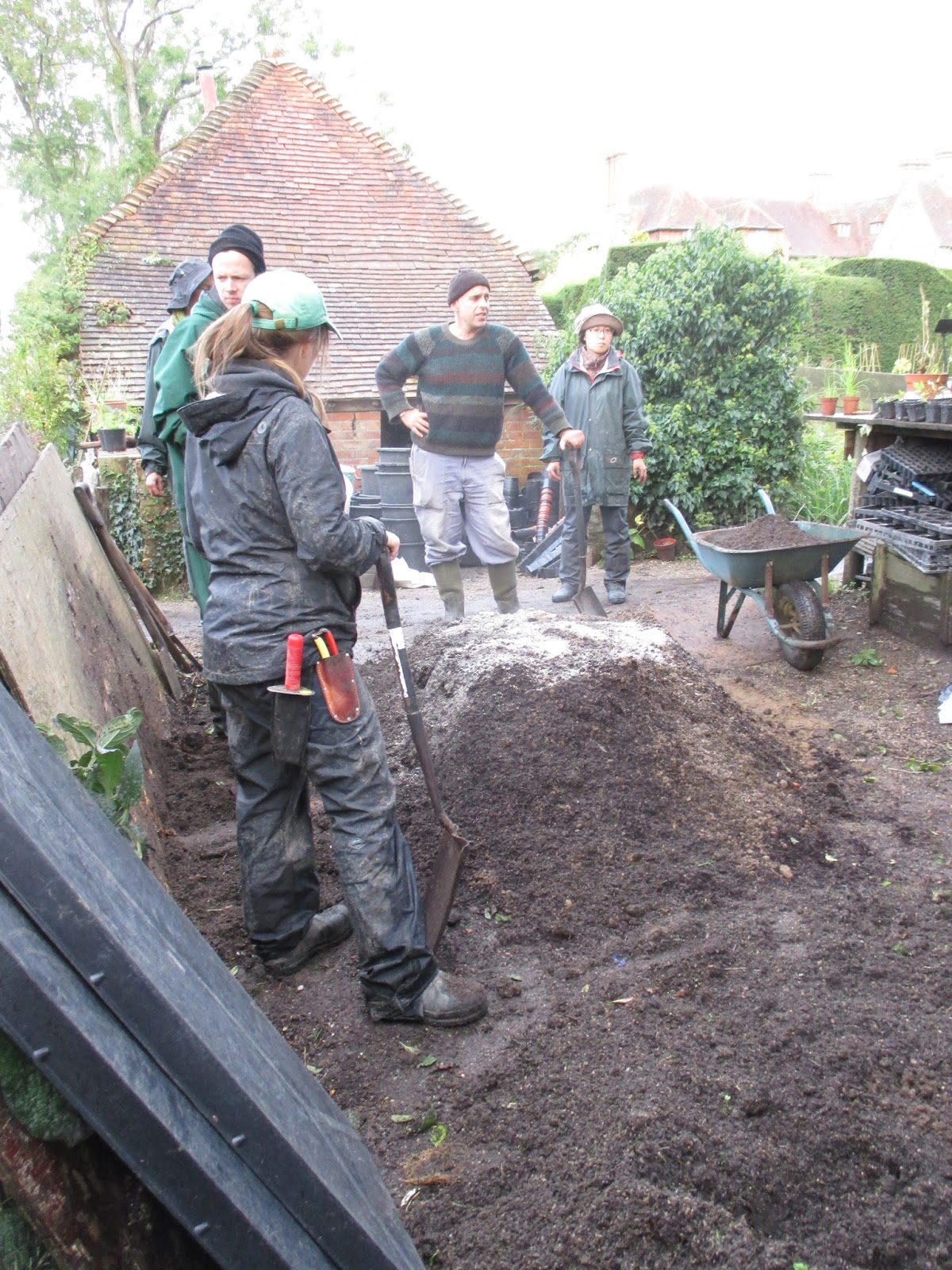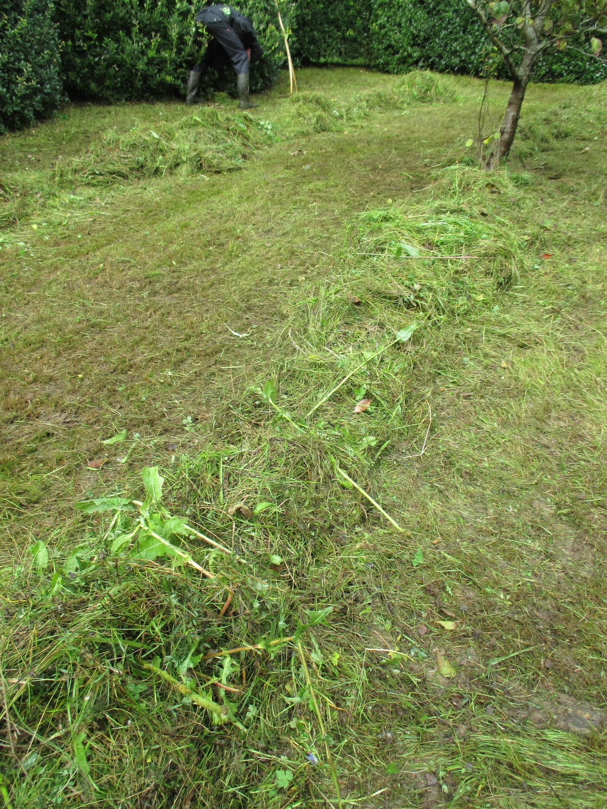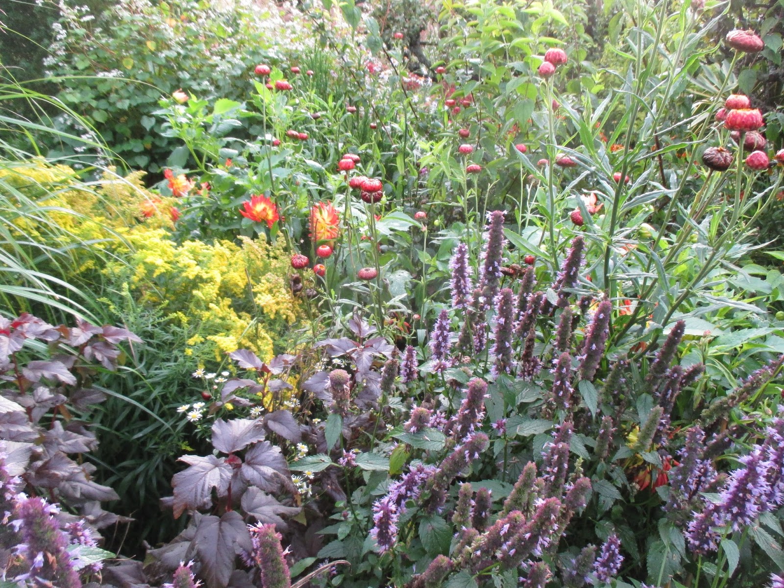 One of our continuing projects was to continue to inventory and bag up bulbs for the Great Dixter Plant Fair (October 3rd and 4th). Above are just some of the boxes and due to varieties being jumbled between different boxes, we had to sort them out and organize them better as well. Below are some of the folks involved with processing bulbs this morning. Left to right are Michael, Thies, Jonny, Kate and Susan. Others came and went and we did get through that project and headed outside. A school group came through the barn and the woodworkers (Simon and Sam) showed them some of the work they do which resulted in these really cool wood shavings (second photo down). Fergus spent time with the students today (third, fourth and fifth photos down) and never hesitates to share a “teaching moment”. He’s off traveling to Japan soon so we talked about the next couple of days and what projects are the priority. The sixth photo down shows some of the work occurring in the meadows with them being cut and the debris collected for composting or sometimes spreading over other meadows to “share” the seed. They have quite a system and plenty of meadows still left to cut. The remainder of the photos below were taken after work and capture a lot of the beauty out in the gardens on this damp day.