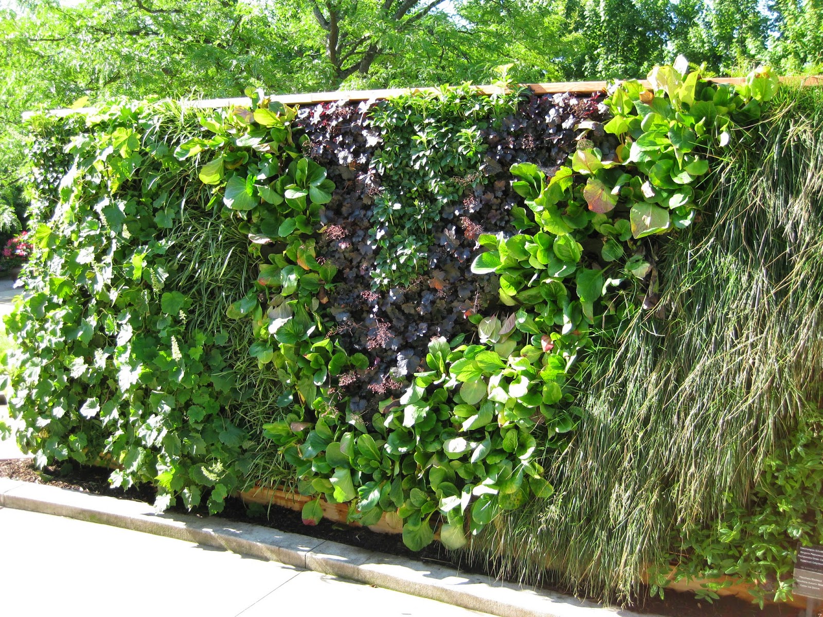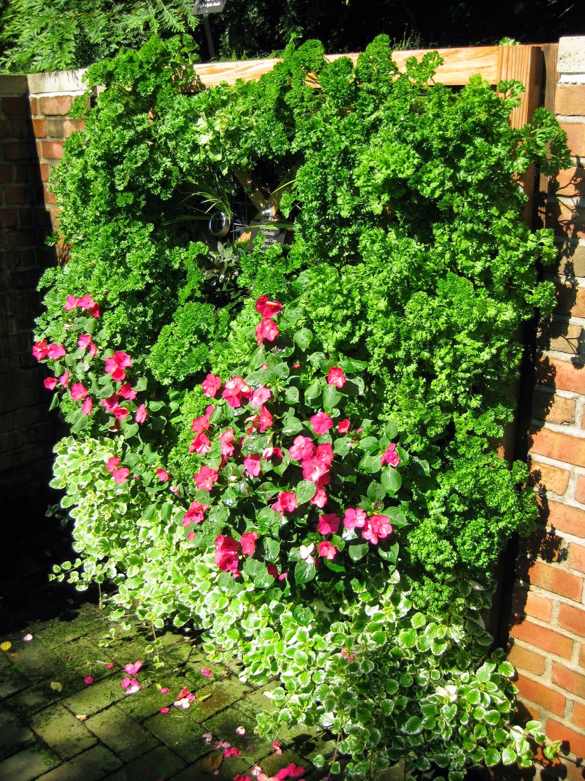 This blog has an assemblage of vertical wall plantings that I’ve seen over the years. There are much larger systems on the sides of buildings and that technology continues to improve. However, those systems are usually “soil-less” with plants rooting in to an engineered felt system with plants being nourished by nutrient solutions being flushed down through the plantings. I don’t pretend to understand all the technology behind this but check out Patrick Blanc and his work in this regard primarily in Europe. He has a book as well and I’m amazed at the scale and scope of some of these urban systems. The walls seen in this blog, like the one above seen at the Ball Seed Trial Gardens (West Chicago), require soil and plants root directly in to these frameworks or fabric pouches. Above is a Woolly Pocket system although most of the other set-ups were constructed to not only handle well-drained soil (essential) and plants but the combined weight of those elements. The proper construction, anchoring and maintenance of these structures is paramount. See some examples further below.