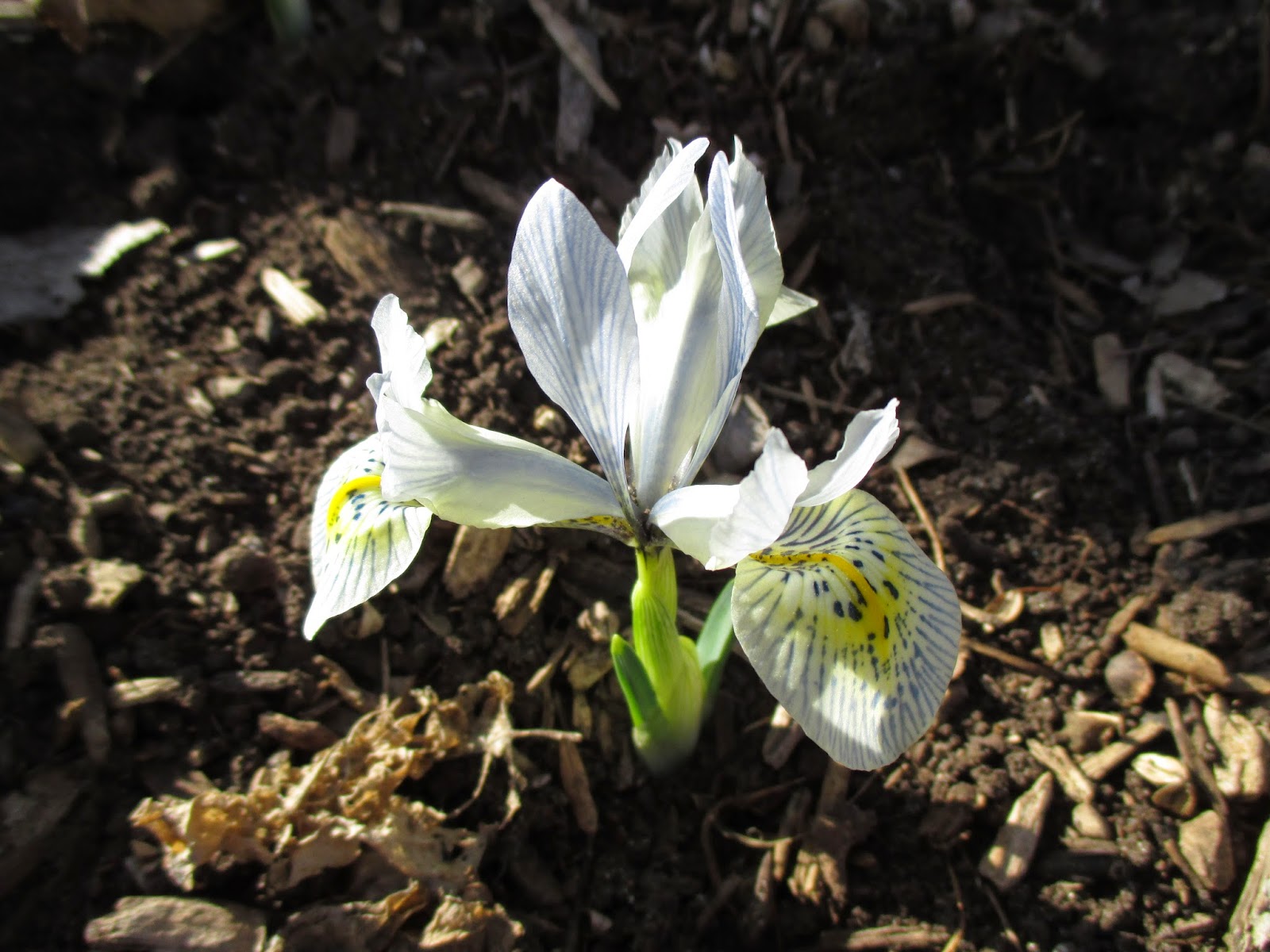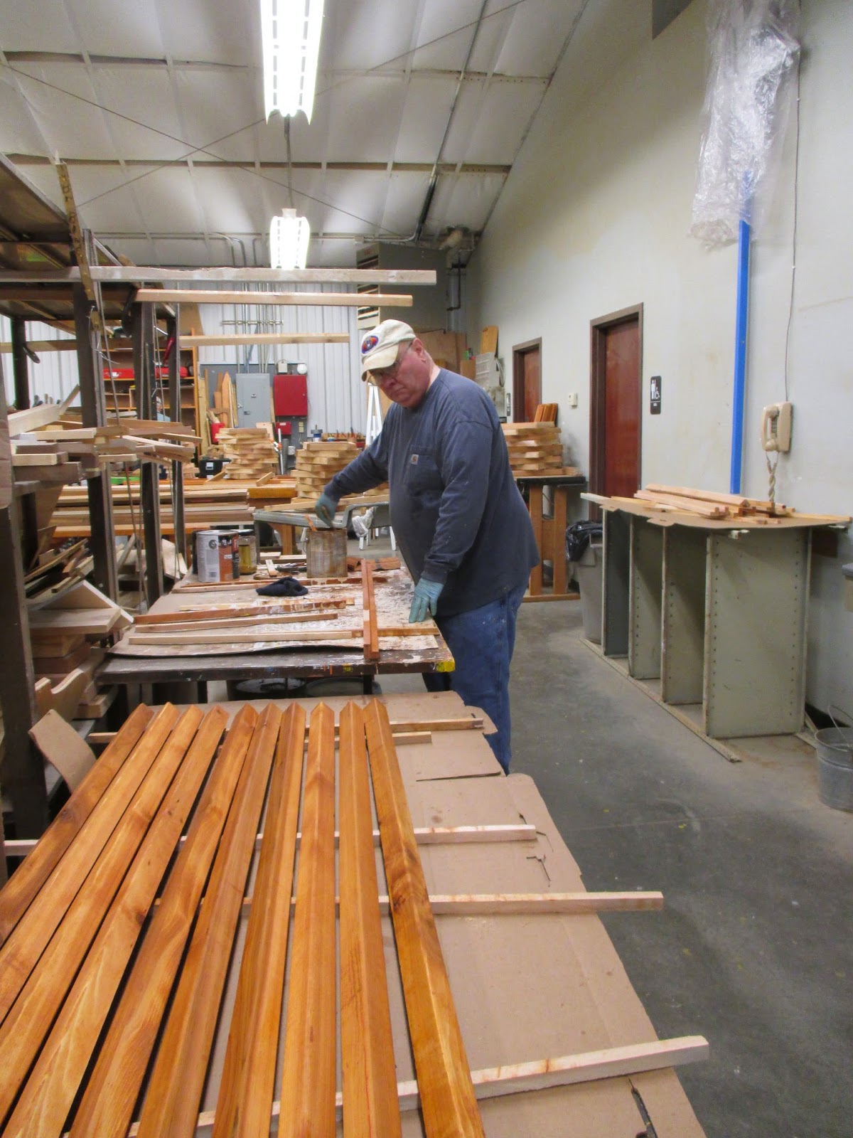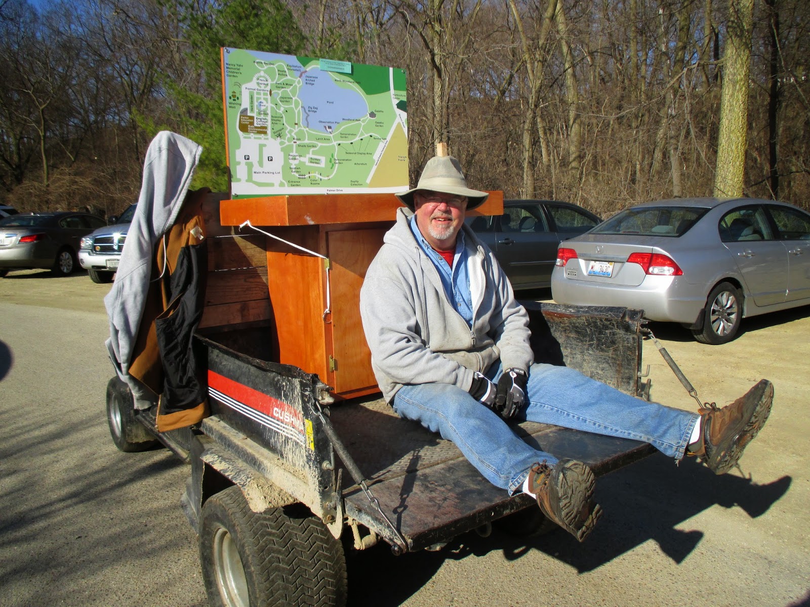 We had a very strong volunteer turnout today. Above are Alan (left) and Ron P. out hauling shredded bark to mulch the parking lot islands along with Larry H. and Lloyd (both below leaning on their forks and taking an early break..). The guys did a nice job collectively mulching a huge area and were joined by Gene later in the morning. The second photo down shows Ron R. (left) and Bob C. composting multiple areas that will ultimately be planted with seasonals this spring. Rollie (third photo down) was in as was Jenny M., (painting), Dr. Gredler (painting), Maury (errands), Del (cleaning), Marsha (photography) and many others. Pat C. (fourth photo down) continued her assessment of labeling needs (repairs, replacements, etc.) in multiple areas and Gary was inside working on this same project as well as producing new labels for incoming plants. The fifth photo down shows (left to right), Peg, Kathy and Eva. The ladies did a great job with some early weeding and collected lots more debris from garden areas adjacent to the sunken garden. The sixth photo down shows John being hauled around by Terry…the guys brought up the “cutting display” bench as it’s that time of year to show folks what’s in bloom and where it’s located. Dick H. ran multiple loads to the dump while Ron Y. (seventh photo down) continued staining portions of the new cedar obelisks the guys are making (see Vern and Dave in the eighth photo down). Jim D. was part of that crew too and we also saw Bob D., Tina B., Harry M., Cheryl R. and many others today. See further below for more photographs from today.