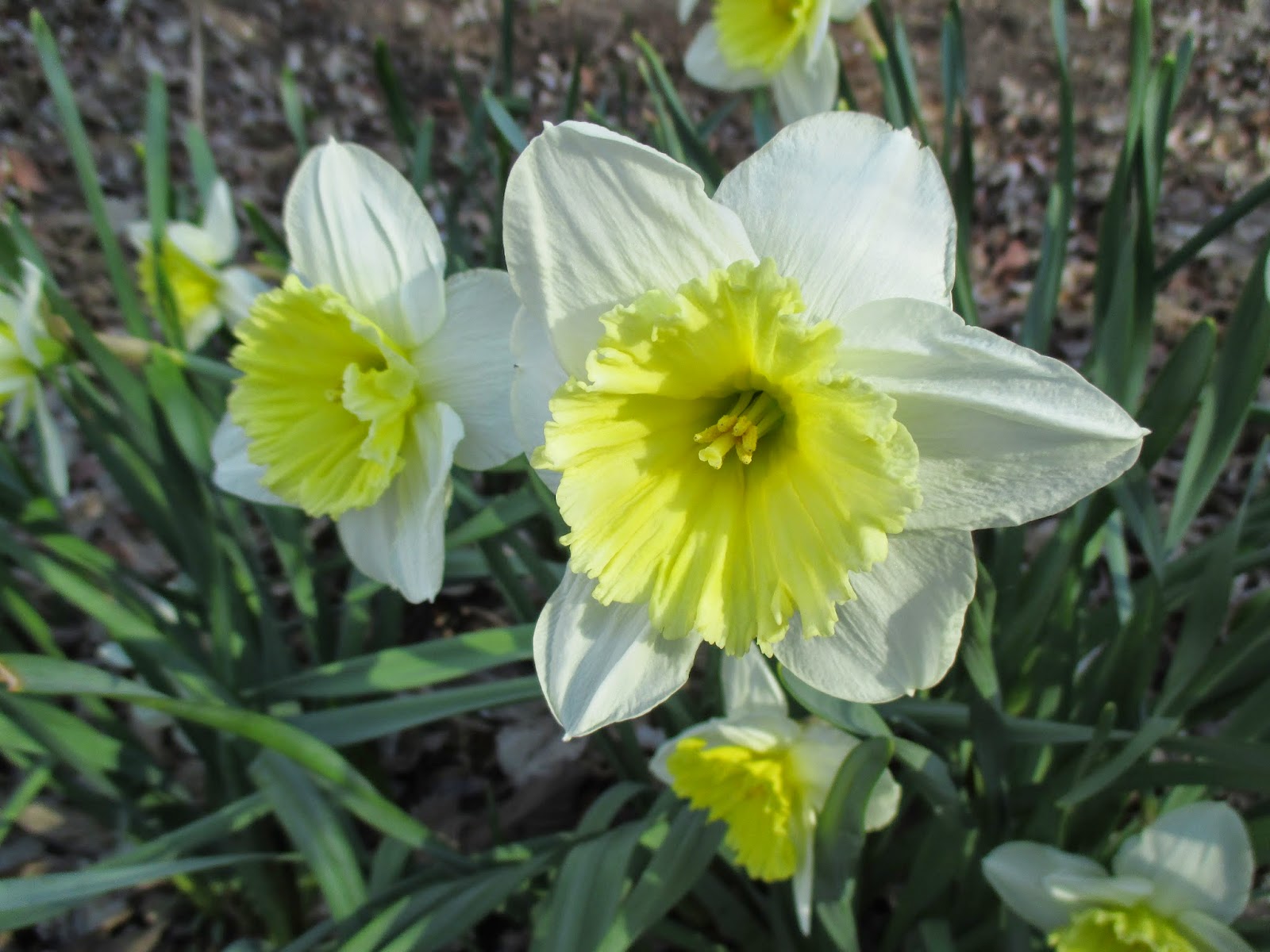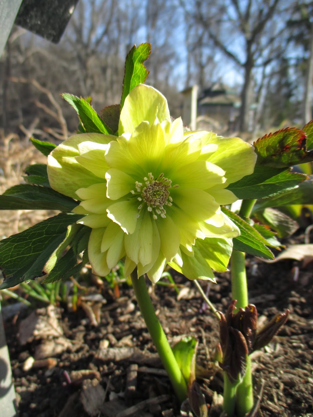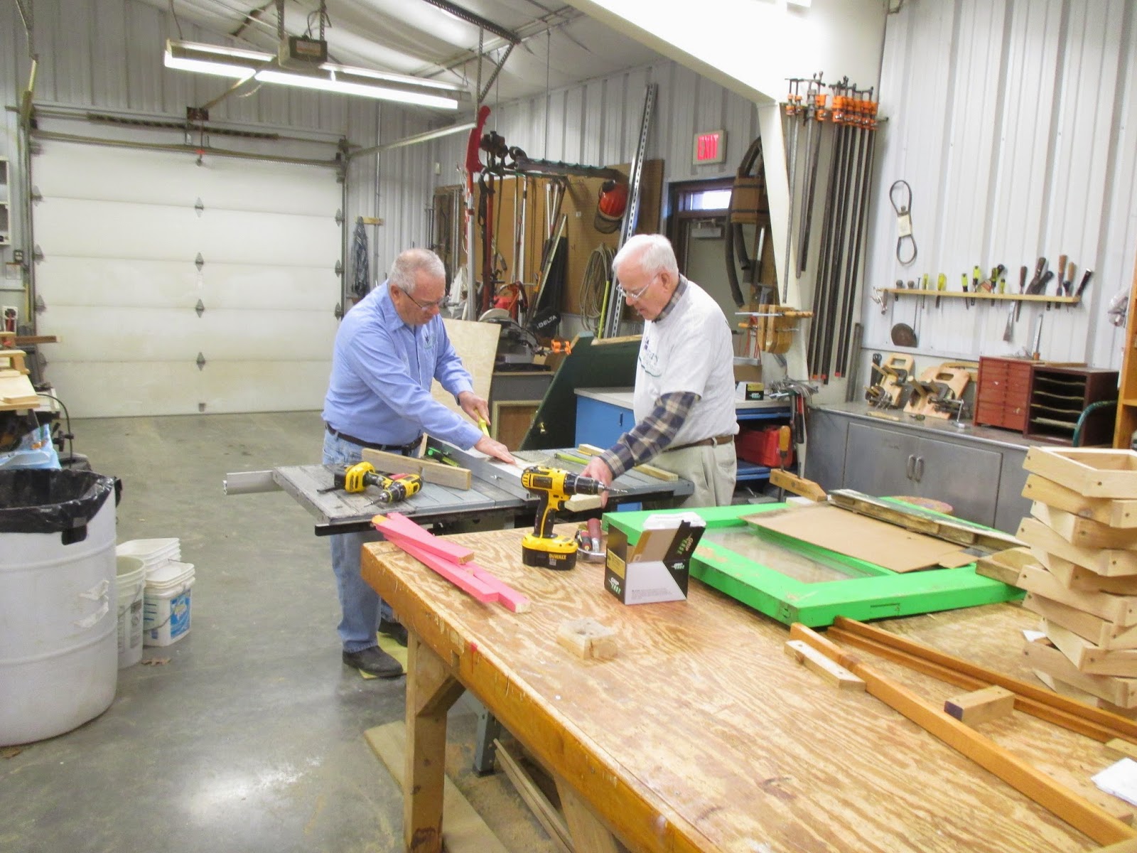 We had a very strong volunteer turnout today. Above are Alan (left) and Ron P. out hauling shredded bark to mulch the parking lot islands along with Larry H. and Lloyd (both below leaning on their forks and taking an early break..). The guys did a nice job collectively mulching a huge area and were joined by Gene later in the morning. The second photo down shows Ron R. (left) and Bob C. composting multiple areas that will ultimately be planted with seasonals this spring. Rollie (third photo down) was in as was Jenny M., (painting), Dr. Gredler (painting), Maury (errands), Del (cleaning), Marsha (photography) and many others. Pat C. (fourth photo down) continued her assessment of labeling needs (repairs, replacements, etc.) in multiple areas and Gary was inside working on this same project as well as producing new labels for incoming plants. The fifth photo down shows (left to right), Peg, Kathy and Eva. The ladies did a great job with some early weeding and collected lots more debris from garden areas adjacent to the sunken garden. The sixth photo down shows John being hauled around by Terry…the guys brought up the “cutting display” bench as it’s that time of year to show folks what’s in bloom and where it’s located. Dick H. ran multiple loads to the dump while Ron Y. (seventh photo down) continued staining portions of the new cedar obelisks the guys are making (see Vern and Dave in the eighth photo down). Jim D. was part of that crew too and we also saw Bob D., Tina B., Harry M., Cheryl R. and many others today. See further below for more photographs from today.