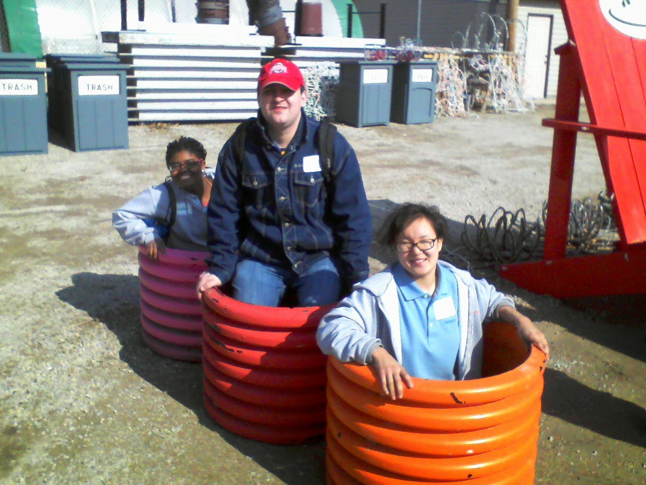 It was another chilly day with suspended disbelief that Spring is actually here. The birds are still chirping but the snow is still here for now! Above are some of our repurposed containers providing some bright coloration on this grey day. Below are three Shepherds College (Union Grove, WI) students last week enjoying these containers on a sunny day. The students visited last week and supplied pansies and petunias for the Spring Symposium and many were given to volunteers last night at our very successful Volunteer Soup Night. We had 80 people attend including a dozen or so new volunteers. It was a fun gathering and a did a presentation talking about volunteer opportunities, 2015 plans and I also promoted visitation to Anderson Japanese Gardens (Rockford, IL), the Ball Seed Trial Gardens (West Chicago, IL), the Paine Art Center and Gardens (Oshkosh, WI) and the Green Bay Botanical Gardens.