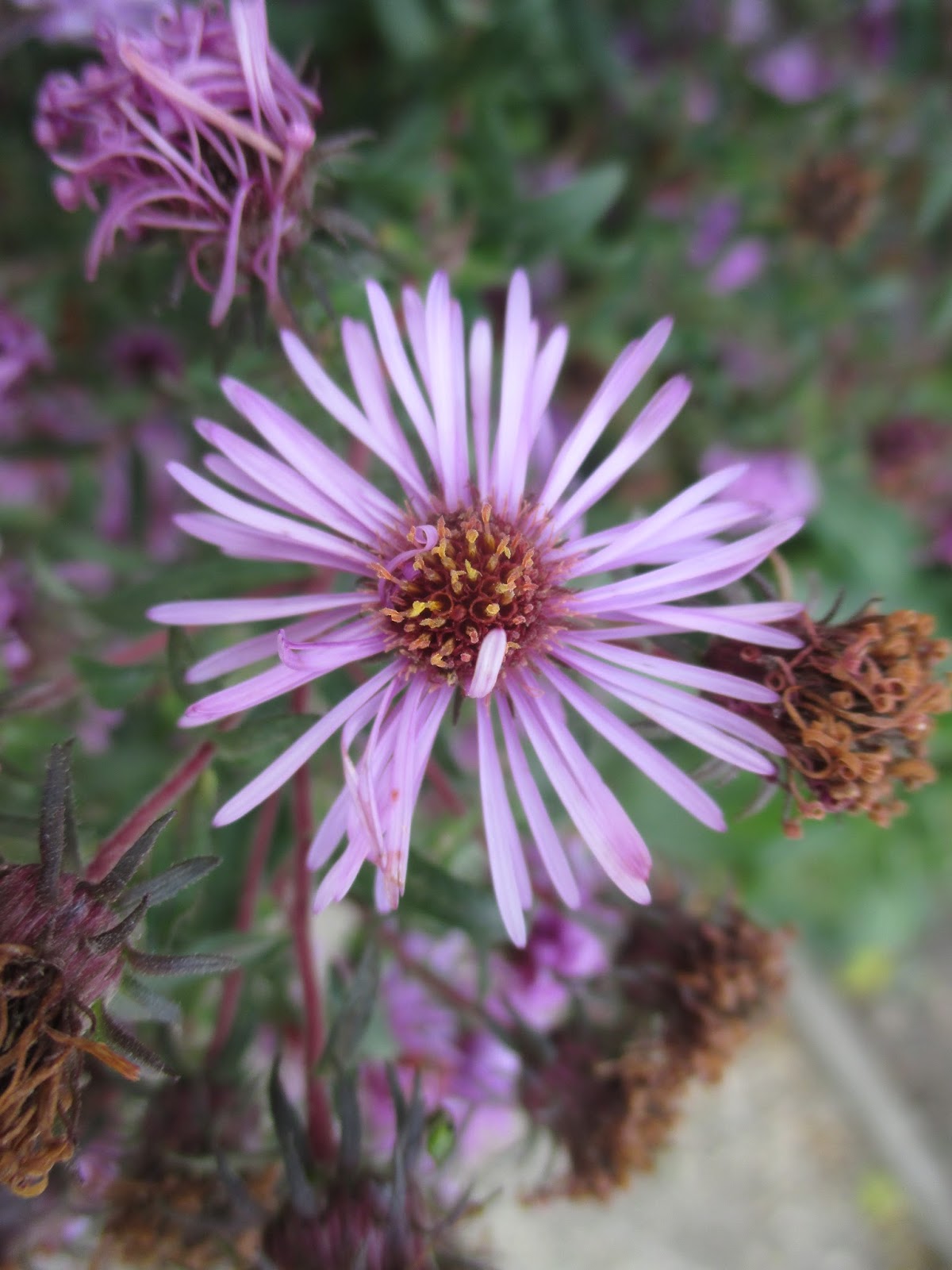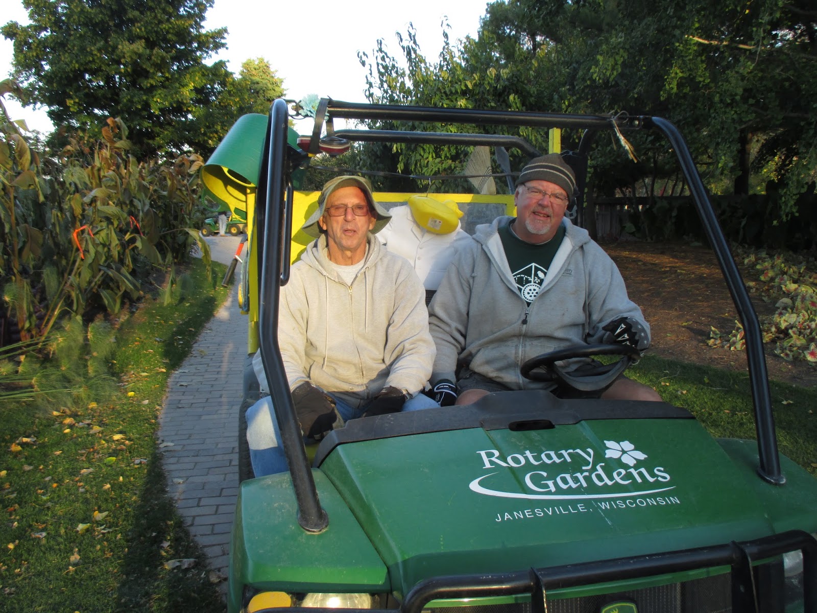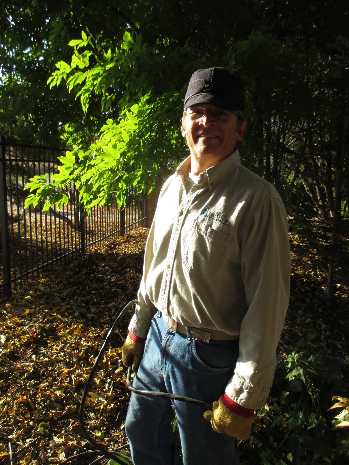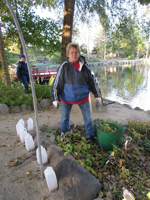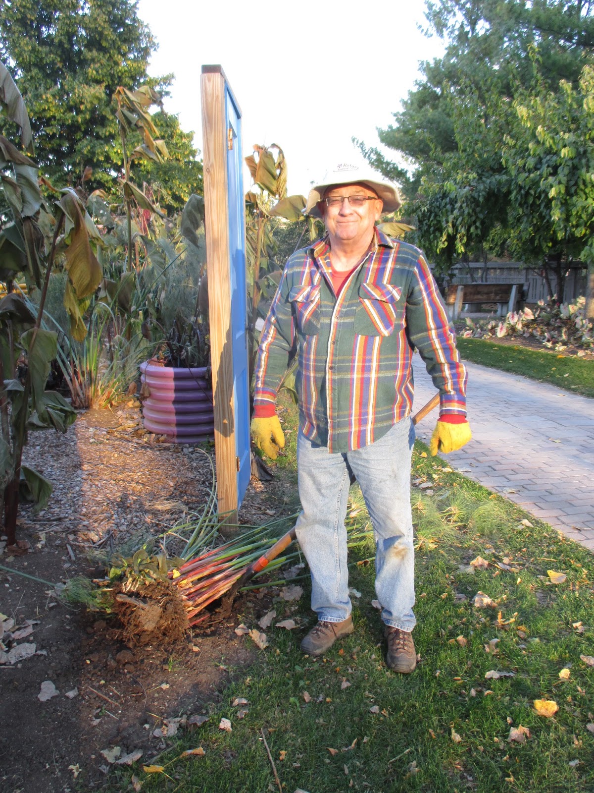 Our volunteer turnout was strong today. Alan (above) worked with Joe (below) on digging and removing plants from the Jungle Garden. Pat M. (second photo down) was in that area too bringing down and processing the two giant obelisks for the next use in the HLS. Many guys helped him lower these and Pat has it down to a science in terms of their relocation and conversion with lights. Ron R. (third photo down) started on leaf collection and later helped Alan and Joe with removals. Gary worked on some labels and Dr. Gredler was out mowing. Gary and Maury also went to pick up pumpkins for the youth education program and Maury went on many errands for us as well after winterizing some water features. The fourth photo down features Shirley, who along with Kathy (fifth photo down) and Eva, did a nice job clearing out perennials and leaves from the lower woodland walk. Vern and Jim had carpentry projects and we saw Kris K., Dr. Yahr and many others today as well.