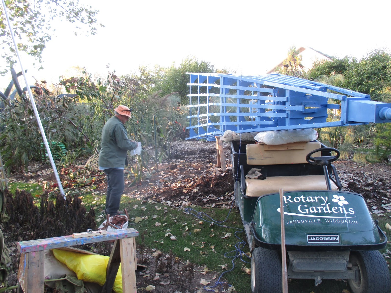 The grounds staff had a day filled with gardening and HLS tasks. Above are Terry (left) and Big John. The guys worked on removing plants, emptying containers, plenty of HLS set up and other odds and ends. Bob K. (directly below) ran our major power cords out in the gardens and had some other HLS-related tasks as well. Larry H. emptied containers, dug tropicals and put up a whole lotta lights today. Janice decorated obelisks and did some purging in the Thomas Jefferson Collection. Cindy had some gardening tasks and shifted to setting up our milk jug luminaries for the HLS. I was able to run quite a few cords today in between other tasks.