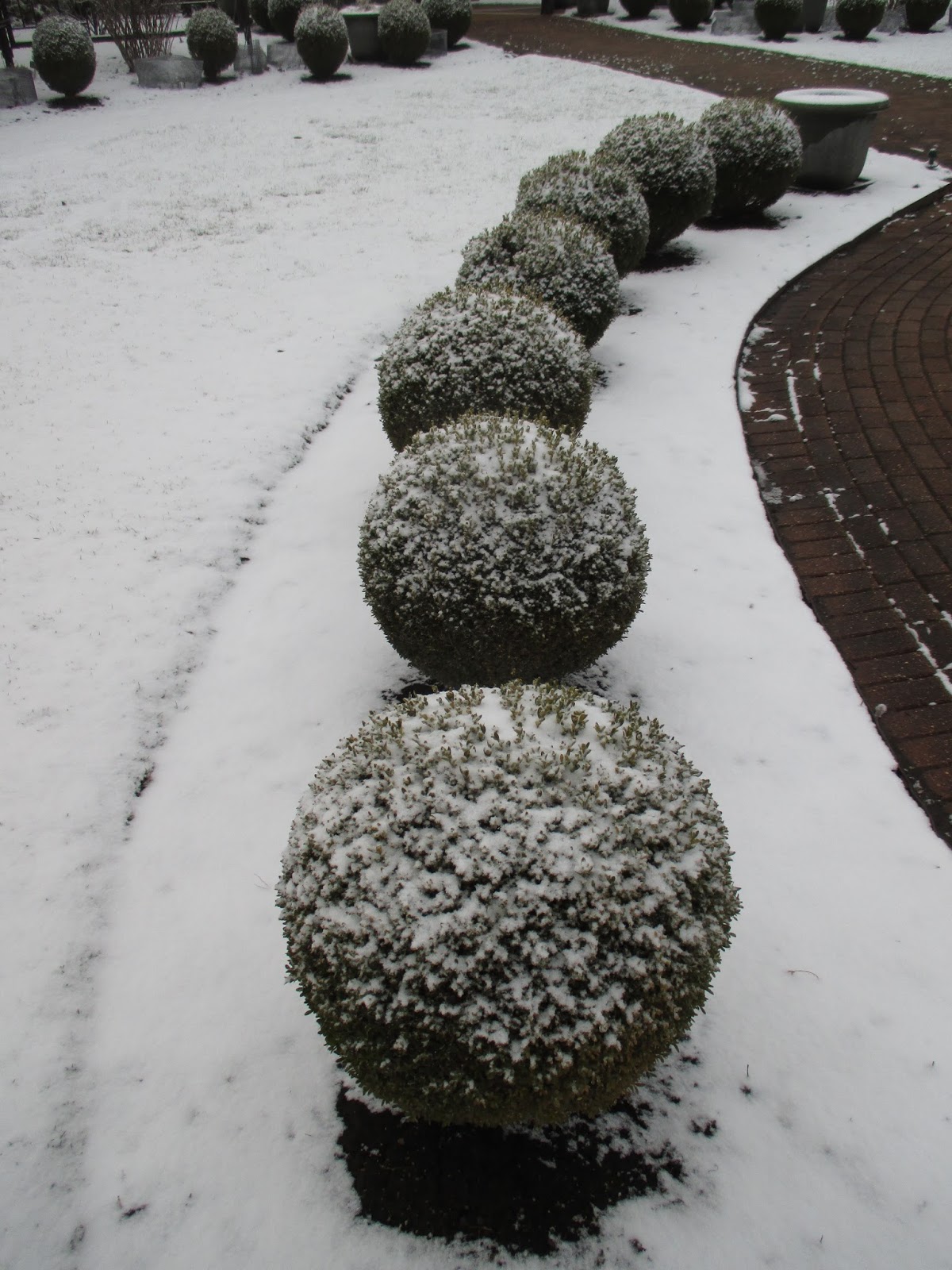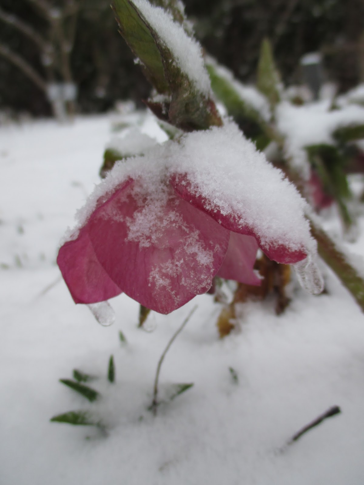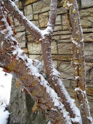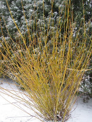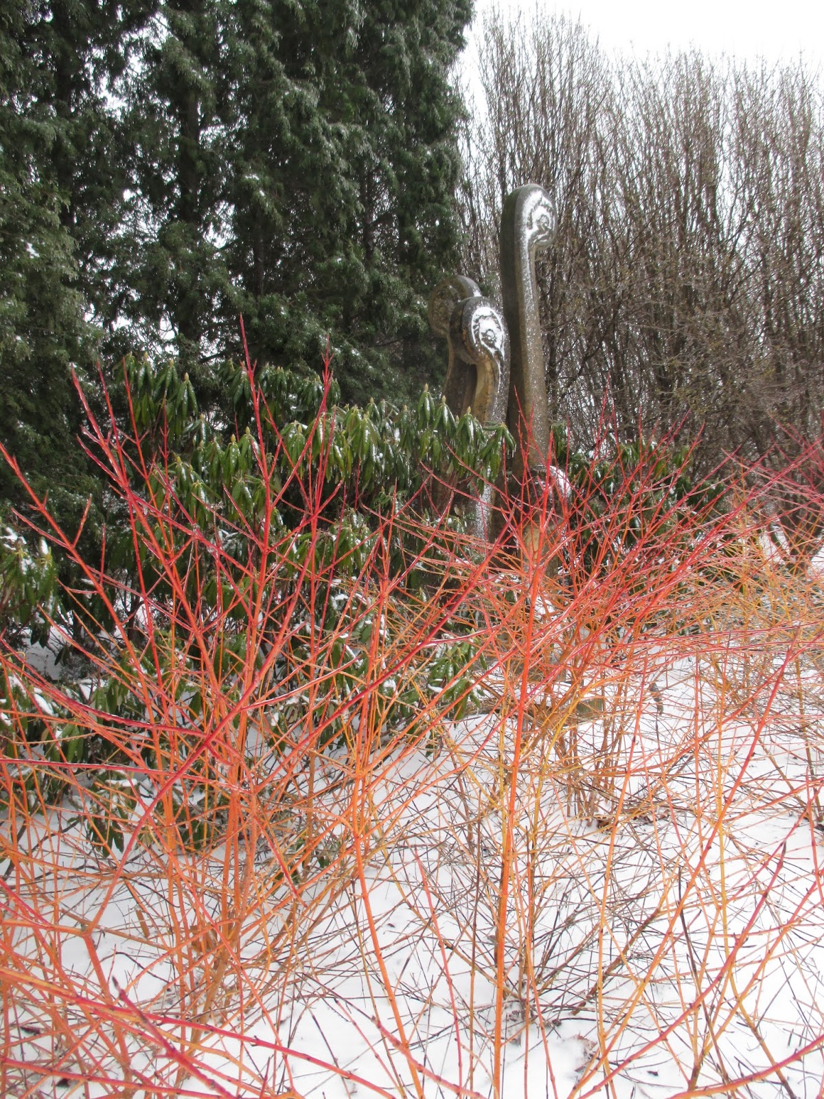 I had some presentations yesterday and travel conditions fluctuated between ok and bad. I was watching the temperature alternate between 30 and 34 degrees F and noted quite a few cars off the road later in the afternoon. With heavier snows further north, we were spared the worst of it but still had some white stuff come down. All the photos here are from Olbrich Botanical Gardens (Madison, WI) last evening when I arrived for my presentation (The Sensory Garden). I couldn’t resist a brisk (literally and figuratively) walk and had the gardens to myself. Above are some colorful dogwoods (Cornus sp.) featuring excellent winter interest with bright stems. The other photos below have captions.