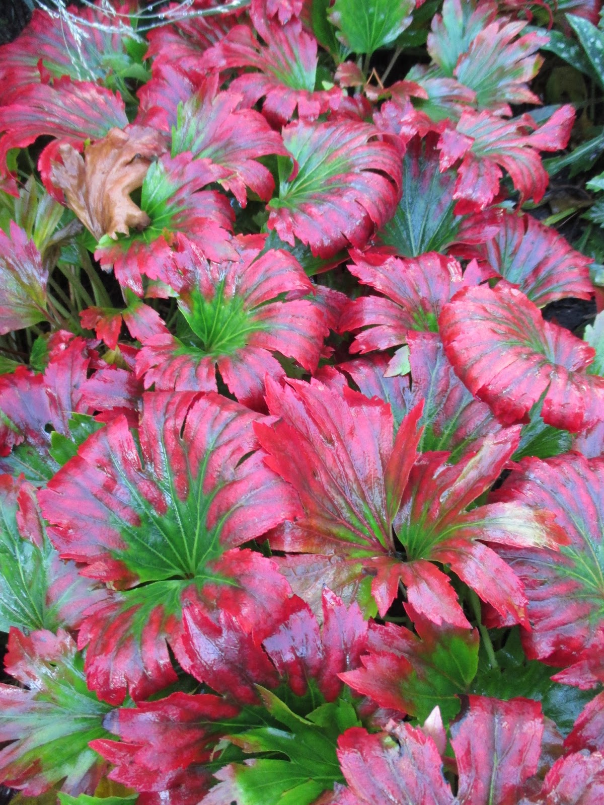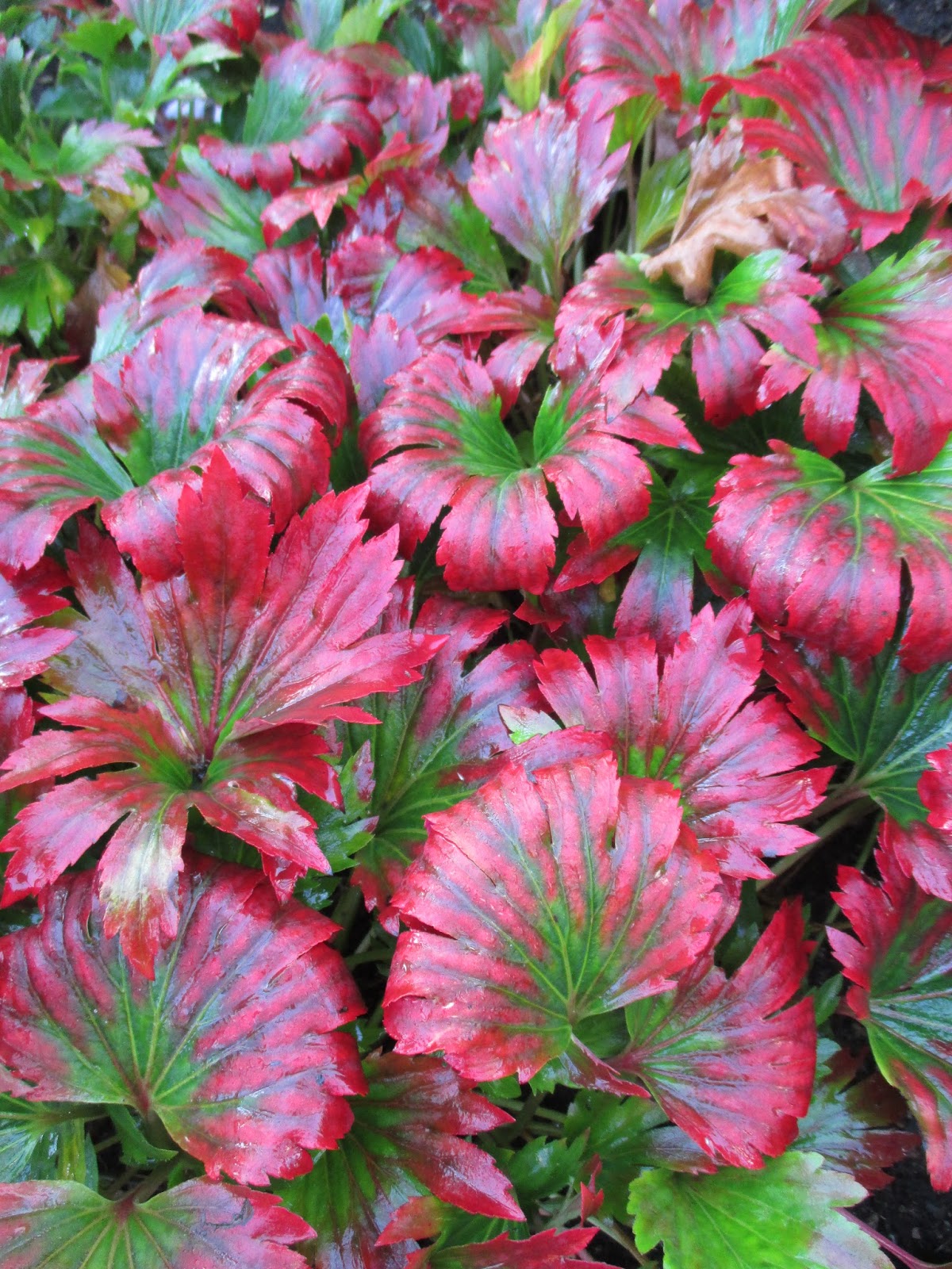 I’ve enjoyed growing this perennial for many years and photos like the one above will make any gardener appreciate the value of the late season coloration on these fanned, maple-like leaves of mukdenia (Mukdenia rossii ‘Karasuba’). This coral bells (Heuchera) relative is native to rocky slopes and ravines in China, Manchuria and Korea. Preferring moist, fertile and well-drained soils, this hardy perennial (to Z4) blooms in early spring (see below) and the foliage starts with red pigmentation on the leaf tips in summer with an increasing degree of red until frost. It is important to note that the variety ‘Karasuba’ is identical to ‘Crimson Fans’. Reaching 16″ or so in height and ultimately 24″ in width, this plant has thrived for us in part sun which it seems to prefer. Ample moisture is again important but the ornamental merit of this plant is quite evident in both Spring and Fall. It is important to note that these first three photos (taken at the Walters Gardens Trial Garden in Zeeland, MI) are the best shots I’ve taken of this perennial later in the season. The degree of red seems to vary each year and those with more sun seem to have stronger coloration. Regardless, this perennial has a bright future in our partly shaded garden!