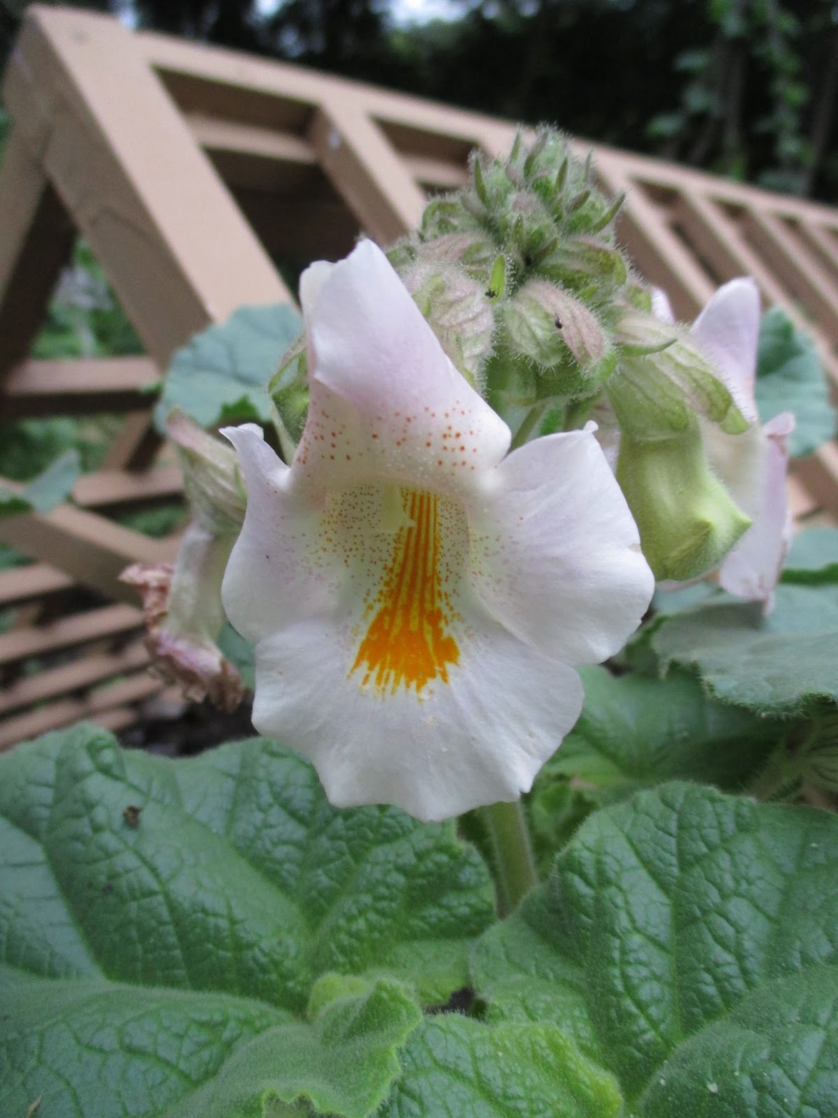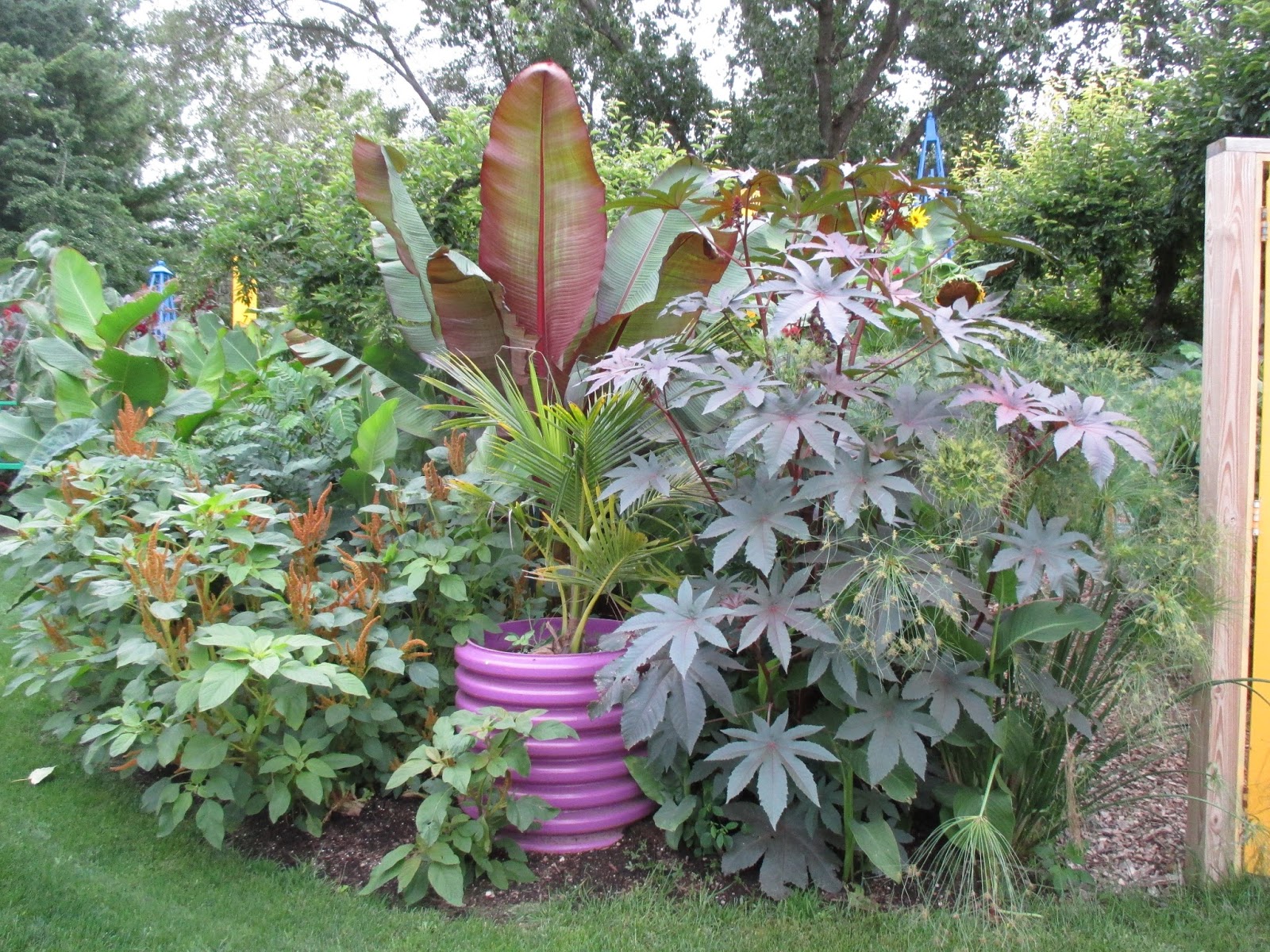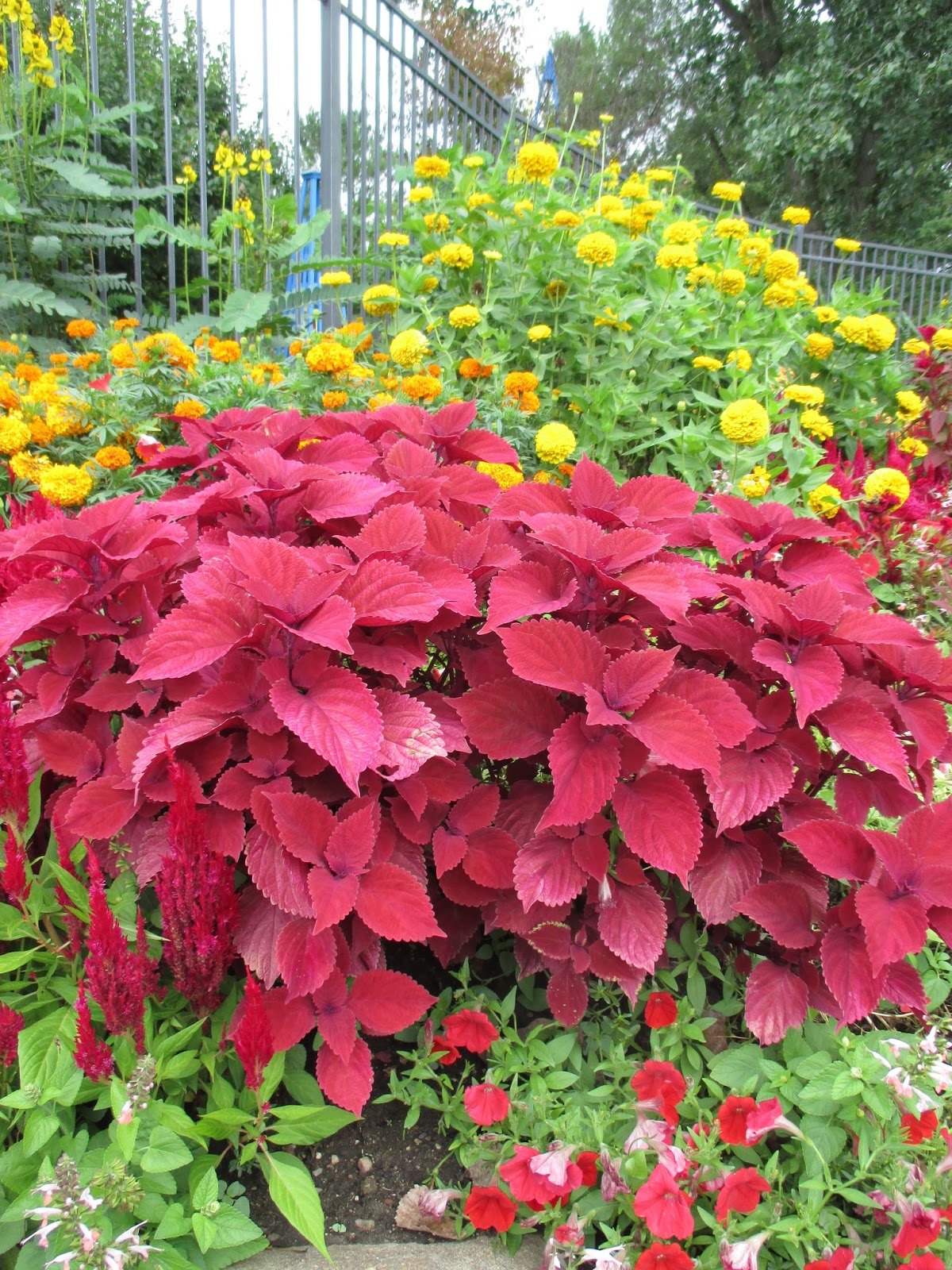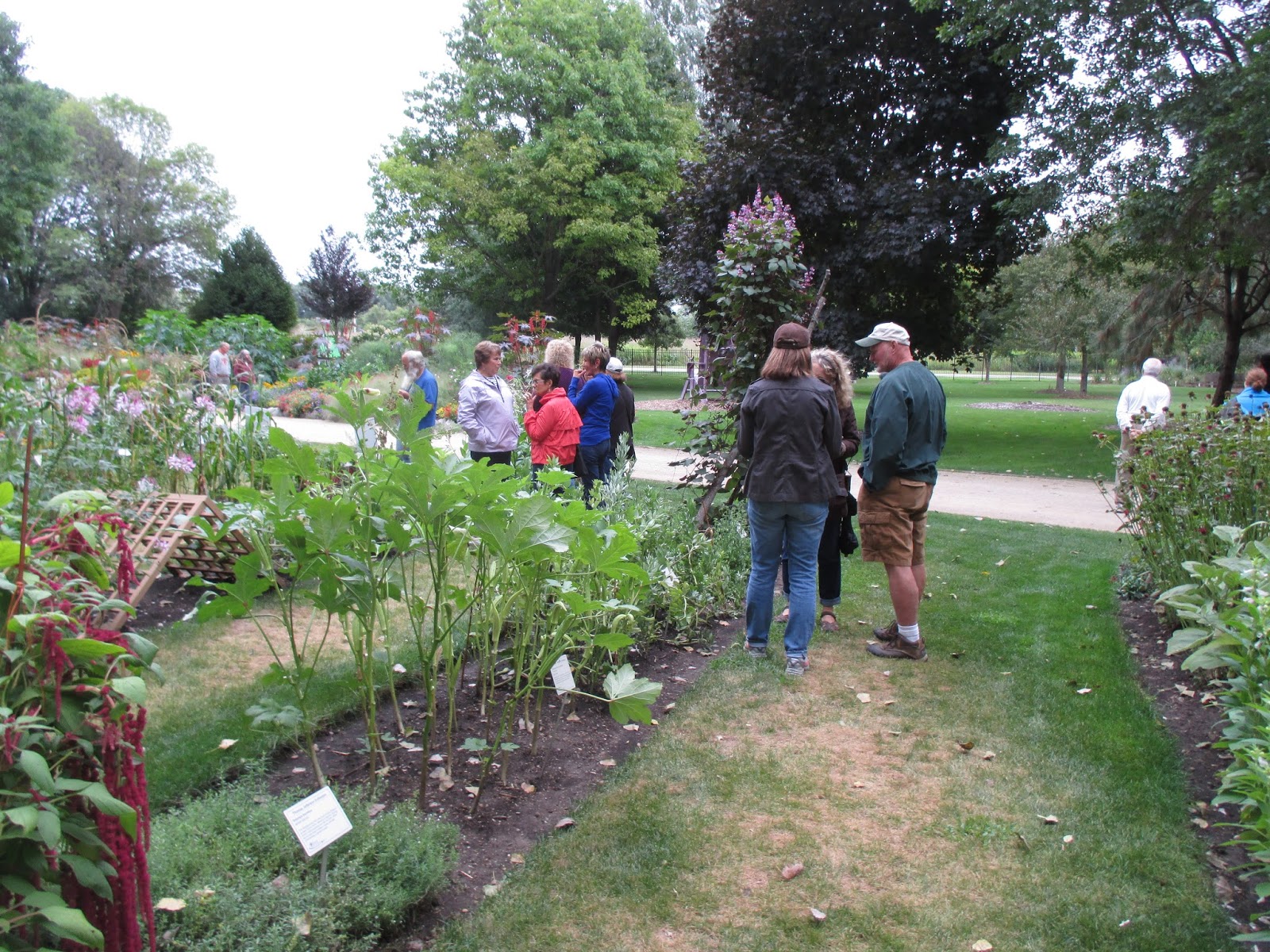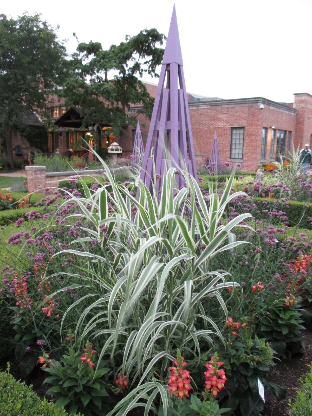 Today was primarily overcast with a cool breeze. Temperatures only made it to the low 70 degrees F which was perfect gardening weather although a little more heat would be nice for our annuals and tropicals. We saw lots of visitors today including a bus tour from Waukesha, WI. The gardens continue to look great. Above is the Druid in the distance (reception garden) with silver spurflower (Plectranthus argentatus) and feathertop grass (Pennisetum villosum) creating a nice combination in that space which is primarily blue, white and silver. We had an excellent volunteer turnout today and our grounds crew had a very productive day as well.