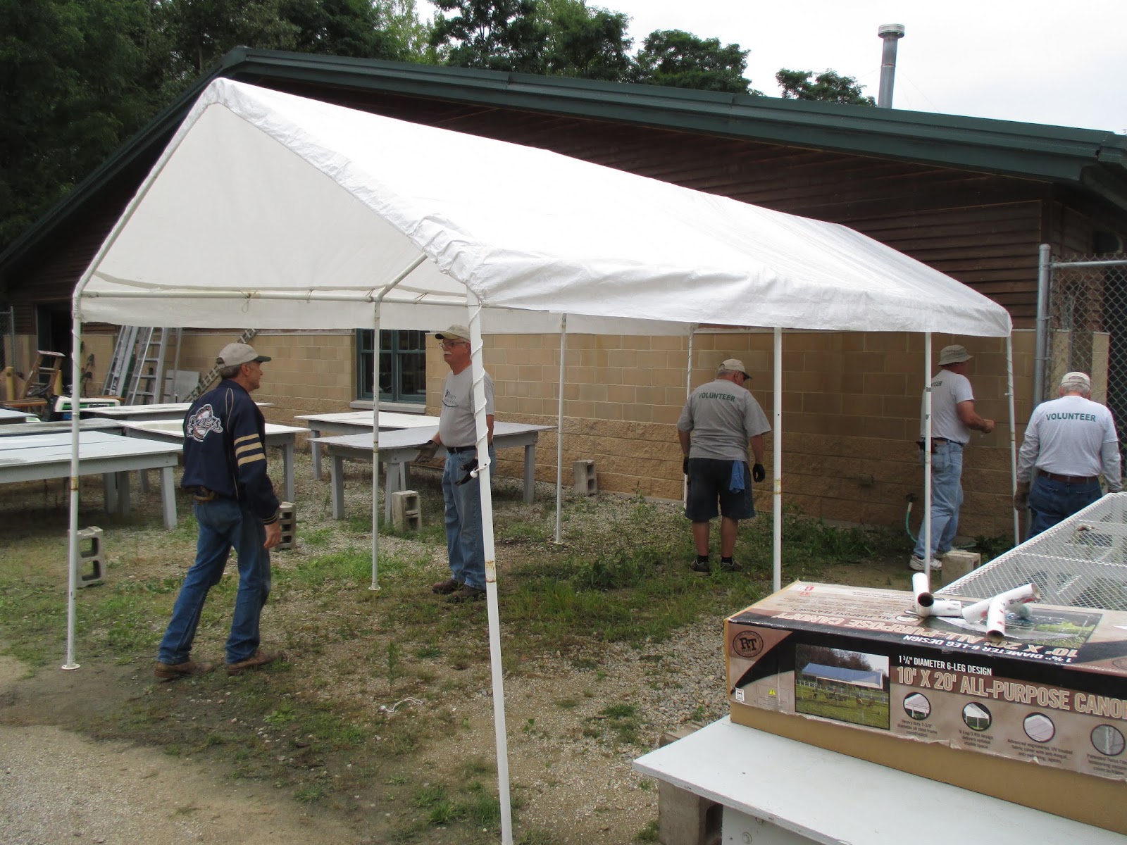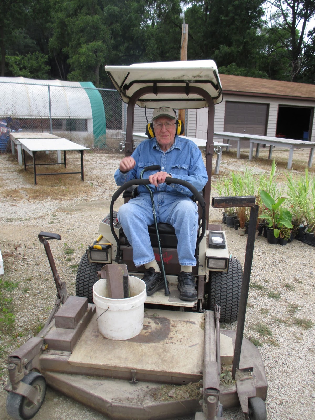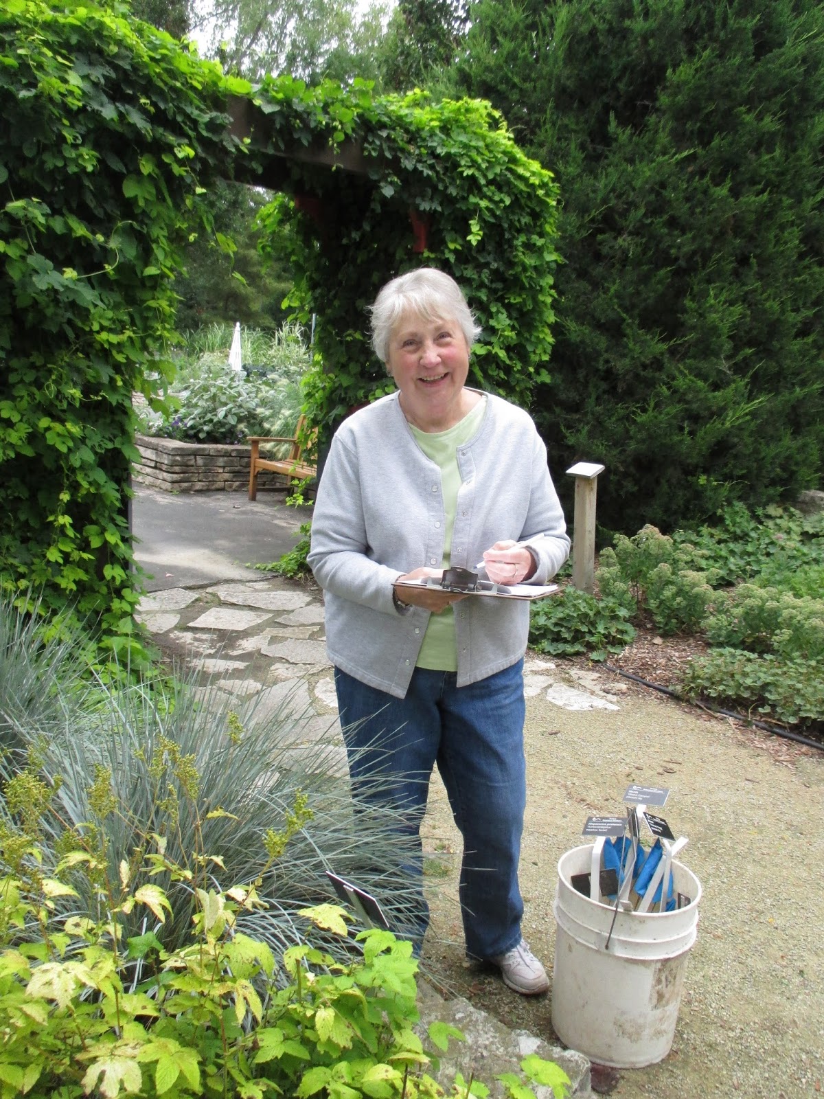 Thursday continues to be a strong day for volunteerism. The photo above featuring Myrt (left) and Mary was from late yesterday as the ladies did a nice job weeding in multiple areas. Directly below are Larry H., Ron R., Ron P., Gary and Lloyd putting up tents for the Fall Plant Sale which begins in about three weeks. The sale is on Saturday and Sunday, September 12th and 13th (9 am – 4 pm daily) although RBG Friends members are invited to a pre-sale on Friday, September 11th (same hours) where they receive “pick of the litter” and 10% off (discount extended throughout the entire sale). We get the tents up early so we can get the yard arranged and ready to accept the influx of plants! The guys moved on to some other activities after putting up six tents. Alan M. was in for tidying in the sunken garden and Hal and Doris primped their assigned garden area. The second photo down shows Suzie (left) and Bonnie who were working also with Winifred and Peg on some serious weeding issues along our frontage berm. The ladies collected lots of weeds and debris. The third photo down shows Sandi, Kathy and Eva (left to right) as the ladies did a great job tidying up the front slope which needed their attention. Pat C. (fourth photo down) was here most of the day working on inventorying and producing labels for three garden areas. She does a nice job and we’re slowly catching up on the more permanent labels (perennials, trees and shrubs). Dr. Gredler (fifth photo down) was in for his mowing duties and I think Rollie was here too. Our carpenters (Dave, Jim, Vern and Ron Y.) were in for a wide range of projects. We also saw Patrea, Bev D., Pat M. and many others today.