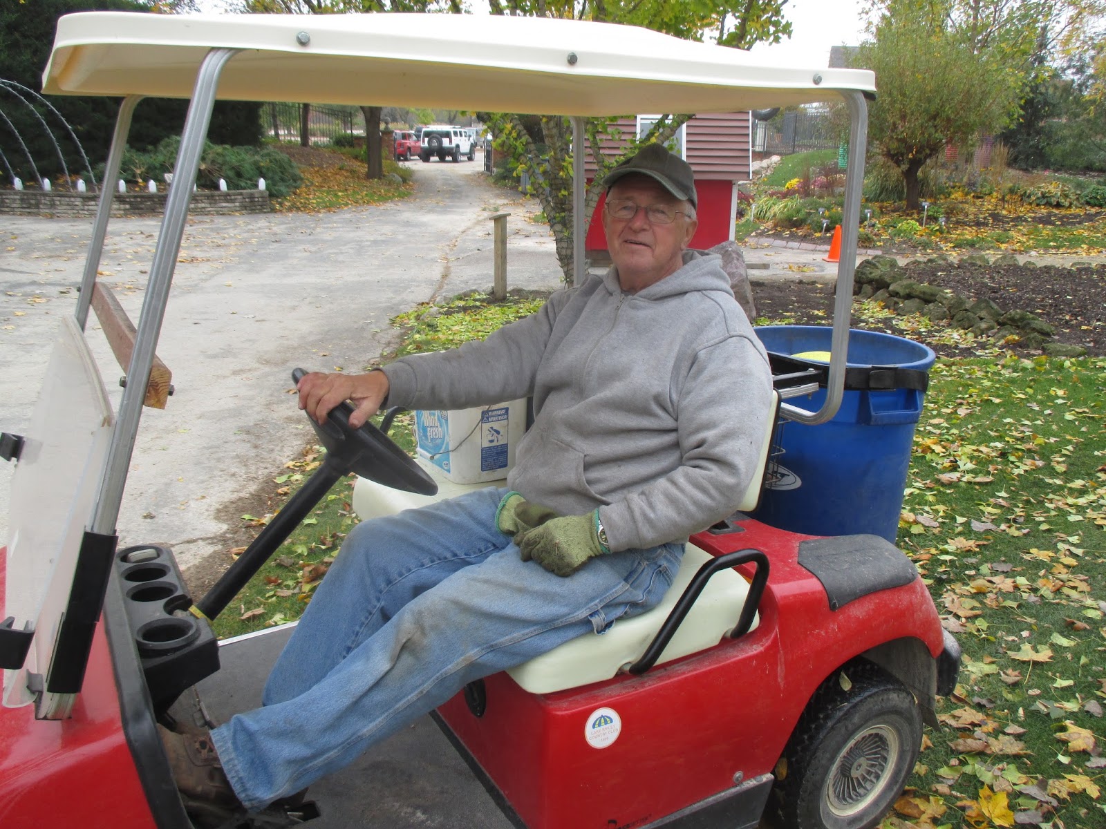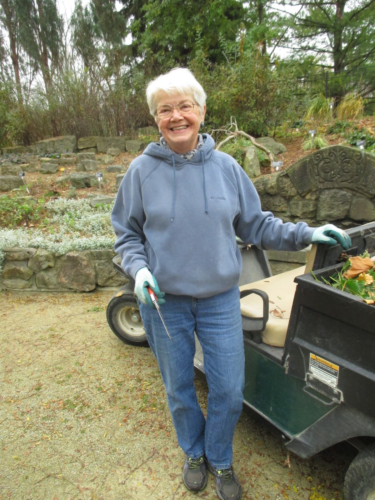 Our stalwart volunteers continue to be so essential at the gardens on a day to day basis. Above are Kathy (left) and Eva ready to head out in the gardens. The ladies, later joined by Dave, focused on finishing clearing the formal perennial gardens and then worked in the upper Japanese garden for clean-up. Marv (below) worked on his two moss areas which look quite vivid. Kay (second photo down) took a big chunk out of the tidying needs in the Scottish garden which needed her attention. Dr. Gredler came in for some mowing duties and Maury ran errands. Pat M. worked on his other “Tower of Power” for the HLS. The Chestnut House volunteers (third photo down) helped with some significant leaf clean-up with help from Janice. Dick H. was in to run to the dump and helped stake trees for the HLS too with John and Terry.