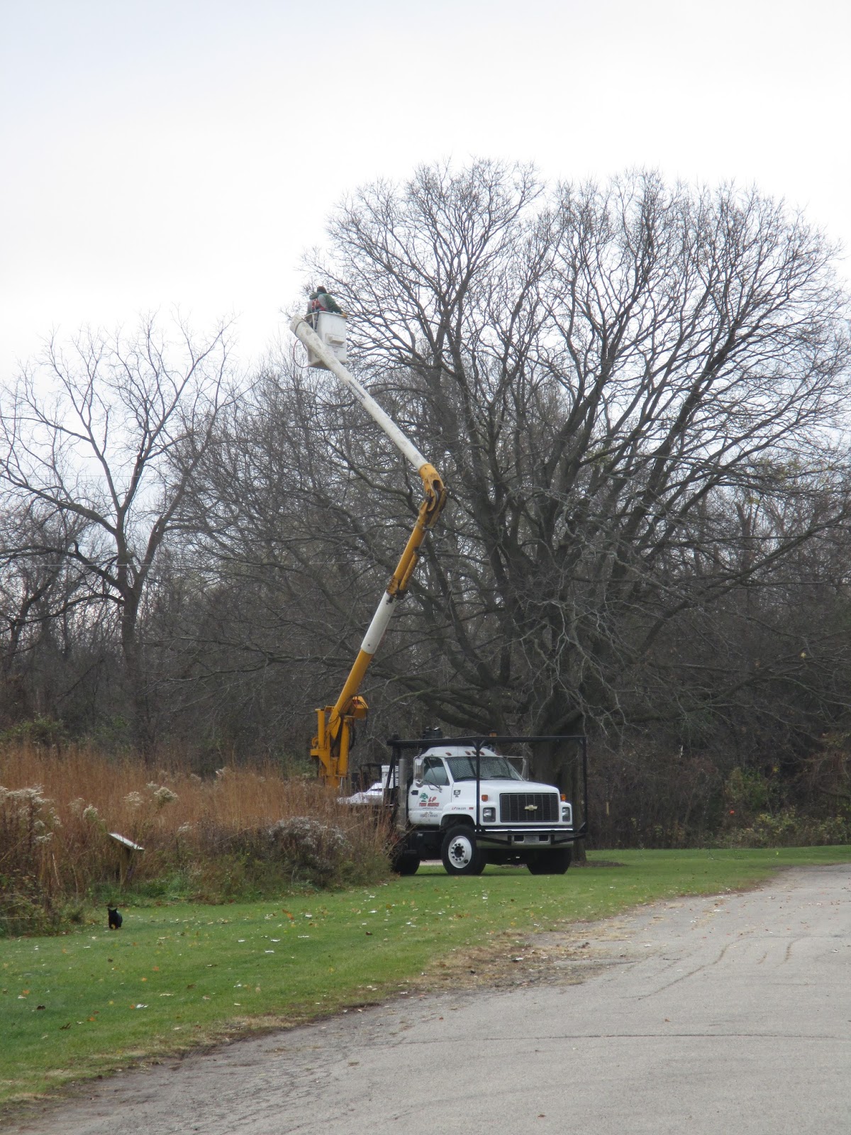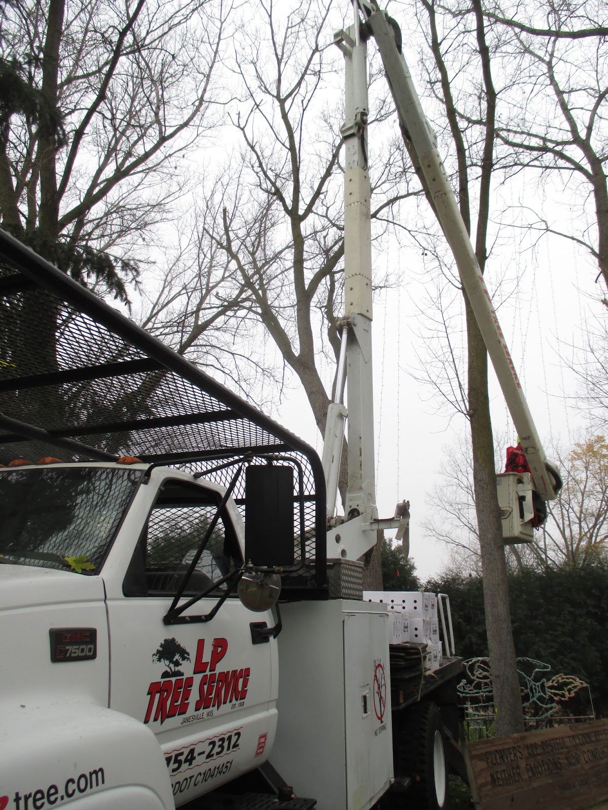 John (second photo down) and Paul from L.P. Tree Service (www.lptree.com/#/) hung lights all day at the gardens with two of their bucket trucks (see above and below). The guys did a great job which included putting lights on the Parker Education Center. Thanks to John, Paul and Chris for the donated time and sponsoring this event for the 17th straight year! We’ll see the boys back next week to finish up hanging almost 500 dangling icicle lights! Larry H. was a big help in running back and forth to help the guys out too!