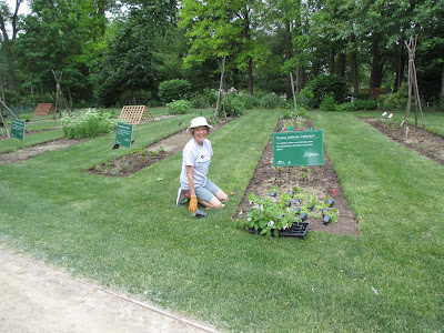 The grounds staff had a busy day as usual. Larry ran irrigation, mowed, watered and put on the hip boots to clear out the water movers on the pond. Big John hauled out containers, hanging baskets, watered and went on a fruitful plant run. Janice helped with volunteers throughout the day and put some serious time in to continuing the planting in the Thomas Jefferson Collection. I hauled plants around, watered and surprisingly didn’t hardly sit down at the desk! More photos below!