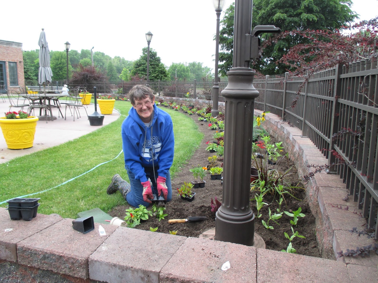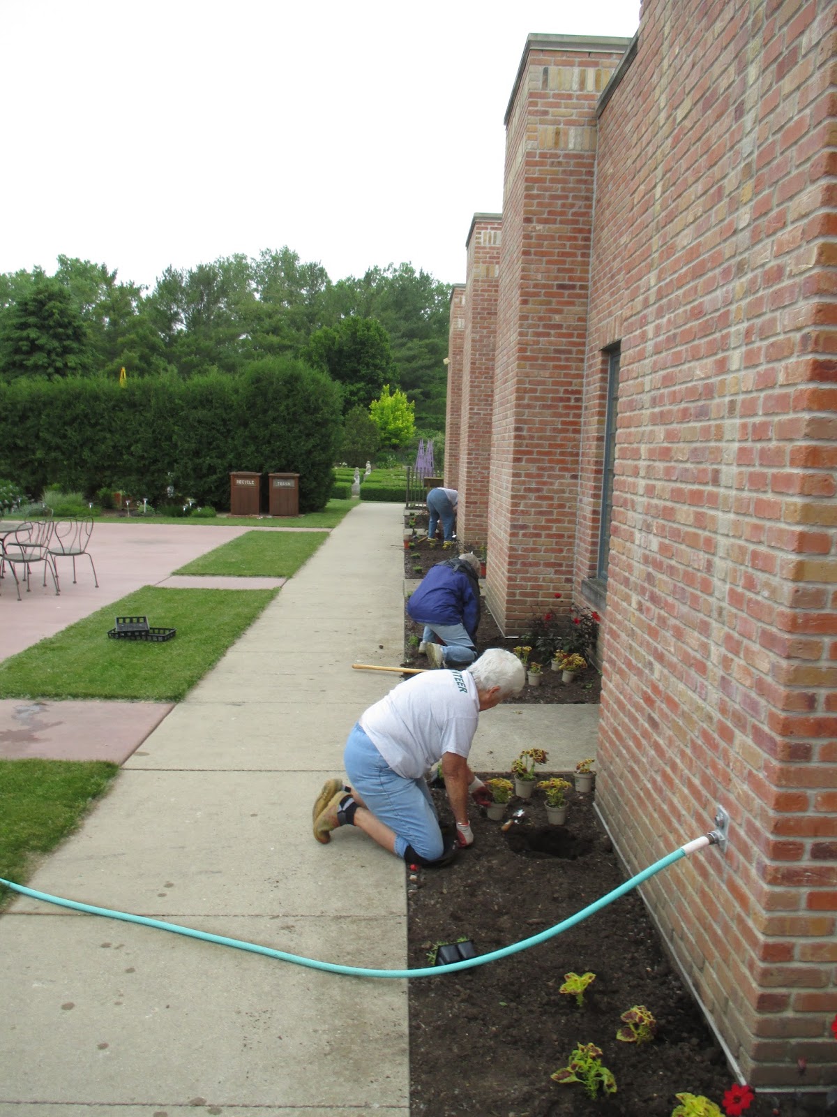 I would need to write a short novella to capture all the volunteers and their accomplishments today. These photos capture just some of the diverse activities like edging (Ron R. and Ron P. above)… Other activities included watering, planting, painting, carpentry projects, mowing, weeding, etc. I’ve labeled the photos but special thanks to Ron R., Ron P., Larry H., Alan M., Bob T., Pat M., Kathy P., Eva, Sandi, Mary R., Bonnie, Peg L., Marilyn H., Suzie, Vicky, Jumbo Jim, Dr. Gredler, Rollie, Cheryl D., Polly, Maury F., Kay F., Bob K., Dick H., Vern, Dave, Jim D., Ron Y., Art H., Joel R., Mary Ann G., Hal, Doris, Gary S., Janet M. and many volunteers from the Chestnut House.