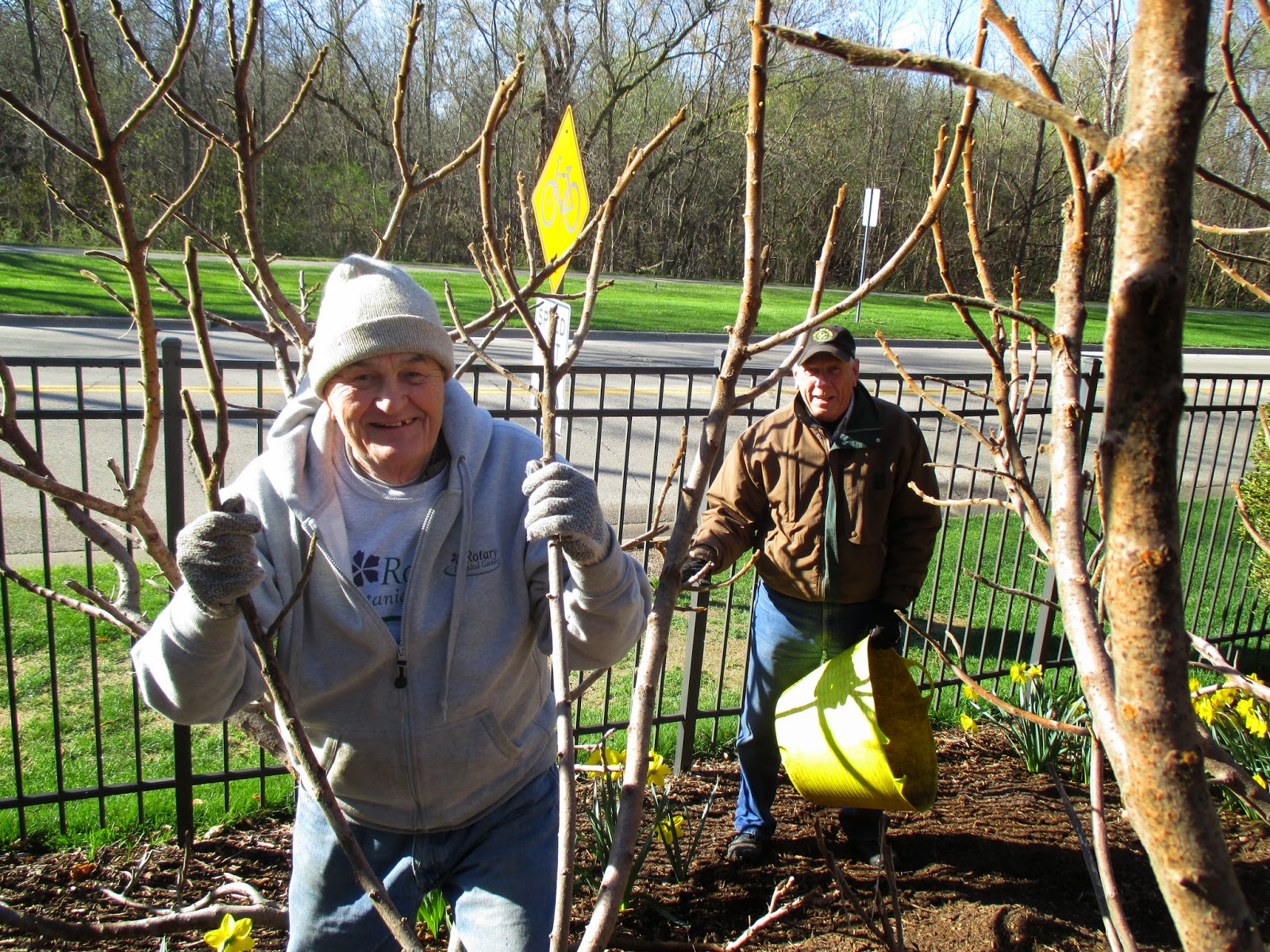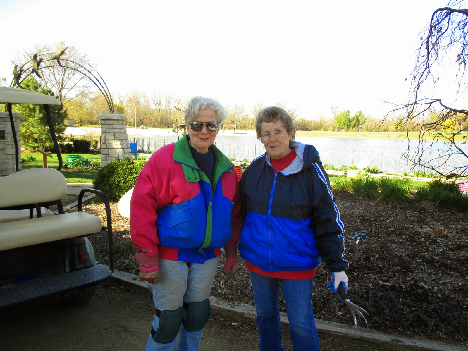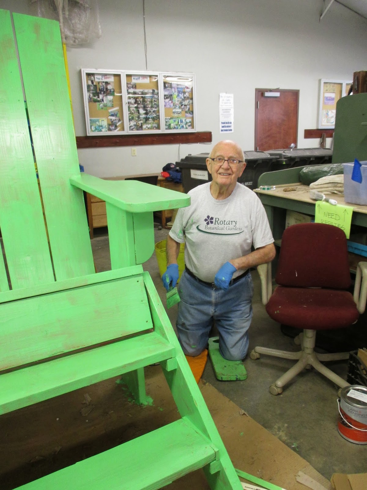 Our volunteers were very productive today…even Bob and Ron seen above (Bob to the left). These guys did a great job mulching a huge area. Ron P. and Alan M. teamed up in the arboretum to weed the tree circles and continue mulching. Below are Larry H. (left) and Ron R. spreading compost on one of two large areas that will benefit from their efforts. Pat M. was in for more work on the giant obelisk. Our mulching team included Sandy (second photo down) and Peg and Kathy (seen in the third photo down). Using the mulch stockpiled by Big John, the ladies did a great job mulching a large area near the Nancy Yahr Memorial Children’s Garden. The fourth photo down shows Bob K. (driving), Dave T. (passenger) and Ron Y. (back seat) heading out for some carpentry work. The guys worked on a couple different projects. Maury ran errands for us and we also had help from Mary Ann G. (fifth photo down) who helped work on labels for the Thomas Jefferson Collection and assisted Gary (sixth photo down) with additional label preparations. Our painters included Dr. Gredler and Del (further below) and the boys continued work on our giant Adirondack chairs. Dr. Gredler also went out to aerate some lawns. Bill O. was in for painting as well. Kay was in later to tidy up her area and Stan did significant work in the Japanese garden today. We also saw Rollie, John J. and many others today.