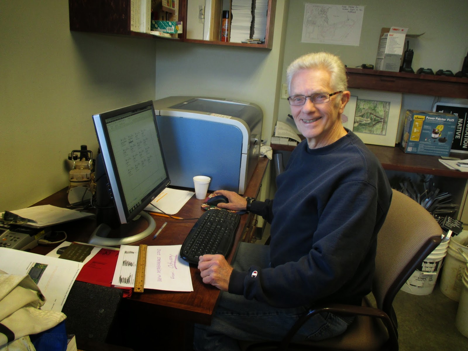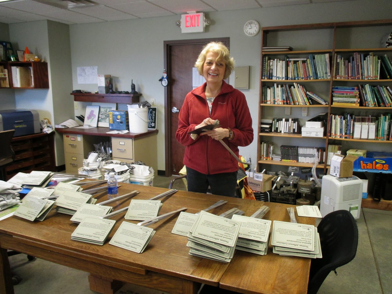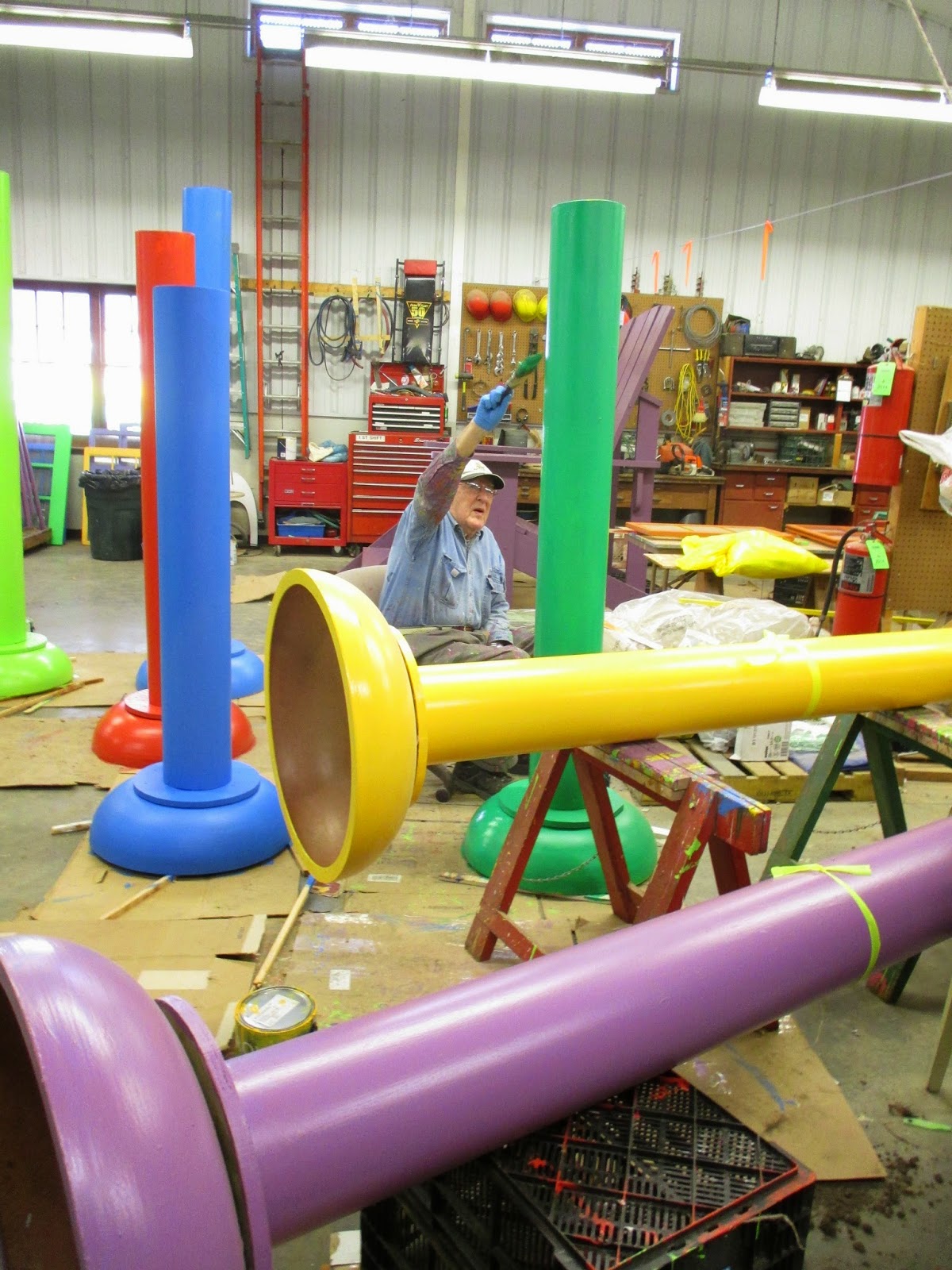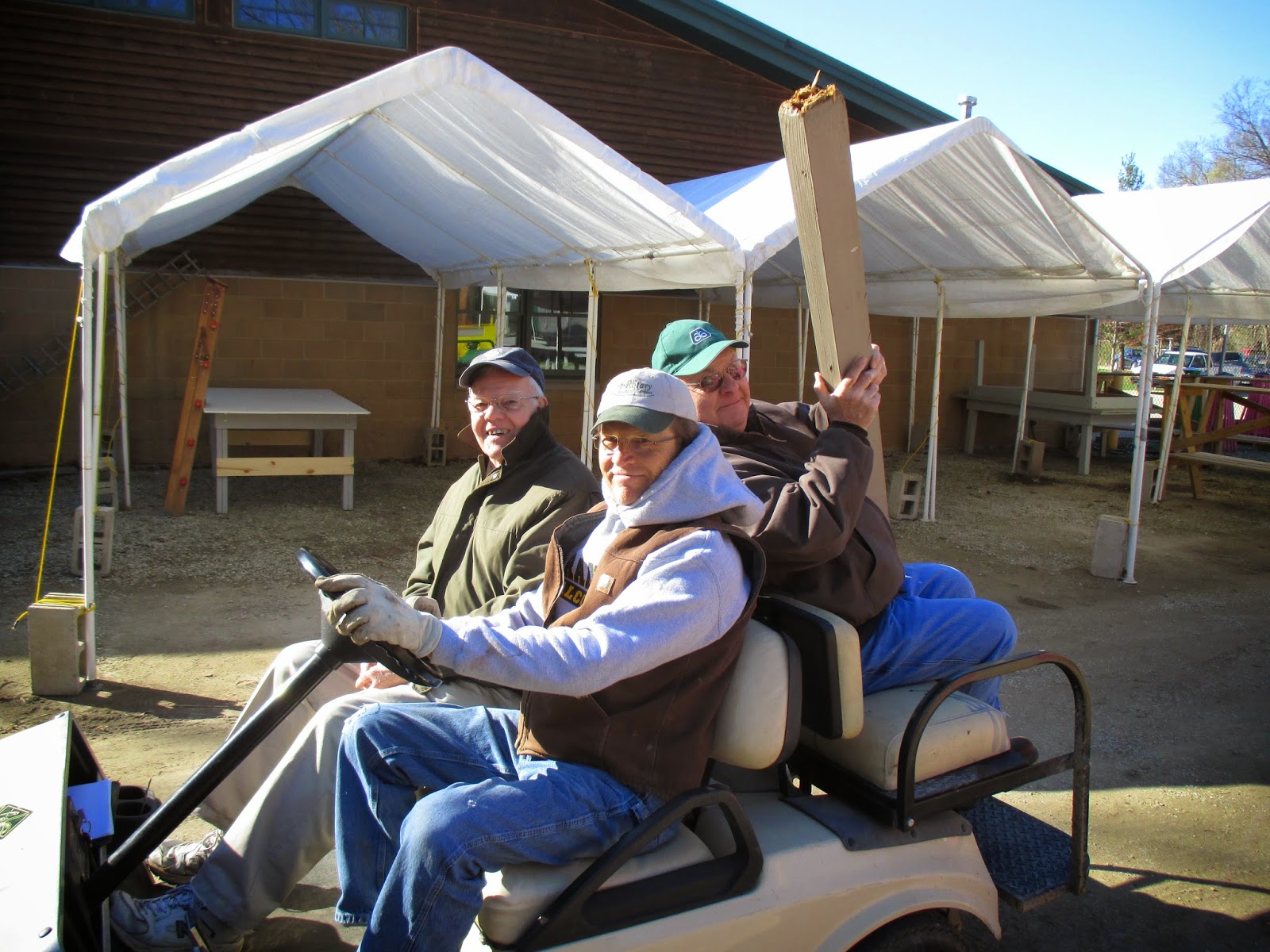 Our volunteers were very productive today…even Bob and Ron seen above (Bob to the left). These guys did a great job mulching a huge area. Ron P. and Alan M. teamed up in the arboretum to weed the tree circles and continue mulching. Below are Larry H. (left) and Ron R. spreading compost on one of two large areas that will benefit from their efforts. Pat M. was in for more work on the giant obelisk. Our mulching team included Sandy (second photo down) and Peg and Kathy (seen in the third photo down). Using the mulch stockpiled by Big John, the ladies did a great job mulching a large area near the Nancy Yahr Memorial Children’s Garden. The fourth photo down shows Bob K. (driving), Dave T. (passenger) and Ron Y. (back seat) heading out for some carpentry work. The guys worked on a couple different projects. Maury ran errands for us and we also had help from Mary Ann G. (fifth photo down) who helped work on labels for the Thomas Jefferson Collection and assisted Gary (sixth photo down) with additional label preparations. Our painters included Dr. Gredler and Del (further below) and the boys continued work on our giant Adirondack chairs. Dr. Gredler also went out to aerate some lawns. Bill O. was in for painting as well. Kay was in later to tidy up her area and Stan did significant work in the Japanese garden today. We also saw Rollie, John J. and many others today.