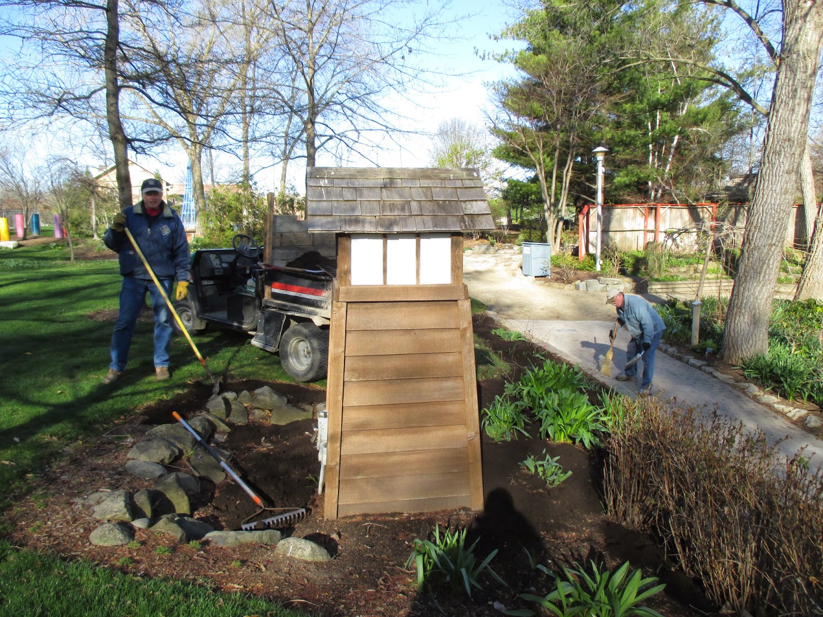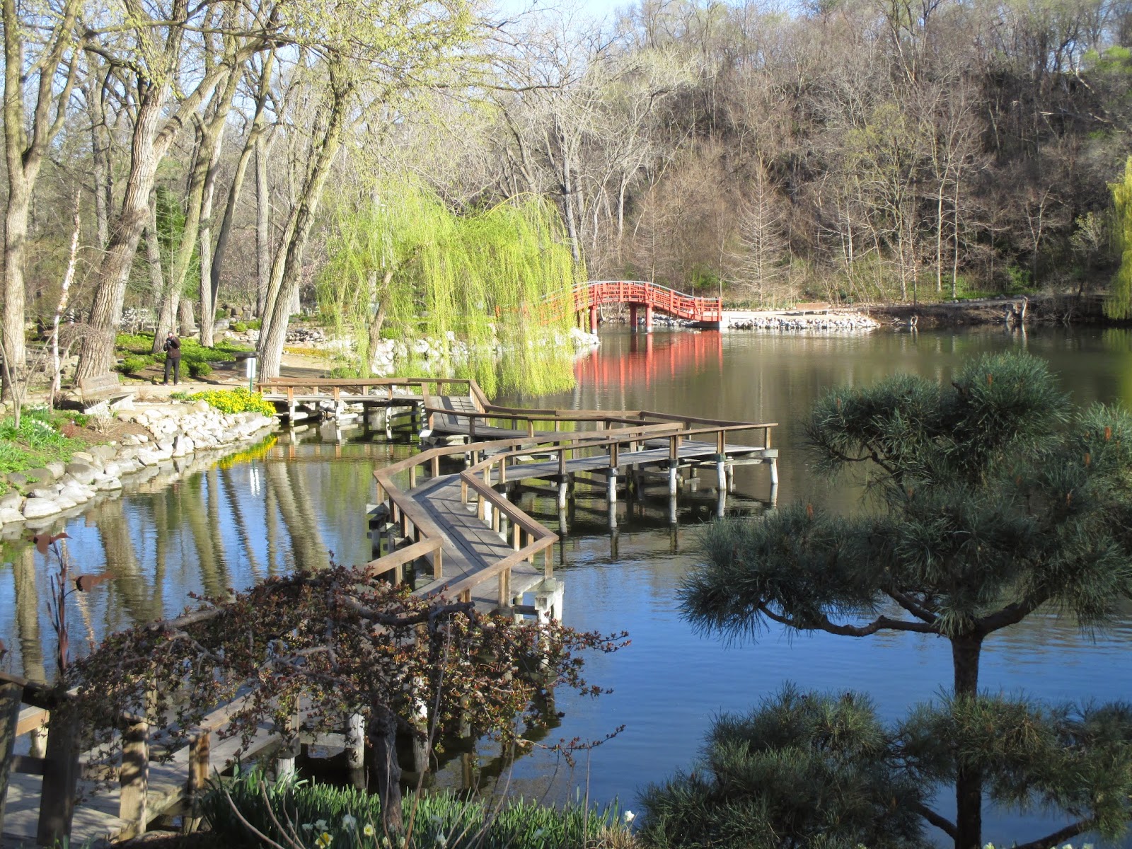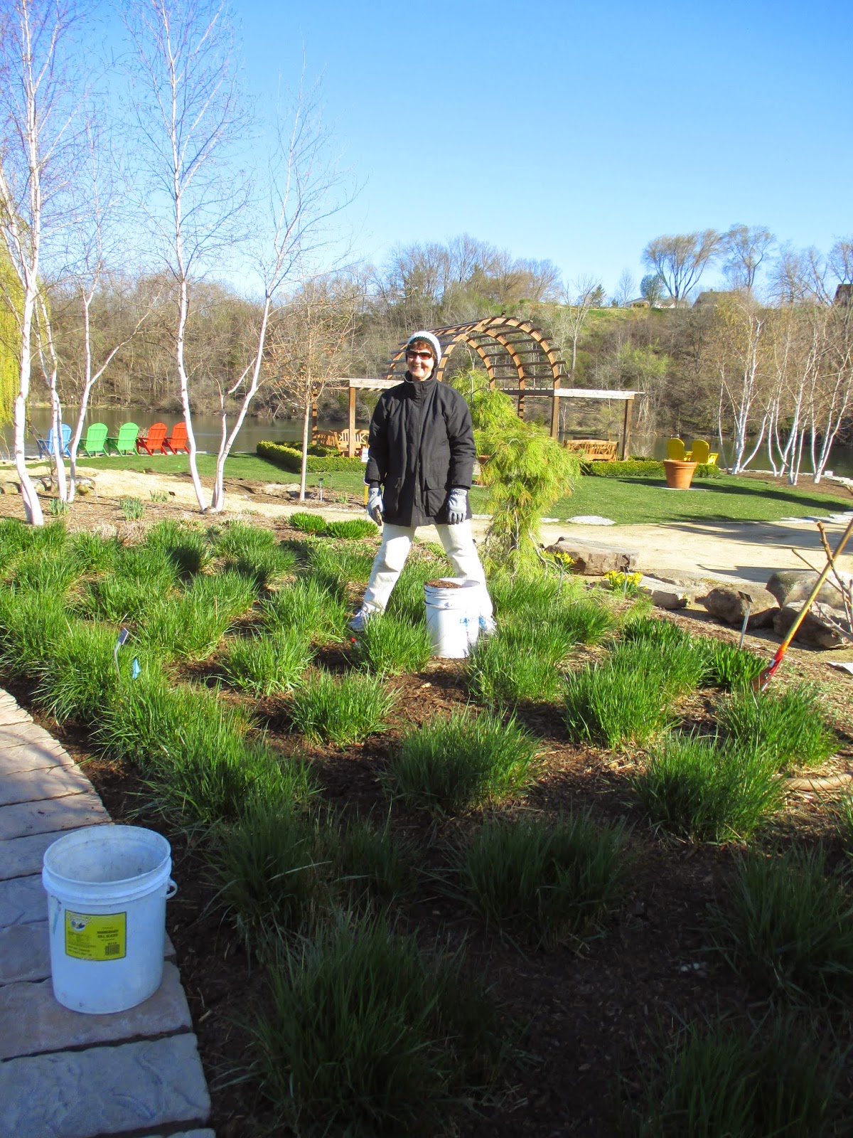 Today was beautiful with sunshine, blue skies and a high in the mid 50 degrees F. The wind has died down from the previous two days which were quite breezy. It was brisk and refreshing outside and our grounds staff and volunteers took full advantage of this gardening opportunity. Next week looks warmer thankfully. Above is a nice shot of the arched bridge in the distance although I challenge you to find Marsha M. in this photo too as she had her camera in hand as well. We had a great crew of volunteers today and saw some visitors enjoying the gardens as well.