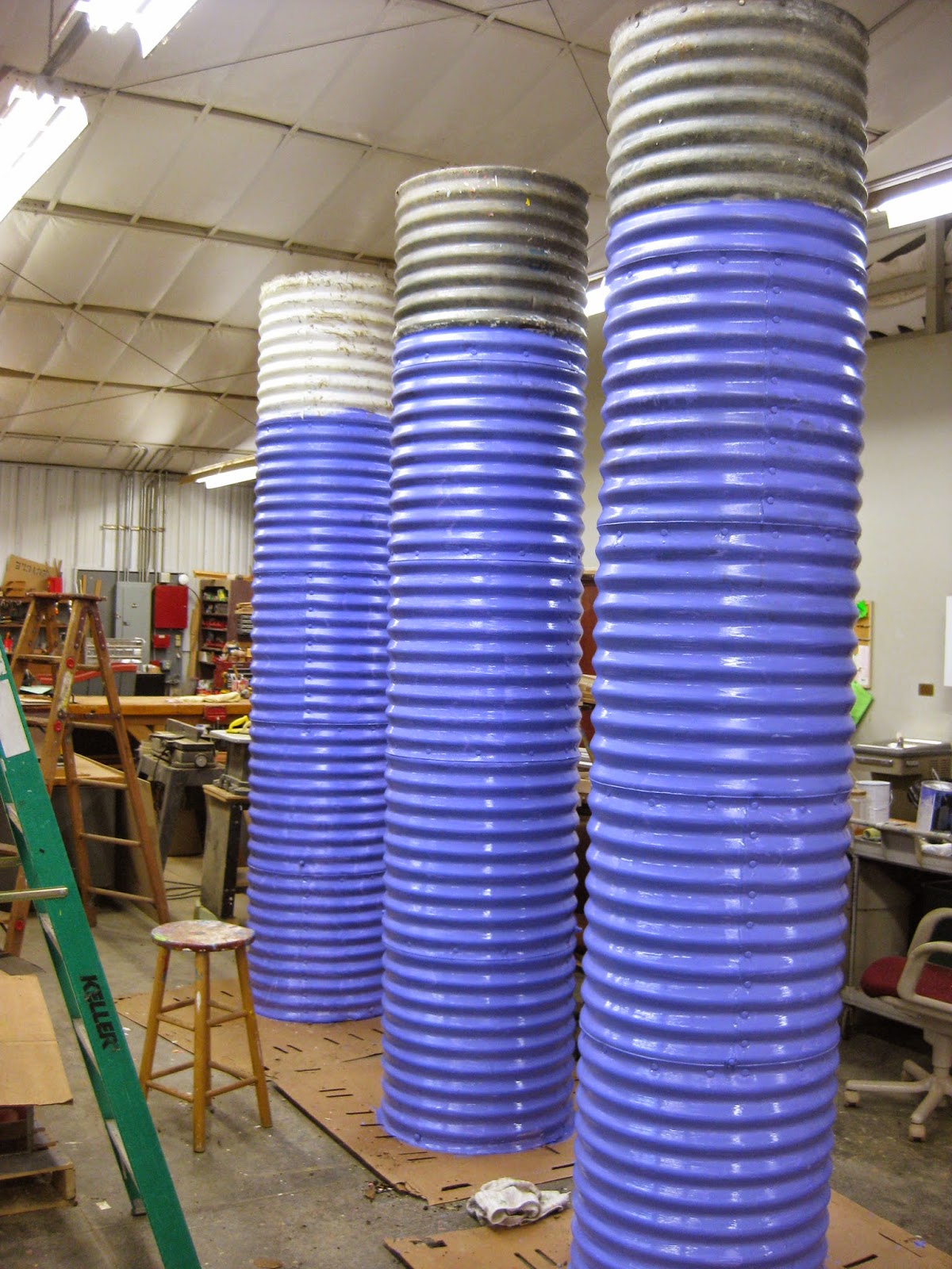 My memory is not what it used to be but I do recalling blogging about our culvert pipe planters in the past. However, this “revisit” of the topic showcases some more recent uses (and photos) of these “industrial style”, vertical planting opportunities. It’s important to mention that our reason for using this was not only to showcase plants growing out of them but to feature the culvert pipes themselves. You’ll see some fun color utilized each year and we move them to different locations annually (and sometimes skip a year of use too!). Securing the pipes in an upright fashion simply involves digging a 3′ deep hole slightly larger than the diameter of the pipe and tamping the soil around the pipe once it’s placed and leveled. We don’t fill these entire culverts with soil. We have installed rebar rod across the opening at about 3′ from the top of the pipe. That “X” of support allows us to insert garbage cans or other containers in to the culvert pipe. These “inserts” have their own drainage and soil preparations so are essentially containers secured within in a culvert pipe container. Access to watering can be tricky so keep that in mind with placement but the vertical contribution is quite strong with these. We have six 18″ diameter culvert pipes (seen below) which are about 9′ tall (3′ underground and 6′ above…) and also five 24″ diameter culvert pipes which are about 12′ tall (3′ underground and 9′ above…). They have been fun to work with and we enjoy using them out in the gardens. They’ll have a long future here for sure!