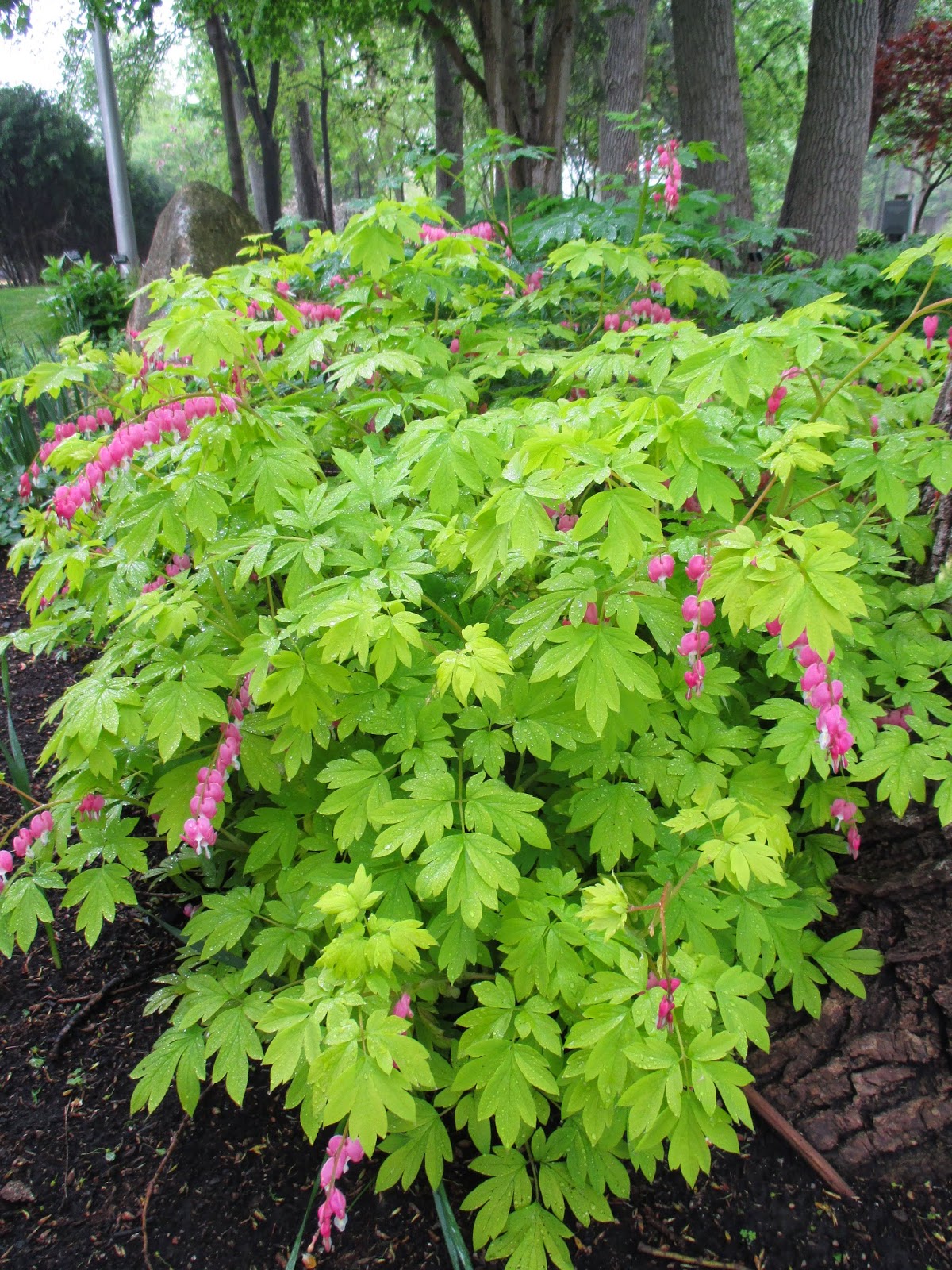 We had a nice volunteer turnout today. Above is the ‘Gold Heart’ golden bleeding heart (Dicentra spectabilis) at peak. Bill O. came in for some mowing and Vern was in for carpentry projects. We saw Bob K. and his wife as well as Elsa, Russ, Lois, Mary Kay T. and many others. Kathy and Eva did a dynamite job weeding in the woodland walk garden and sunken garden. Kay tidied up her portion of the shade garden and did some planting as well.