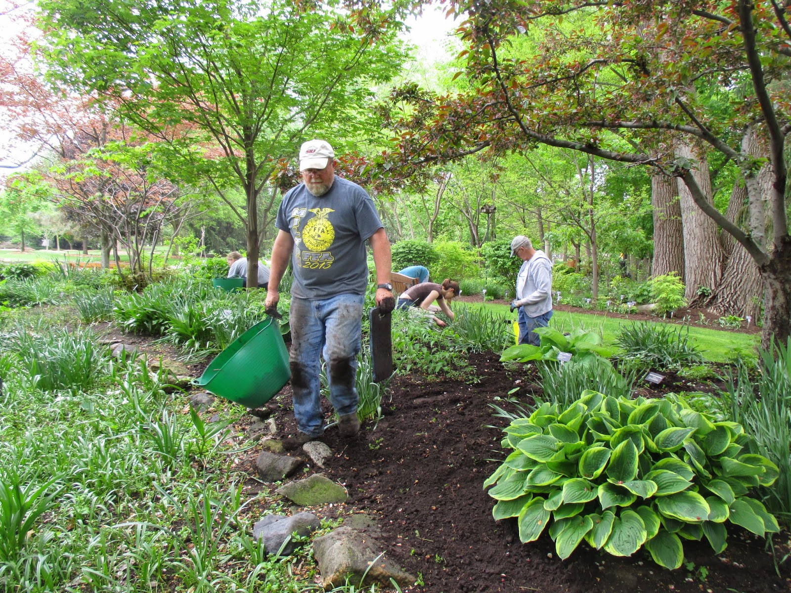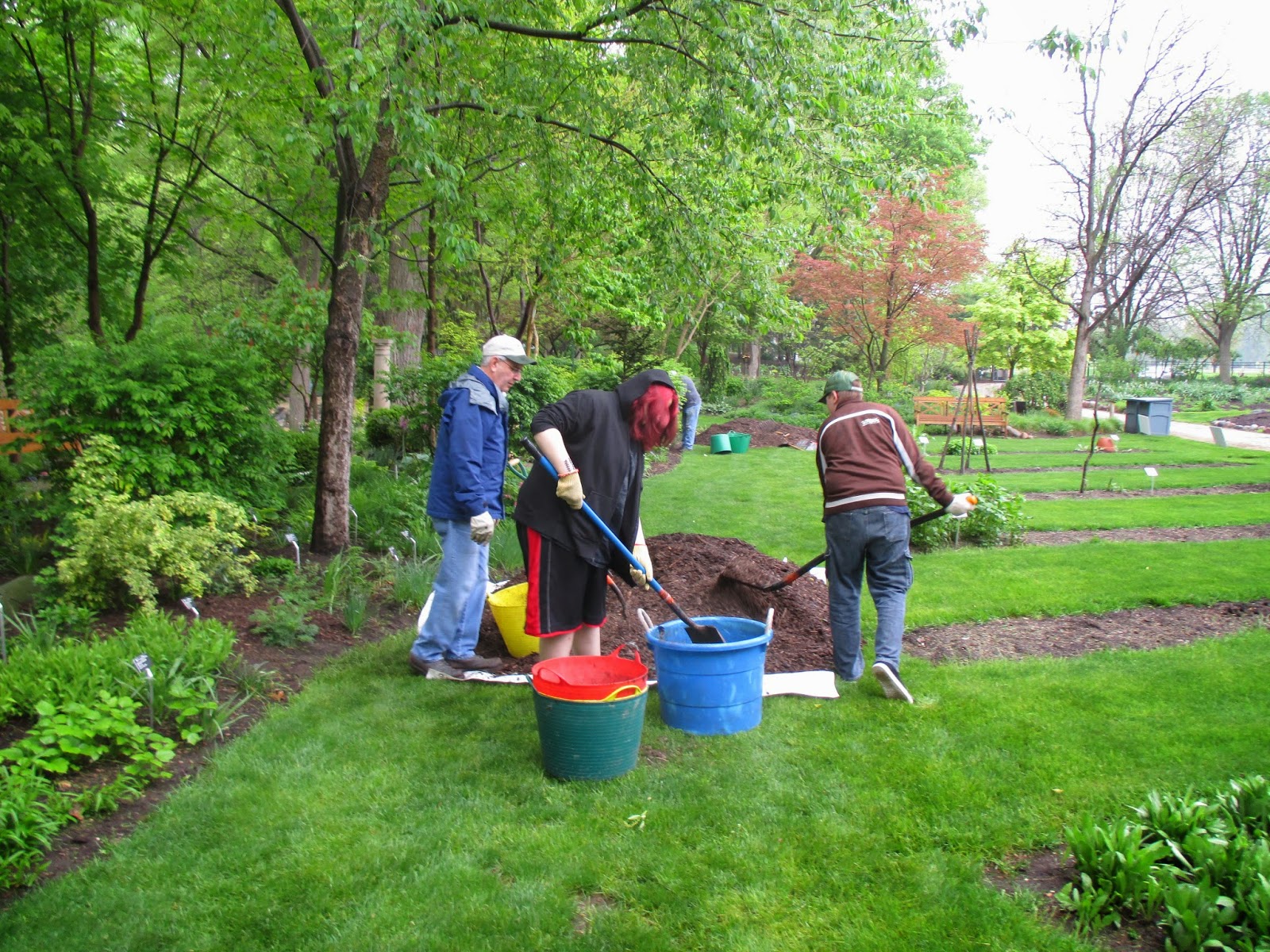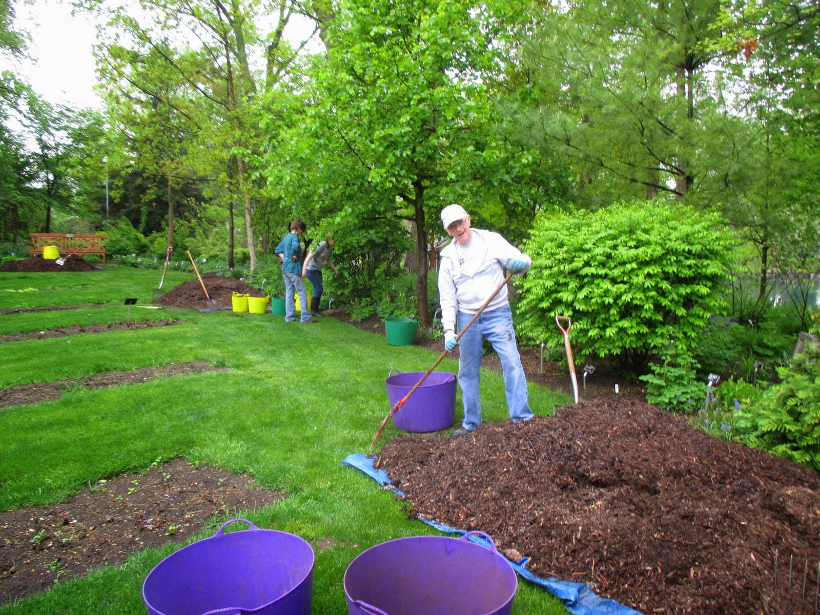 The first of our five consecutive Volunteer Workdays went well today despite the danger of rain all morning. With lots of mulch (see above with Gary) staged and plants placed for installation yesterday, I was worried we would have a “rain out” today. I became even more worried when a light drizzle appeared right at our starting time of 8 am. However, we had a great crew of volunteers appear and not only finished our mulching project but our planting project and lots of additional weeding. Thanks to Gary, Heather, Donna, Barb, Jim, Carol, Deb G. and her three grandkids, Andrea, Becky, Peg, Chuck, Hal, Doris, Bill O., Alan M. and Sandi. Big John and Larry were helpful with facilitating the day and they both other duties too. Lloyd and El managed the compost sale which went smoothly with set-up help from Janice. Thanks to Polly for helping too and bringing the donuts! Some of the action can be seen today.