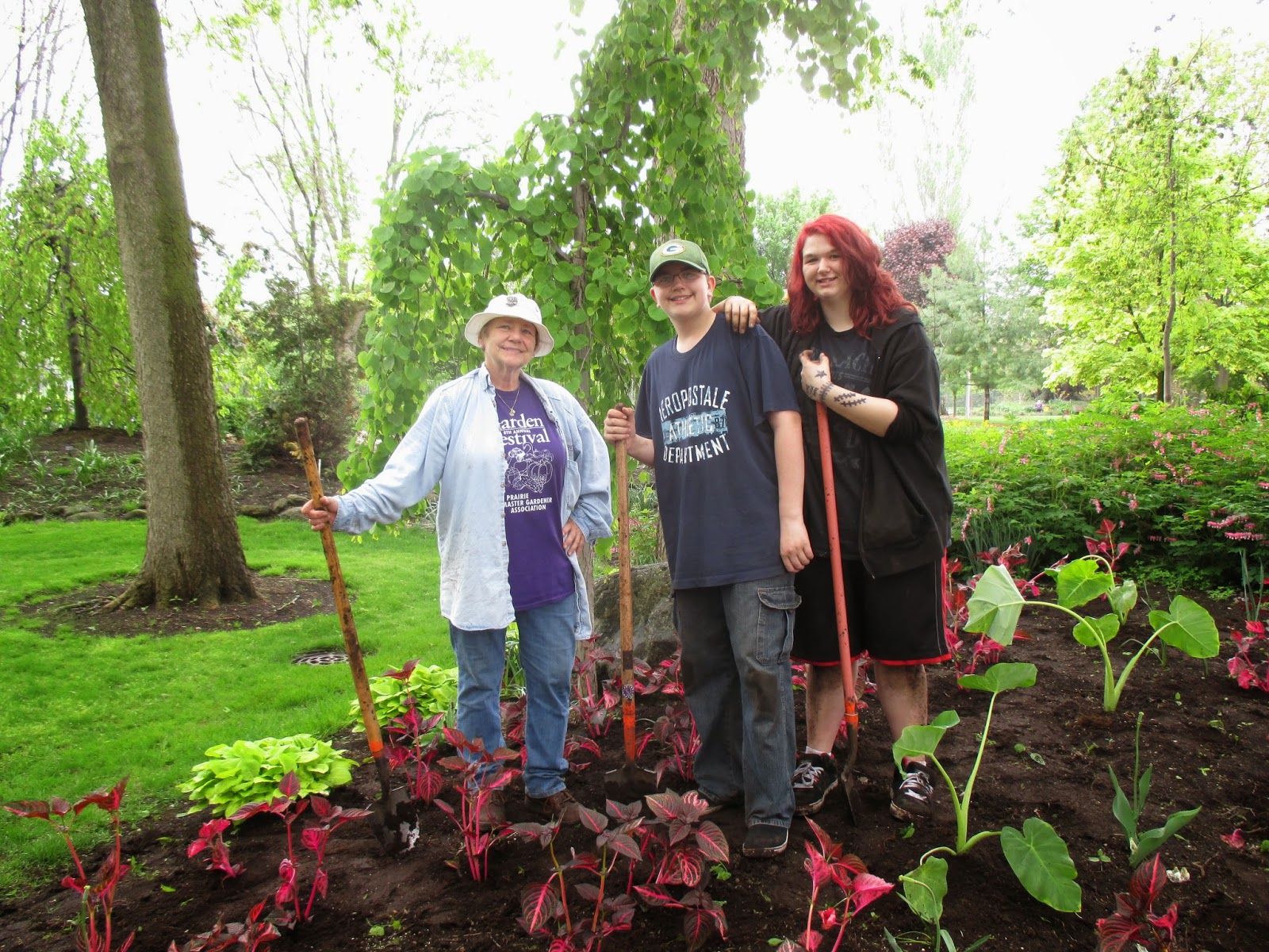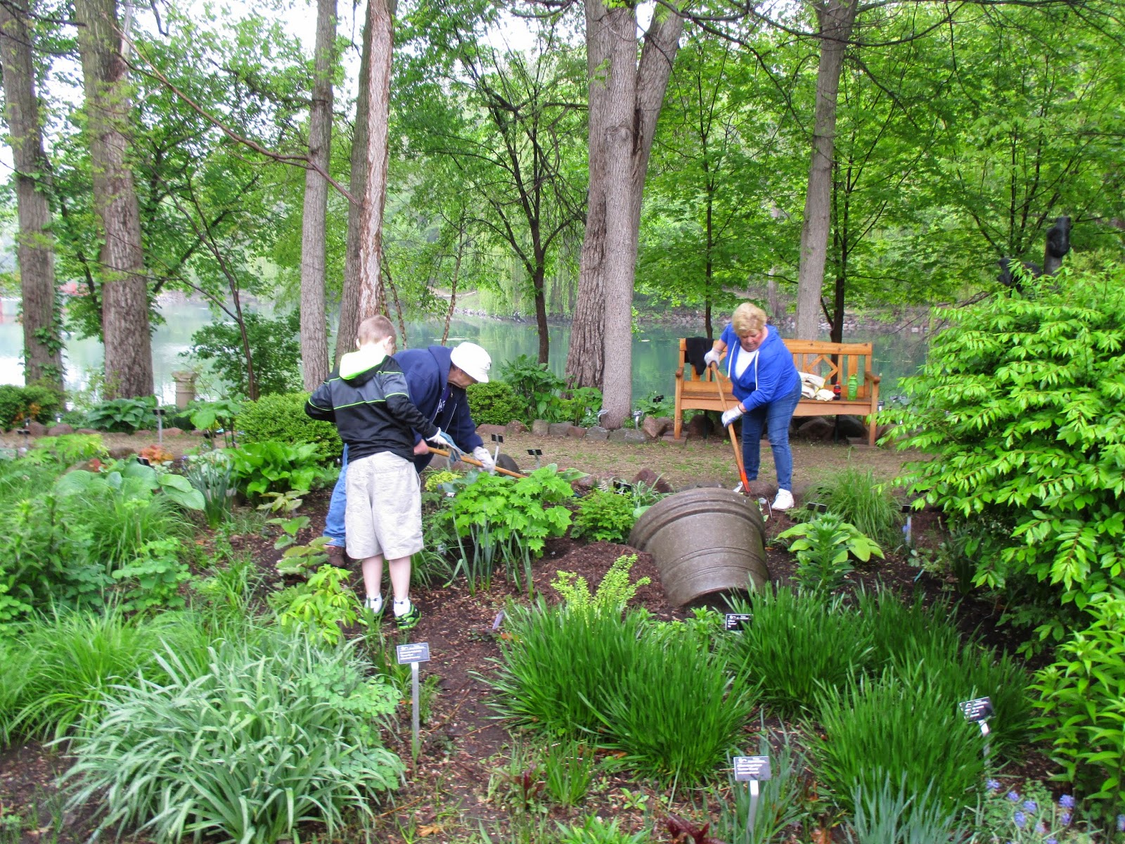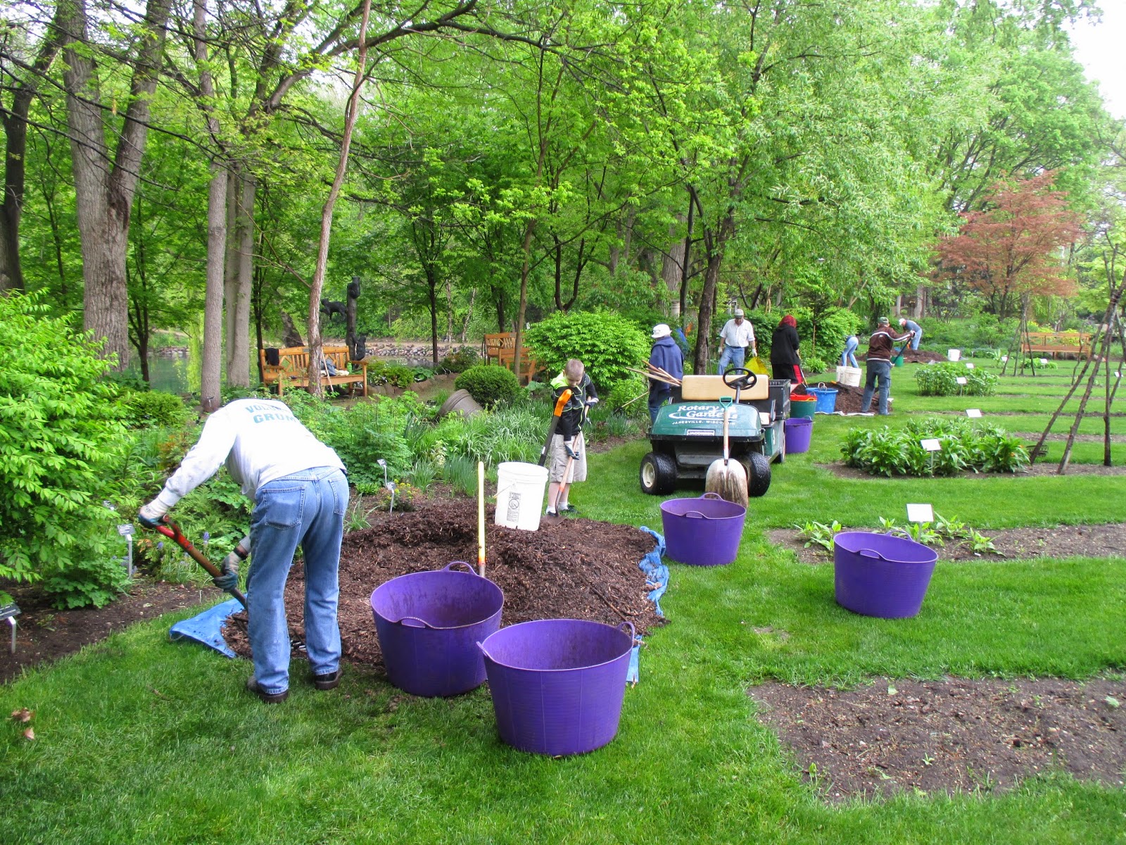 The first of our five consecutive Volunteer Workdays went well today despite the danger of rain all morning. With lots of mulch (see above with Gary) staged and plants placed for installation yesterday, I was worried we would have a “rain out” today. I became even more worried when a light drizzle appeared right at our starting time of 8 am. However, we had a great crew of volunteers appear and not only finished our mulching project but our planting project and lots of additional weeding. Thanks to Gary, Heather, Donna, Barb, Jim, Carol, Deb G. and her three grandkids, Andrea, Becky, Peg, Chuck, Hal, Doris, Bill O., Alan M. and Sandi. Big John and Larry were helpful with facilitating the day and they both other duties too. Lloyd and El managed the compost sale which went smoothly with set-up help from Janice. Thanks to Polly for helping too and bringing the donuts! Some of the action can be seen today.