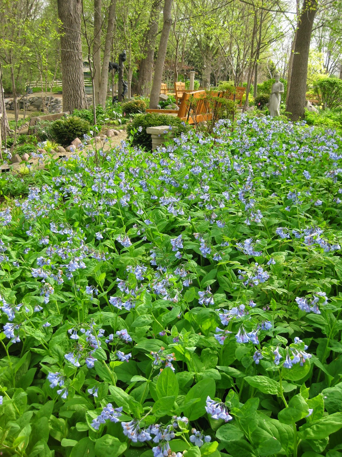 MONDAY BLOG! When I woke up this morning, I realized that I never finished and posted my blog from yesterday (4/20). Sorry for the catch up! The weather is quite a transformation from the 70 degrees F and sunshine we had daily last week and throughout the weekend as we’re now seeing temperatures in the 40s and lots of chilly winds. Morning drizzle on Monday may have kept some of our volunteers away but we still had a very productive day both inside and outside with plenty of accomplishments. I didn’t get much photography done so dedicated this blog to the awesome Virginia bluebells (Mertensia virginica) which are coming up steadily around the gardens and are just barely starting to bloom. This is a popular native, Spring ephemeral and puts on quite a colorful show from the time of emergence with maroon leaves in late March. The foliage turns green followed by brilliant blue flowers opening from pinkish buds to an 18″ tall plant. The entire plant ultimately goes dormant by mid June as the foliage yellows and dries out (or can be cut back at that time). We love our colonies in multiple locations and always enjoy the spring show.
