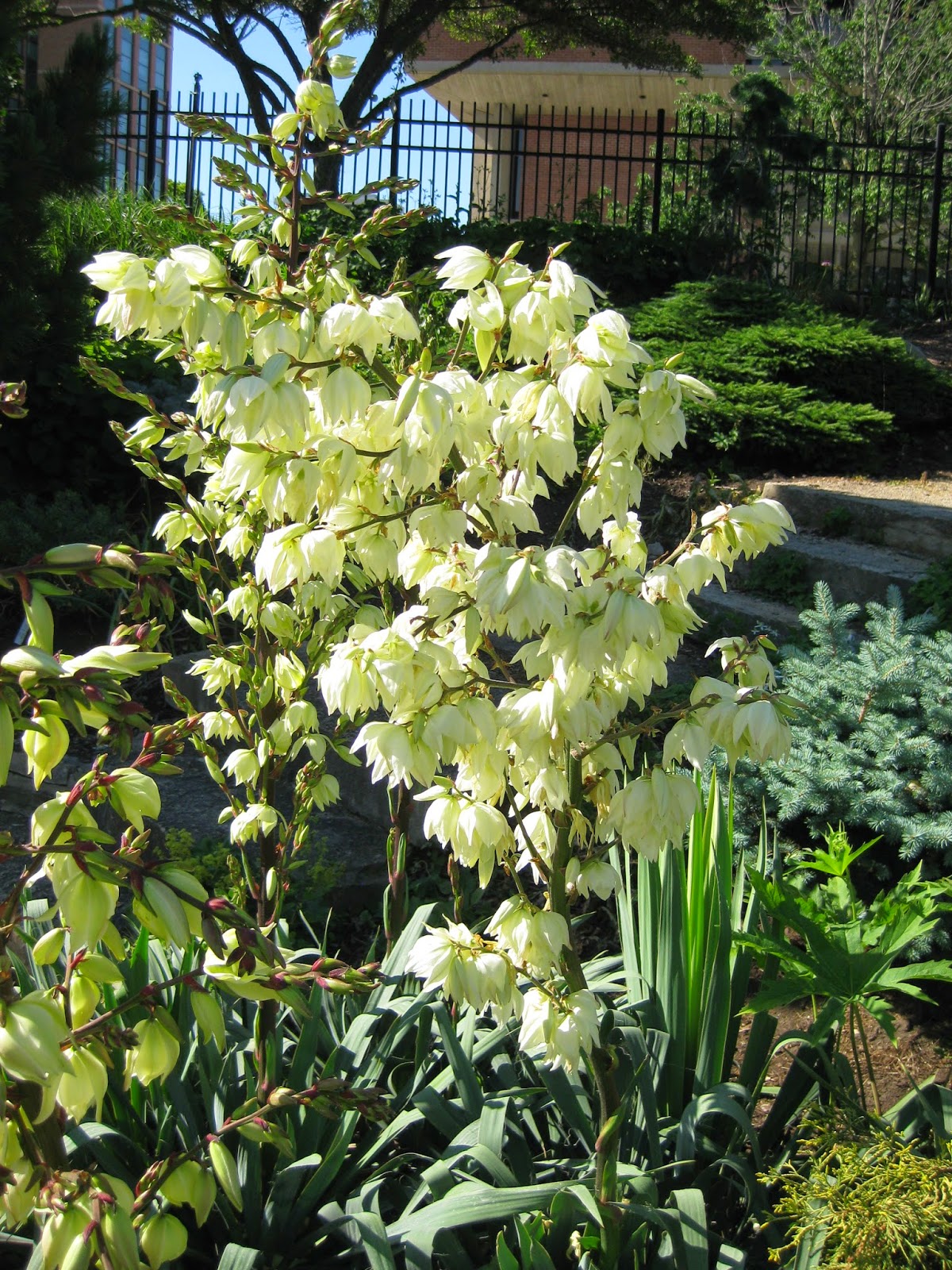 I always been a fan of yuccas and am most familiar with Yucca filamentosa which has a long history in our gardens. While the green form has that nice rigid structure, called the “Southwest Look”, I prefer the variegated forms (like ‘Golden Sword’ above) for their contribution of color 365 days per year. Native to the Southeast United States, this broad-leaved, evergreen shrub (technically not a perennial) is also called Adam’s needle, Spanish bayonet and needle palm among other terms. Yuccas are very drought tolerant and while they prefer full sun, they’ll take part sun and do well. They don’t bloom every year but when they do (see below), the huge, dangling white blossoms are on 3′-8′ stems hovering over the plant. They are notoriously hard to relocate and eliminate from the garden as they have quite a root system. We tried to remove some of the green leaf forms years ago and they keep sprouting from some remnant of that deep root system! The flowers are gorgeous and I love to see those giant stalks of floating flowers which really glow at dusk as well.